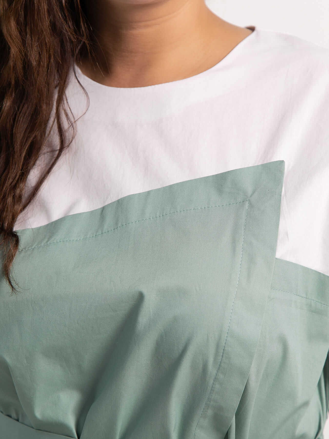 Элегантная блузка, выполненная в двух стильных цветах и с асимметричным низом спереди, станет ярким акцентом в вашем гардеробе. Округлая горловина и укороченные рукава-фонарики придают ей романтичный и современный вид. Застежка на пуговку по спинке добавляет удобства при надевании. В комплекте идет пояс, который поможет подчеркнуть талию и создать завершенный образ.