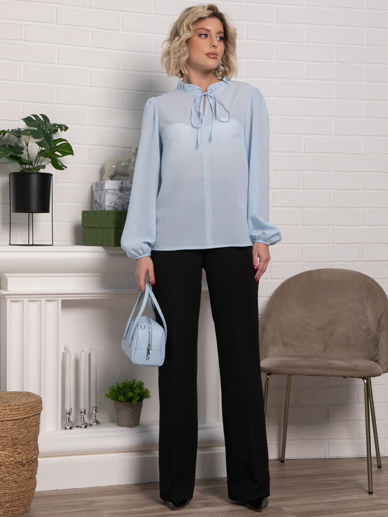 Стильная блузка с завязкой у горловины — элегантный акцент в вашем образе. Модель выполнена в прямом крое с рукавами полной длины, что обеспечивает комфорт. Сборка по окату рукава придает изящность, а низ, собранный на резинку, создает аккуратный силуэт. Горловина украшена рюшей, которая плавно переходит в завязку, подчеркивая женственность и утонченность. Эта блузка отлично сочетается с брюками, юбками, жилетами и пиджаками, становясь универсальной основой для для любого стиля.