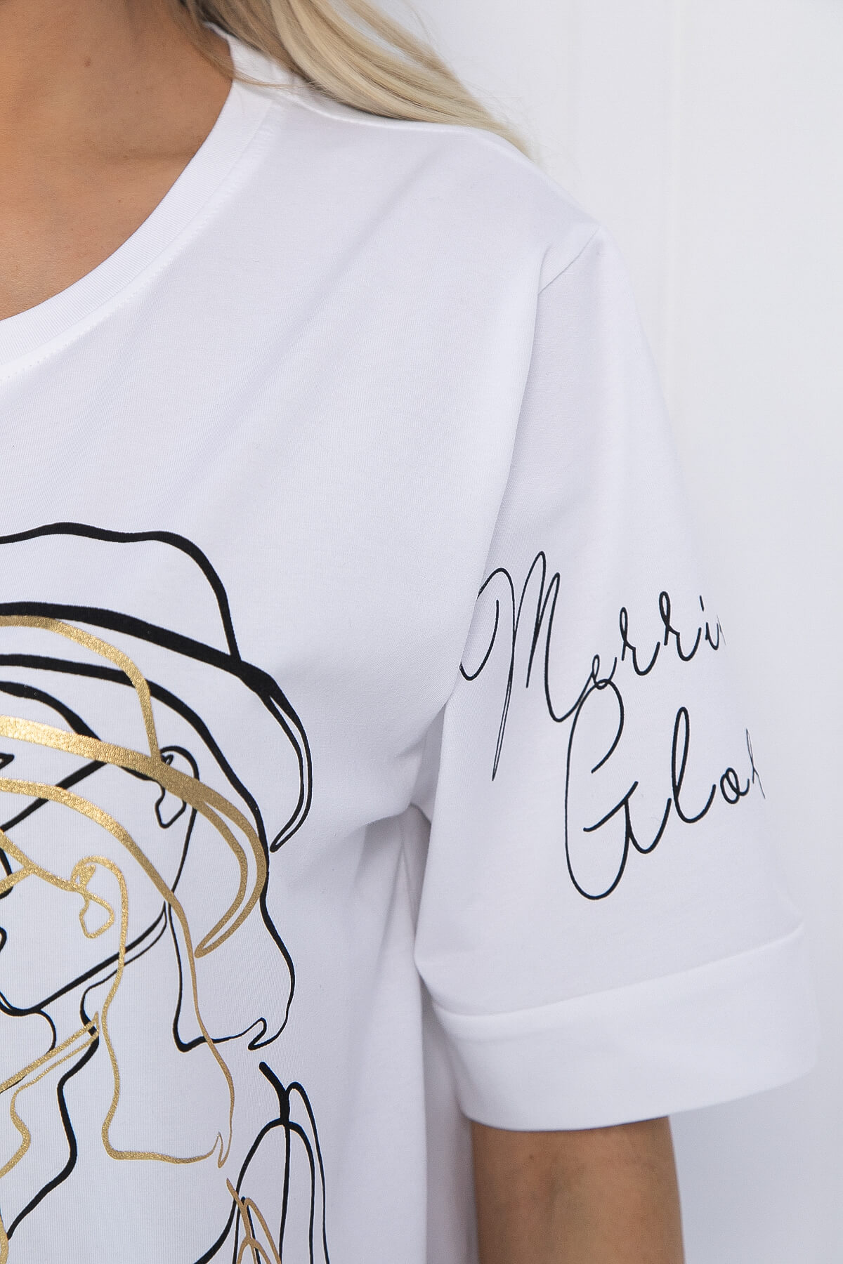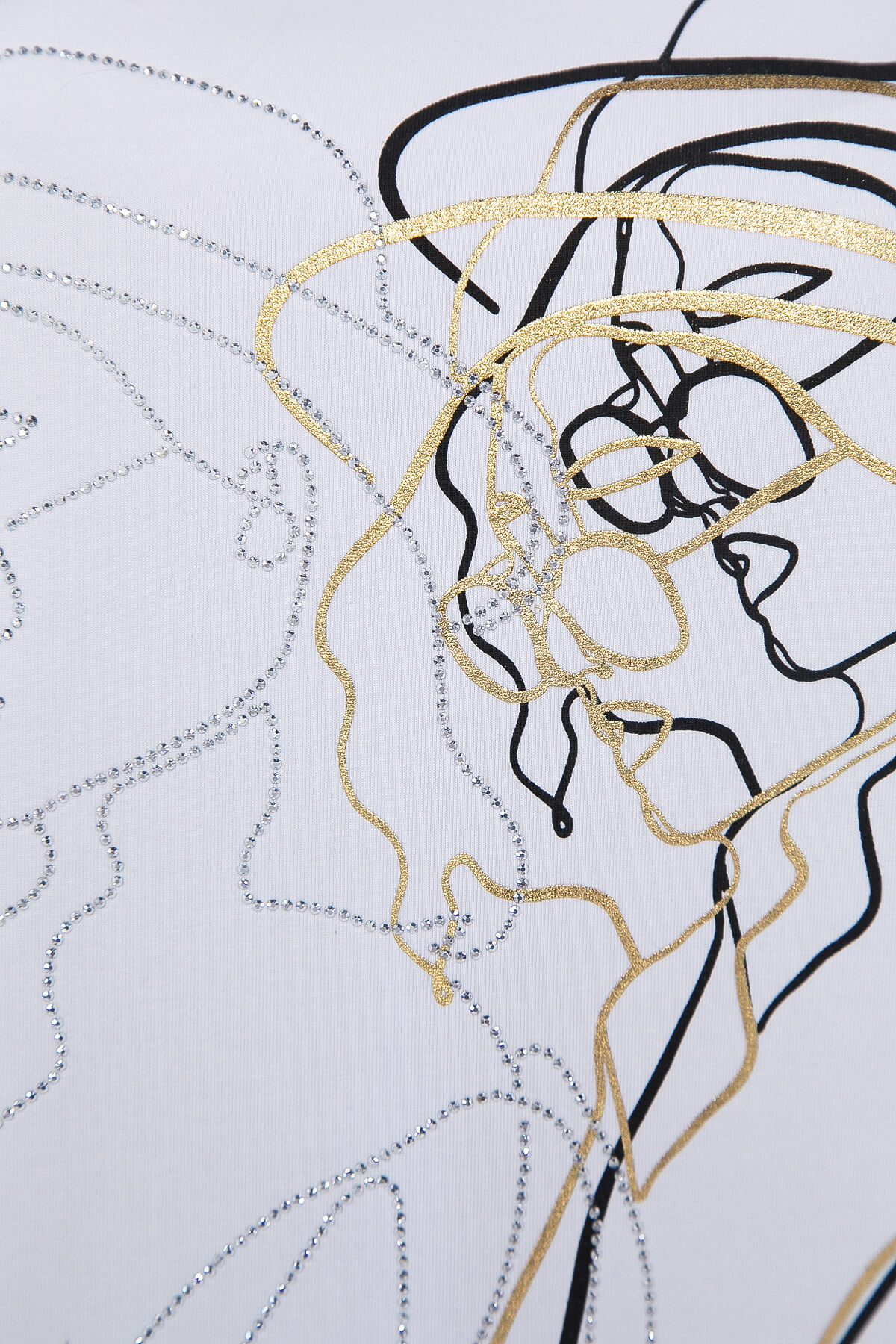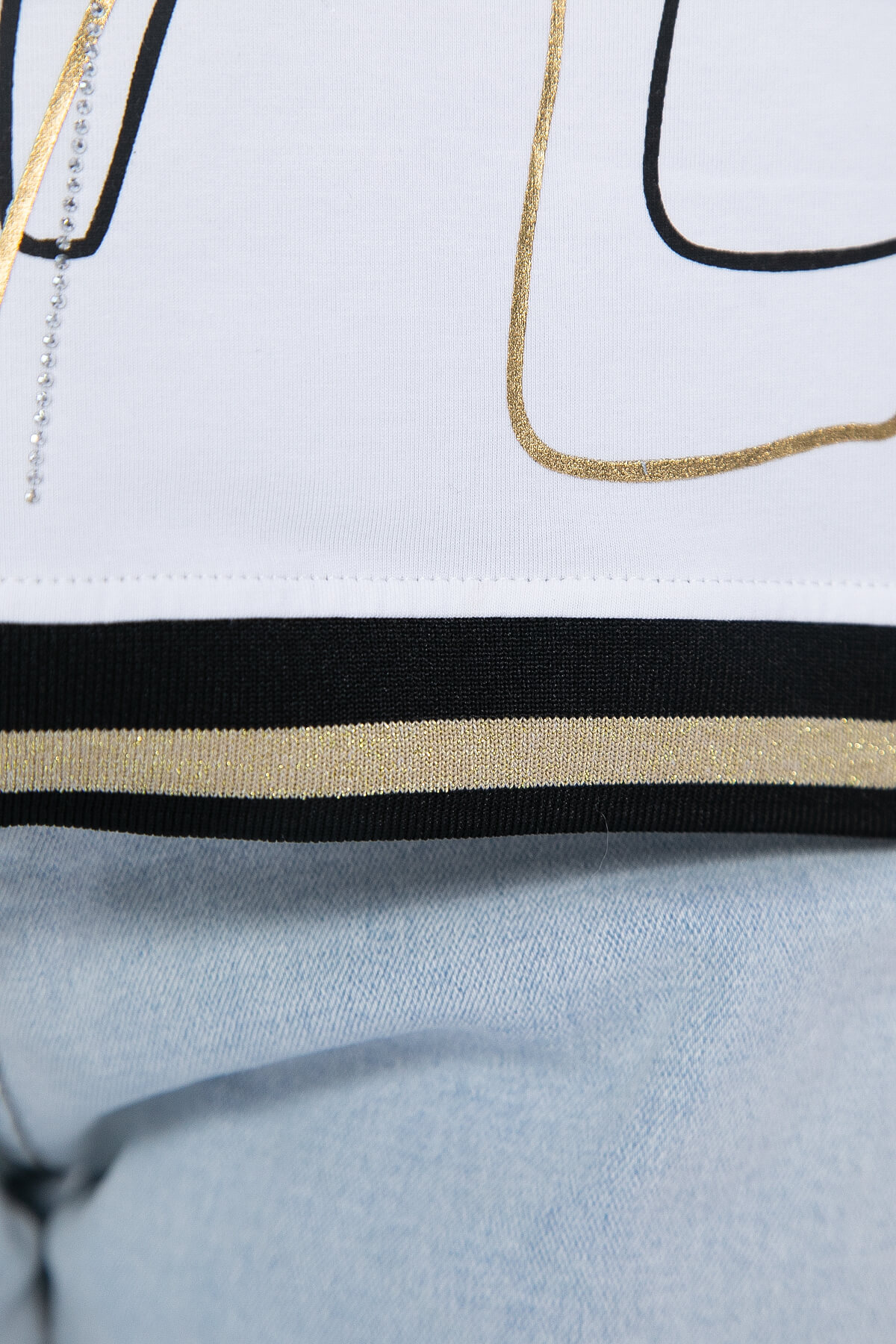 Белая блузка — это прекрасное дополнение к вашему гардеробу, которое поможет создать стильный и модный образ. Она выполнена из натуральной ткани, что обеспечивает комфорт и удобство в носке. Блузка украшена уникальным абстрактным рисунком и стразами, которые придают ей изюминку. Декоративная резинка на передней части подчеркивает фигуру и создает эффектный силуэт.