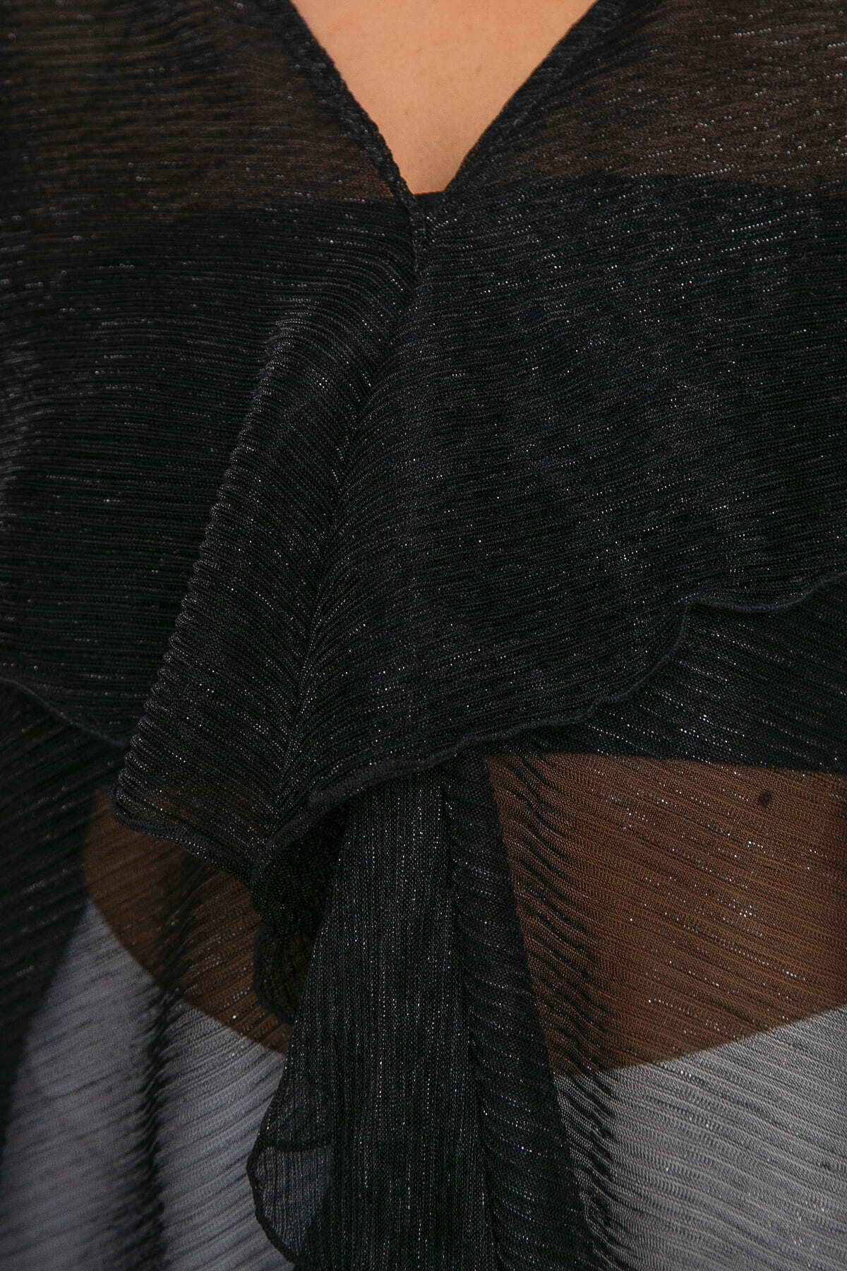 Романтичная блузка из сетки с люрексом станет идеальным выбором как для торжественных мероприятий, так и для повседневного стиля. Длинные рукава с манжетами на резинке и воланами придают образу элегантность, а V-образный вырез добавляет нотку утонченности. Воланы по рукавам и передней части модели делают блузку особенно женственной и изящной. Комбинируйте ее с джинсами, брюками или юбкой-карандаш для создания делового образа в офисе или нарядного ансамбля для особых случаев.