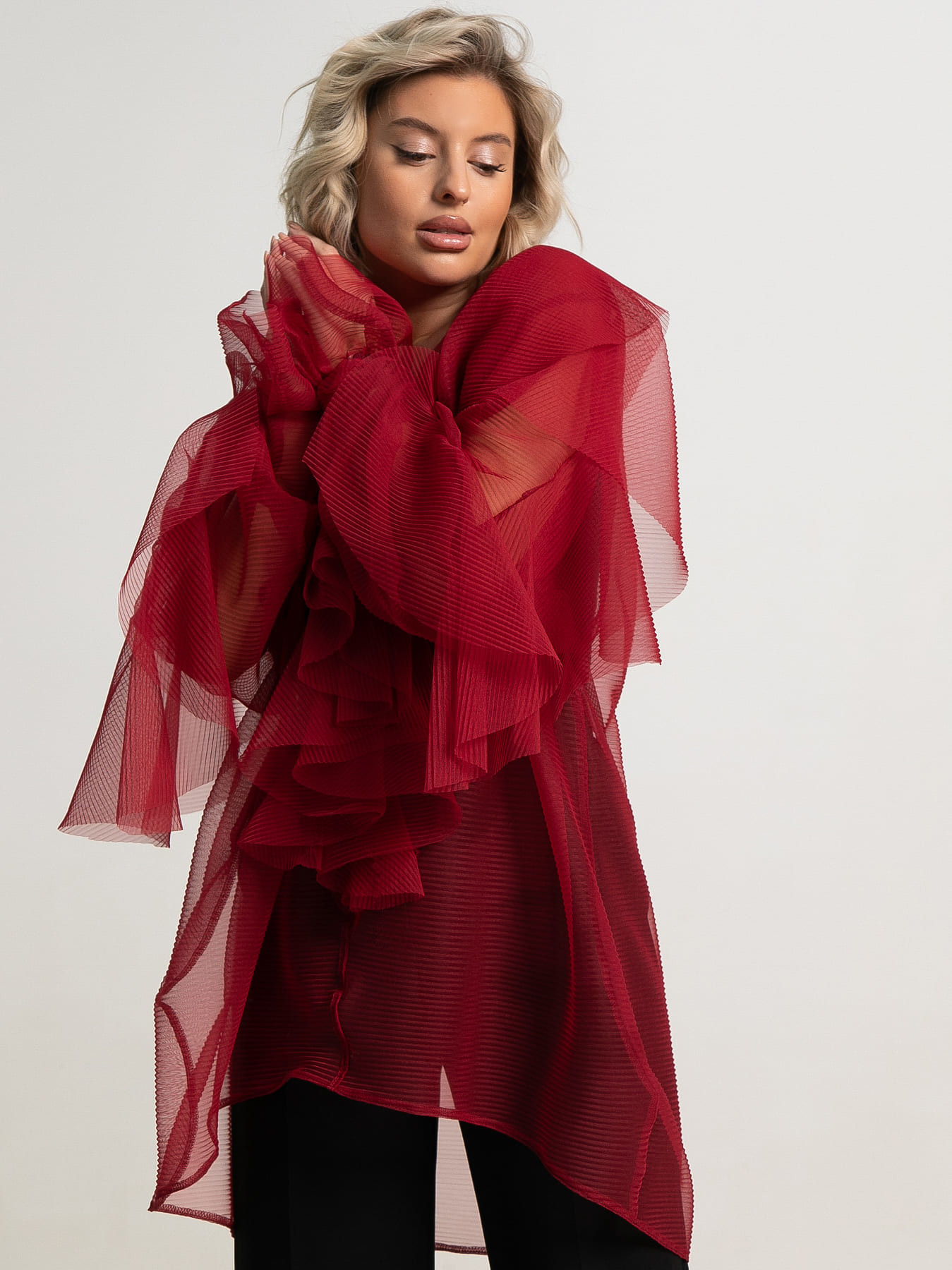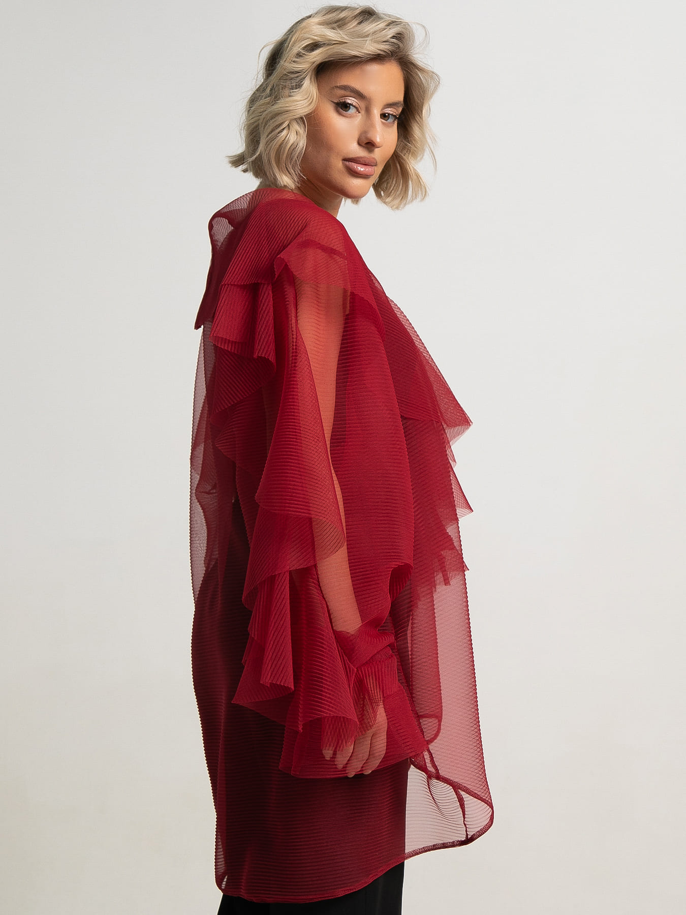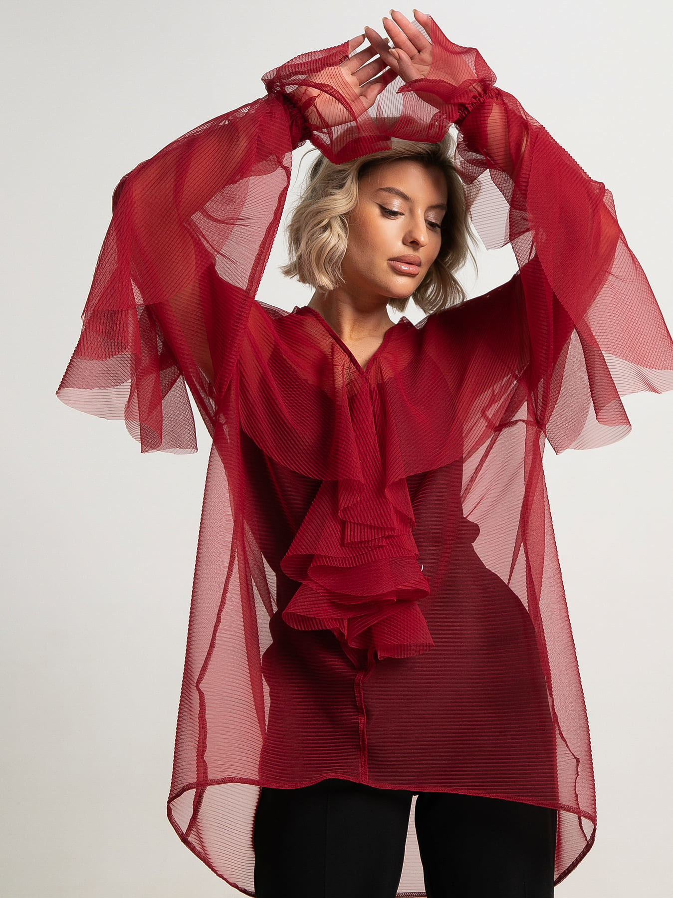 Романтичная блузка из сетки станет идеальным выбором как для торжественных мероприятий, так и для повседневного стиля. Длинные рукава с манжетами на резинке и воланами придают образу элегантность, а V-образный вырез добавляет нотку утонченности. Воланы по рукавам и передней части модели делают блузку особенно женственной и изящной. Комбинируйте ее с джинсами, брюками или юбкой-карандаш для создания делового образа в офисе или нарядного ансамбля для особых случаев.