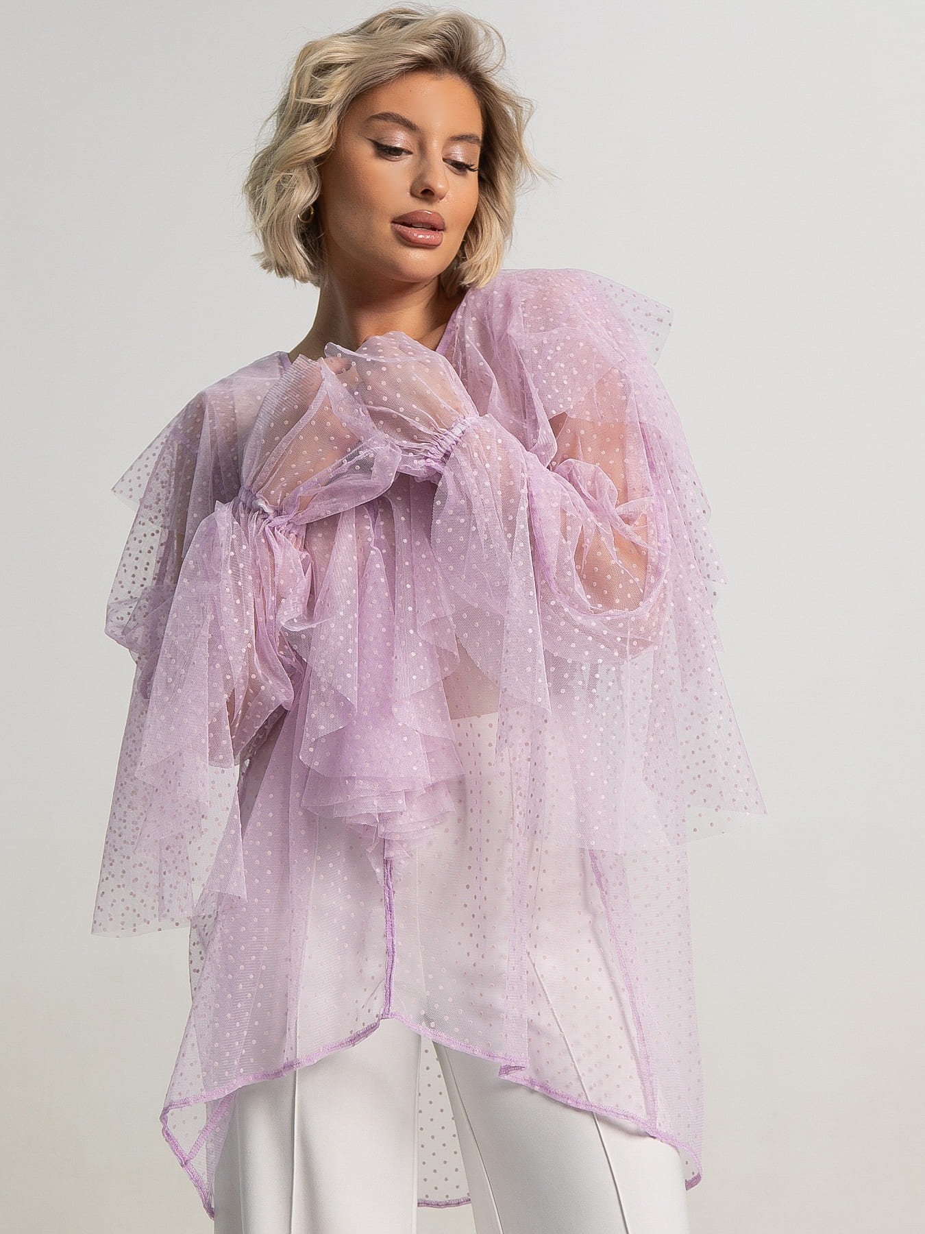 Романтичная блузка из сетки станет идеальным выбором как для торжественных мероприятий, так и для повседневного стиля. Длинные рукава с манжетами на резинке и воланами придают образу элегантность, а V-образный вырез добавляет нотку утонченности. Воланы по рукавам и передней части модели делают блузку особенно женственной и изящной. Комбинируйте ее с джинсами, брюками или юбкой-карандаш для создания делового образа в офисе или нарядного ансамбля для особых случаев.