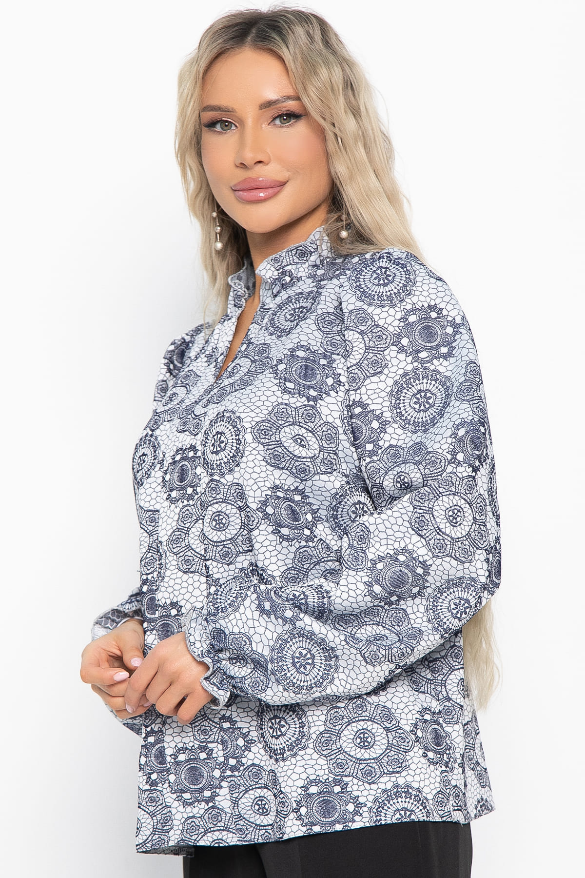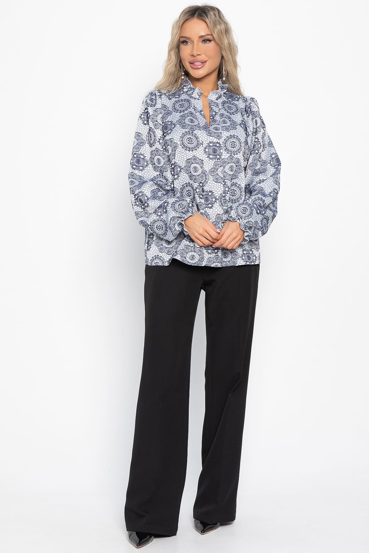 Изящная женская блуза в серо-синем цвете элегантного дизайна станет прекрасным дополнением вашего гардероба. Особое внимание привлекает горловина, обработанная нежной рюшей. Этот элемент добавляет блузе женственности и романтичности, делая образ более утонченным. По переду блузы расположен V-образный вырез, который визуально удлиняет шею и подчеркивает зону декольте. Он плавно переходит в аккуратную планку, добавляя завершенности и изысканности. Создавайте утонченные образы вместе с нашей очаровательной блузой!