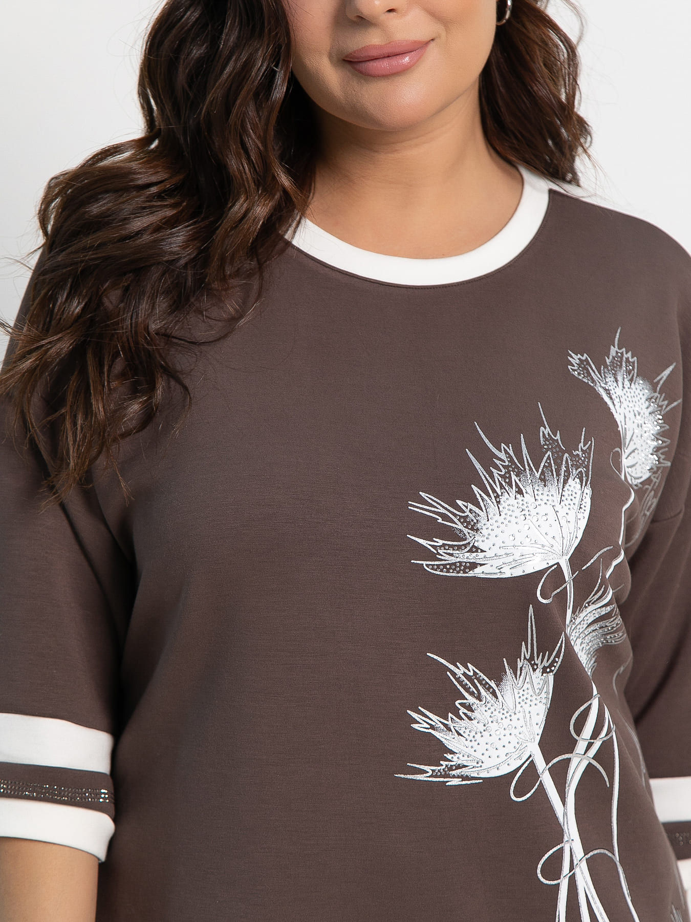 Стильная блузка — must-have для стильных женщин! Она прямого кроя с эффектным дизайном станет идеальным дополнением к любому гардеробу. Шоколадный цвет — универсальный и всегда актуальный, легко сочетается с любыми цветами. Модель со спущенным плечом и округлой горловиной выглядит женственно и легко. Низ рукава украшен элегантными белыми вставками со стразами, а по линии плеча и рукава расположены дополнительные белые элементы, подчеркивающие стиль. Перед кофты украшен яркой печатью со стразами — цветы и надпись делают образ выразительным и индивидуальным. Эту кофту можно носить как с джинсами для повседневного стиля, так и с юбкой для более элегантных сочетаний. Подарите себе комфорт и стиль в любой ситуации!