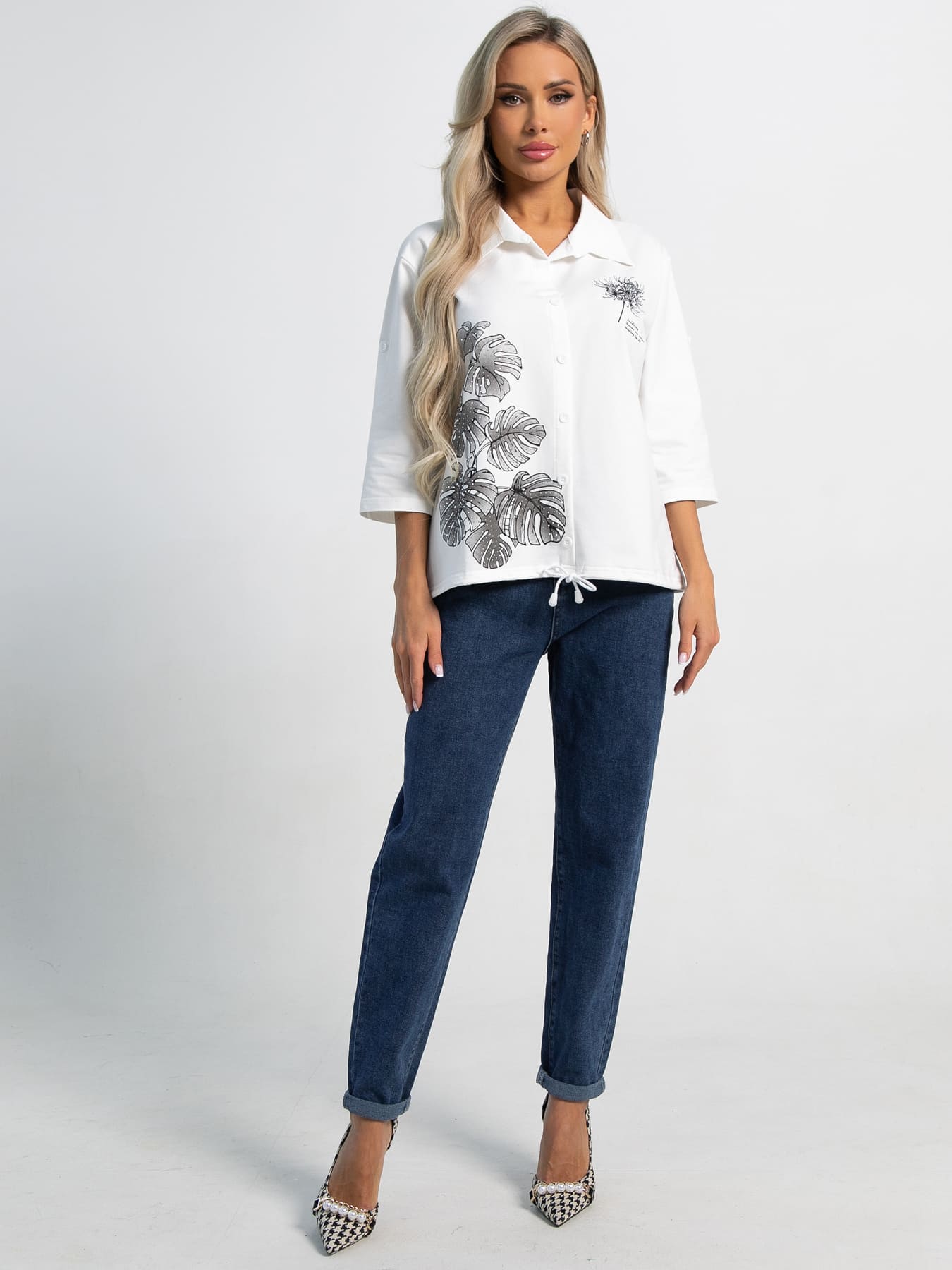 Стильная блуза прямого кроя с втачными рукавами длиной 3/4 — идеальный выбор для повседневного образа. Рукава заканчиваются на пате, придавая изделию изящество. Воротник рубашечного типа с планкой добавляет модели классический и аккуратный вид. Декоративный ряд пуговиц на передней части подчеркивает стиль. Завязка на шнурке на линии низа позволяет регулировать посадку и создавать эффектный силуэт. Эта блуза гармонично сочетается с разными образами, привнося нотки элегантности и комфорта.