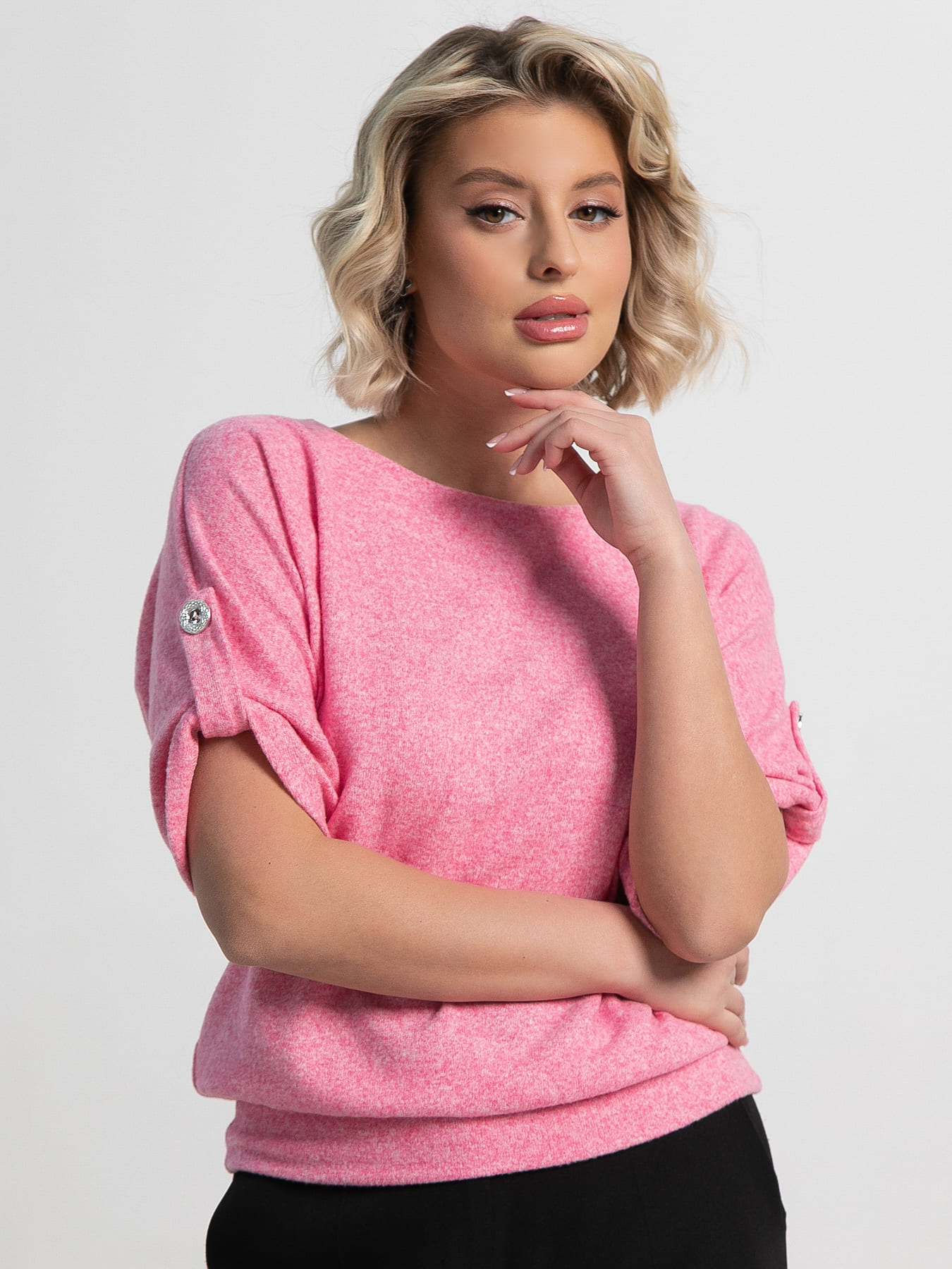Женственная трикотажная блузка с укороченным рукавом — изящная модель, которая добавит любому образу нотки элегантности и стиля. Рукава фасона «летучая мышь» украшены патами с нарядными пуговицами. Универсальный полуприлегающий крой надежно скрывает недостатки в области талии, позволяет чувствовать себя уверенно и неотразимо.