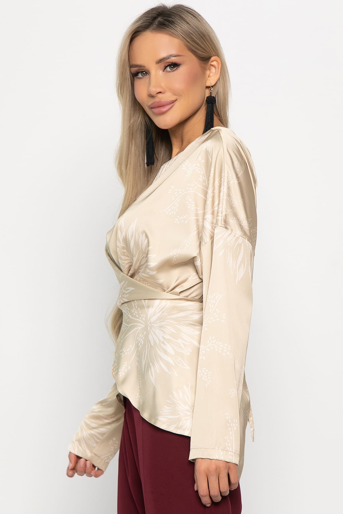 Женская блуза на запах с завязками на талии — стильная и универсальная вещь для любого гардероба. За счет завязок спереди она обеспечивает безупречную приталенную посадку, подчеркивая фигуру. Округлый вырез и спущенный рукав придают блузе легкость и элегантность. Добавьте эту стильную блузу на запах в свой арсенал и наслаждайтесь комфортом и элегантностью каждый день!