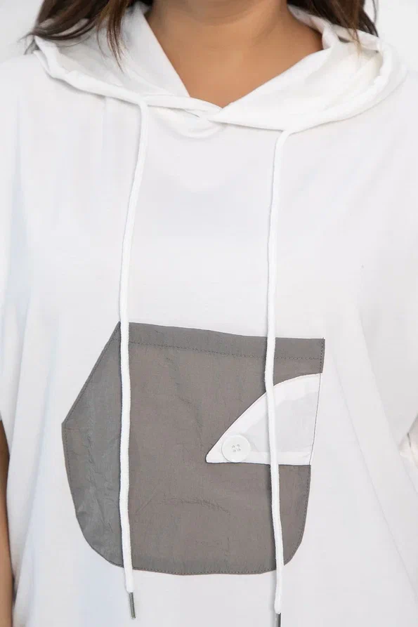 Блуза свободного кроя с капюшоном — это модель, которая сочетает в себе комфорт и практичность. Она станет отличным выбором как для повседневного образа, так и для активного отдыха на природе. Свободный крой и спущенный рукав придают образу непринуждённый и свободный вид. Функциональный карман по переду украшен пуговицей, что придает образу оригинальности.