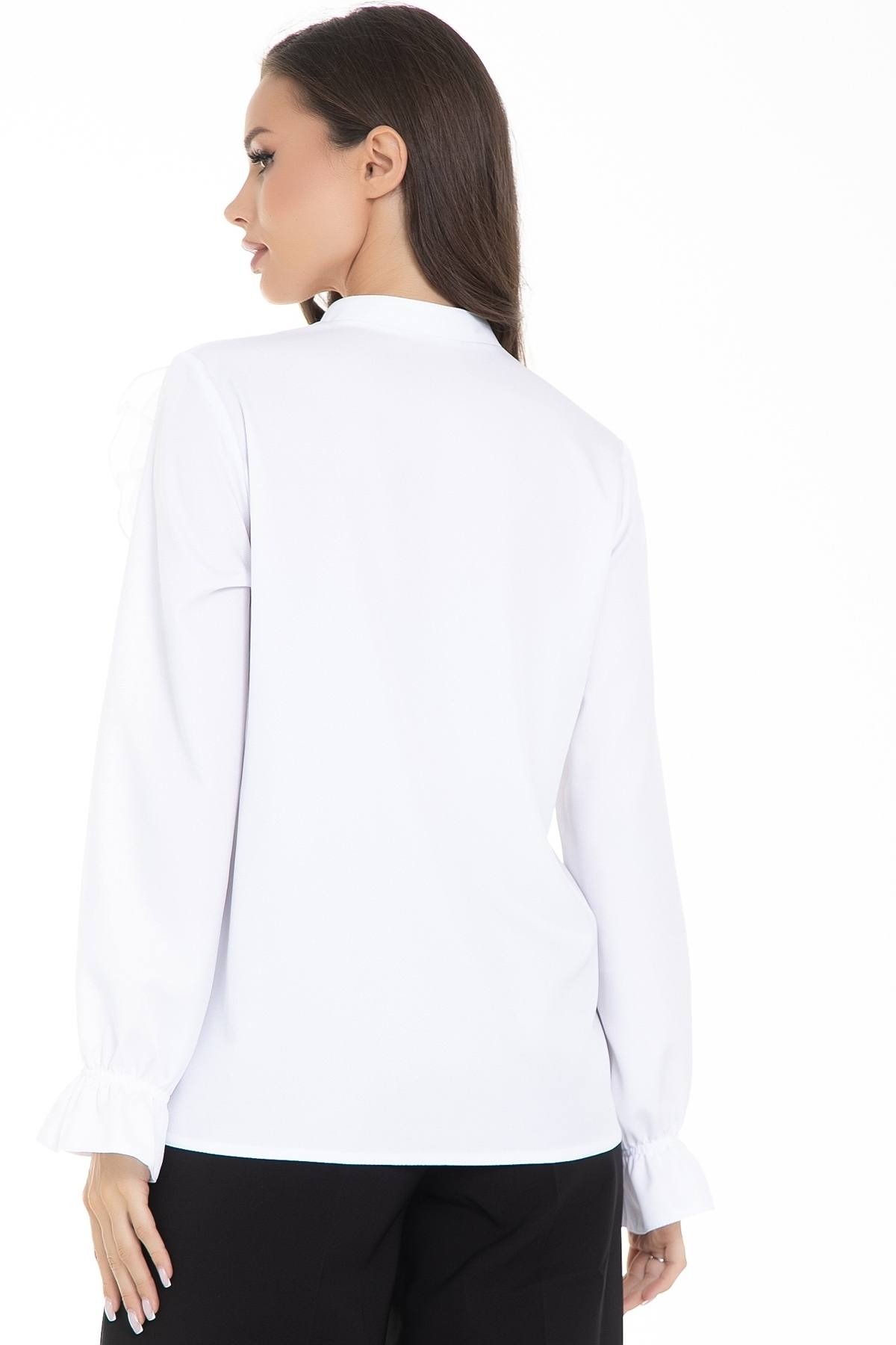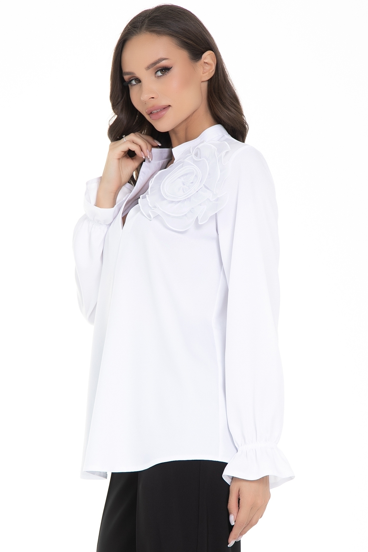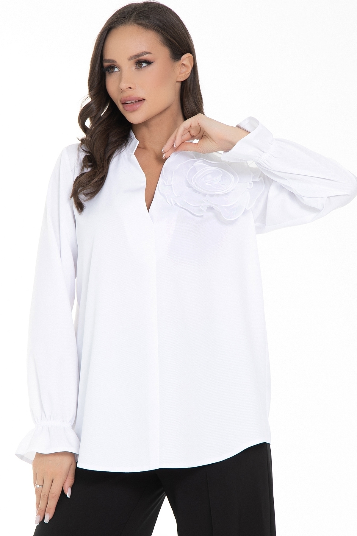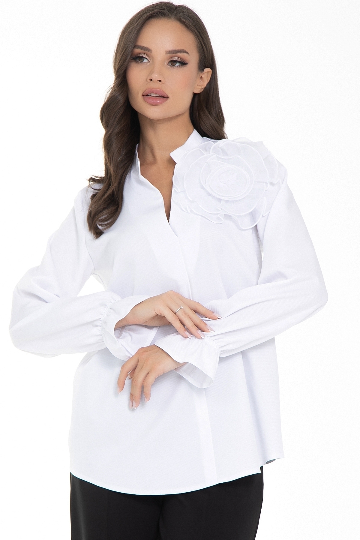 Хит сезона! Необыкновенно красивая и элегантная блуза с изысканным декором- само воплощение женственности. Белая блузка с изящным цветком из органзы, идеально впишется в любой гардероб: для создания делового образа, повседневного или праздничного. Можно носить как с классическими брюками и юбками, так и с джинсами или под сарафан. Прекрасно смотрится как в заправленном состоянии, так и на выпуск. Ткань мягкая с вискозой, практически не мнется, обладает износостойкостью, обеспечивает идеальный комфорт. Блузка продуманного и универсального фасона, идеально подходящего под любой низ. Воротник стойка, рукав длинный, на резинке с красивой рюшей по низу