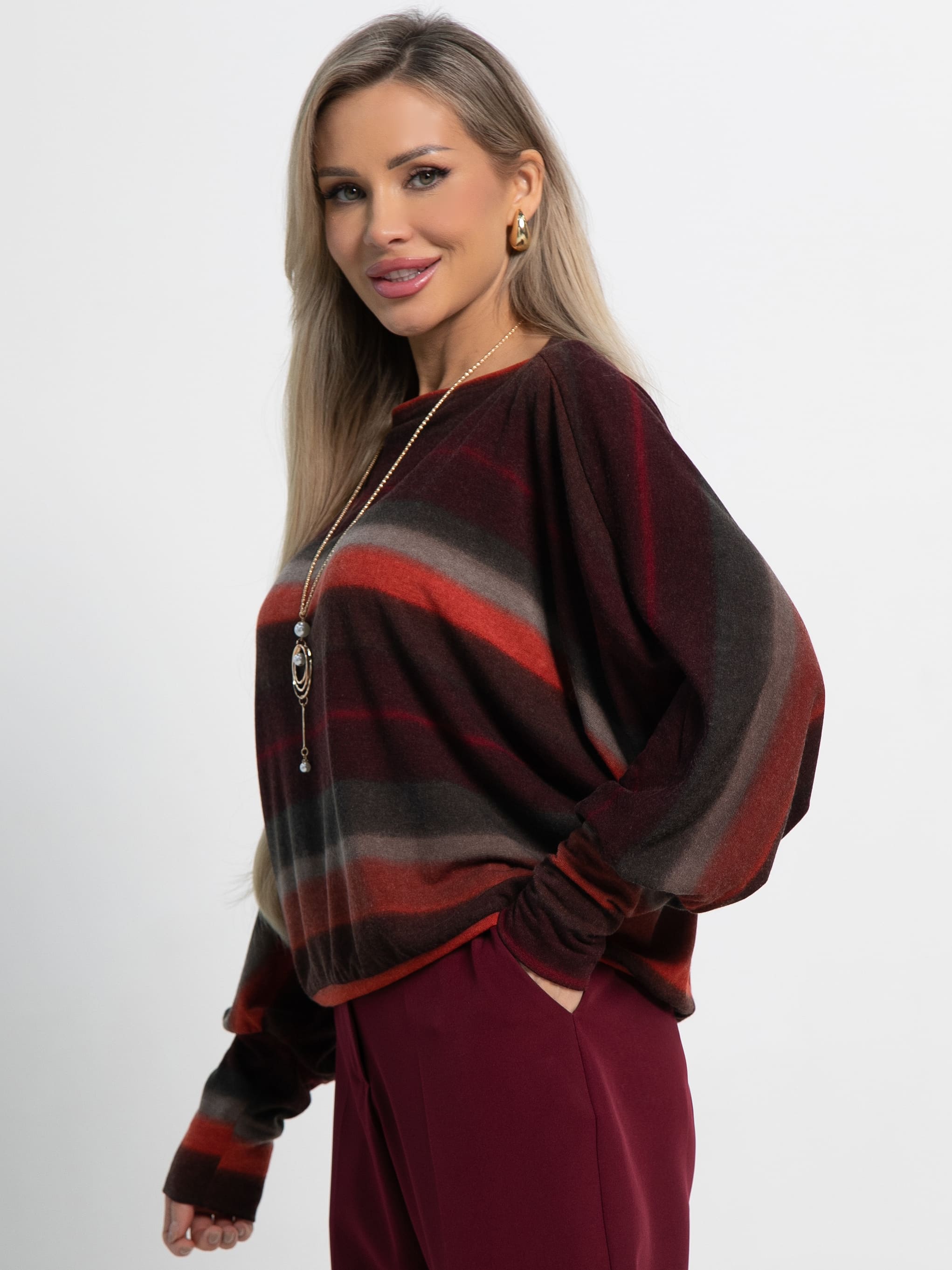 Великолепная трикотажная блуза в бордово-оранжевой расцветке сочетает в себе комфорт и утонченность. Овальный вырез горловины и цельнокроеные рукава «летучая мышь» придают ей уникальный вид. Высокий манжет по низу рукавов добавляет изысканности. Эта блуза отлично сочетается с юбками, брюками и джинсами любого фасона, создавая разнообразные модные образы. В комплекте идет подвеска, которая станет ярким акцентом и подчеркнет вашу индивидуальность.