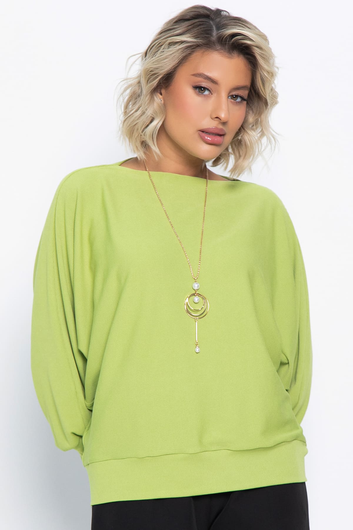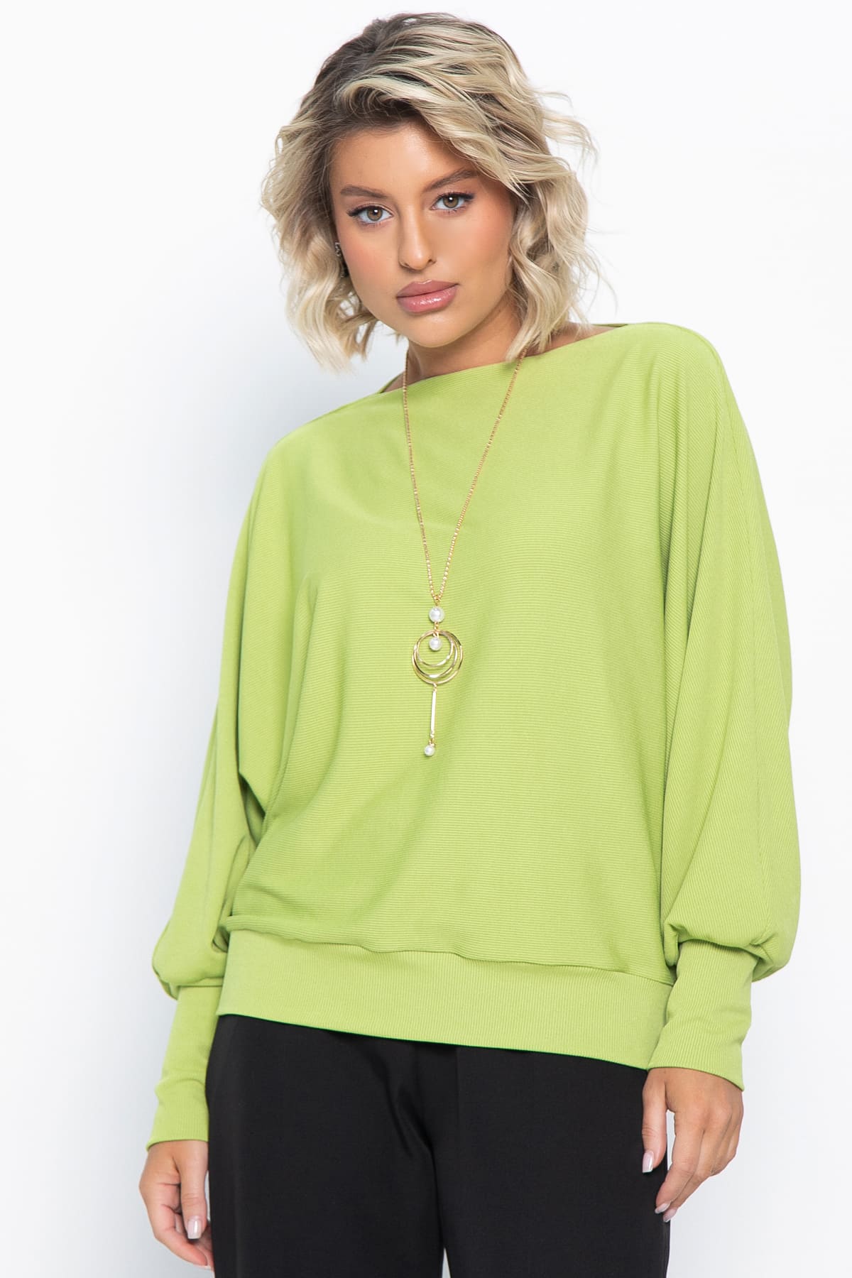 Великолепная трикотажная блуза в цвете «зеленое яблоко» сочетает в себе комфорт и утонченность. Овальный вырез горловины и цельнокроеные рукава «летучая мышь» придают ей уникальный вид. Высокий манжет по низу рукавов добавляет изысканности. Эта блуза отлично сочетается с юбками, брюками и джинсами любого фасона, создавая разнообразные модные образы. В комплекте идет подвеска, которая станет ярким акцентом и подчеркнет вашу индивидуальность.