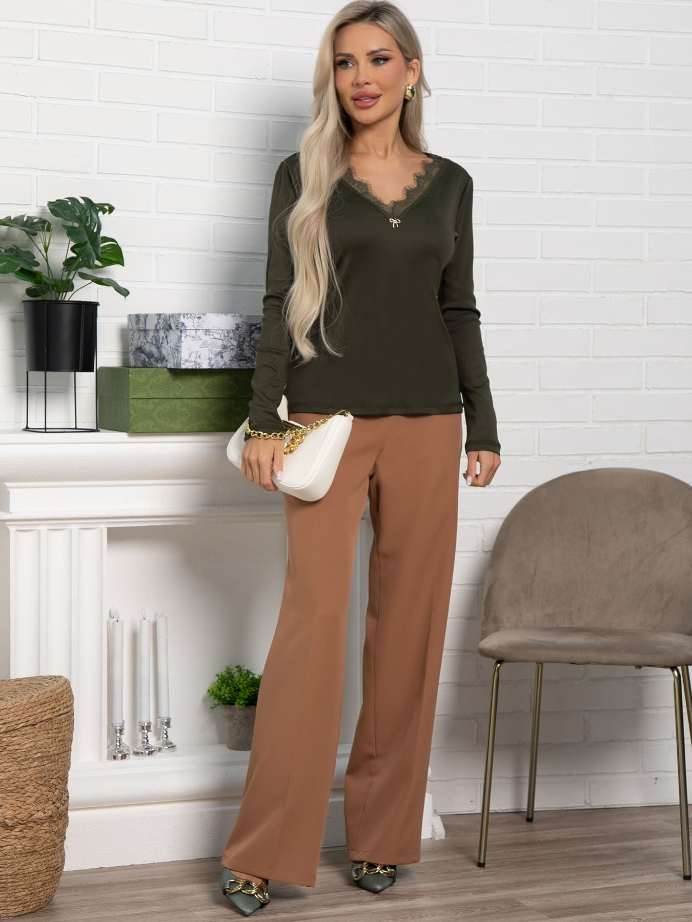 Пополните свой гардероб стильной новинкой — блузой из трикотажа в модном цвете хаки. Эта модель — идеальное сочетание элегантности, комфорта и универсальности, что делает её незаменимой как для повседневного ношения, так и для особых случаев. V-образный вырез элегантно удлиняет шею и придаёт образу женственности. Вырез украшен нежным кружевом, что превращает простую блузу в изысканный элемент гардероба, добавляя утонченности и шарма. Небольшая, но выразительная металлическая подвеска в форме бантика золотистого цвета, аккуратно пришитая к блузе, придаёт ей дополнительную изюминку и завершает образ. Носите её с джинсами для повседневного стиля, сочетайте с юбкой или брюками для офисного ансамбля или для встреч с друзьями. Эта блуза станет стильным дополнением к любому вашему наряду.