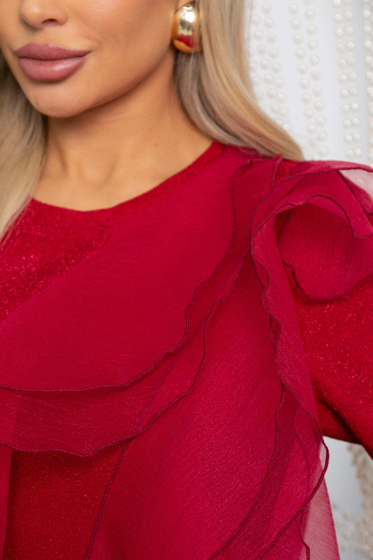 Подарите своему гардеробу нотки праздничной магии с этой изумительной блузкой из трикотажа с люрексом! Волан из органзы добавляет образу легкости и романтичности. Благодаря блестящему люрексу, становится идеальным выбором для праздничных мероприятий и вечерних выходов, позволяя подчеркнуть вашу женственность и очарование.