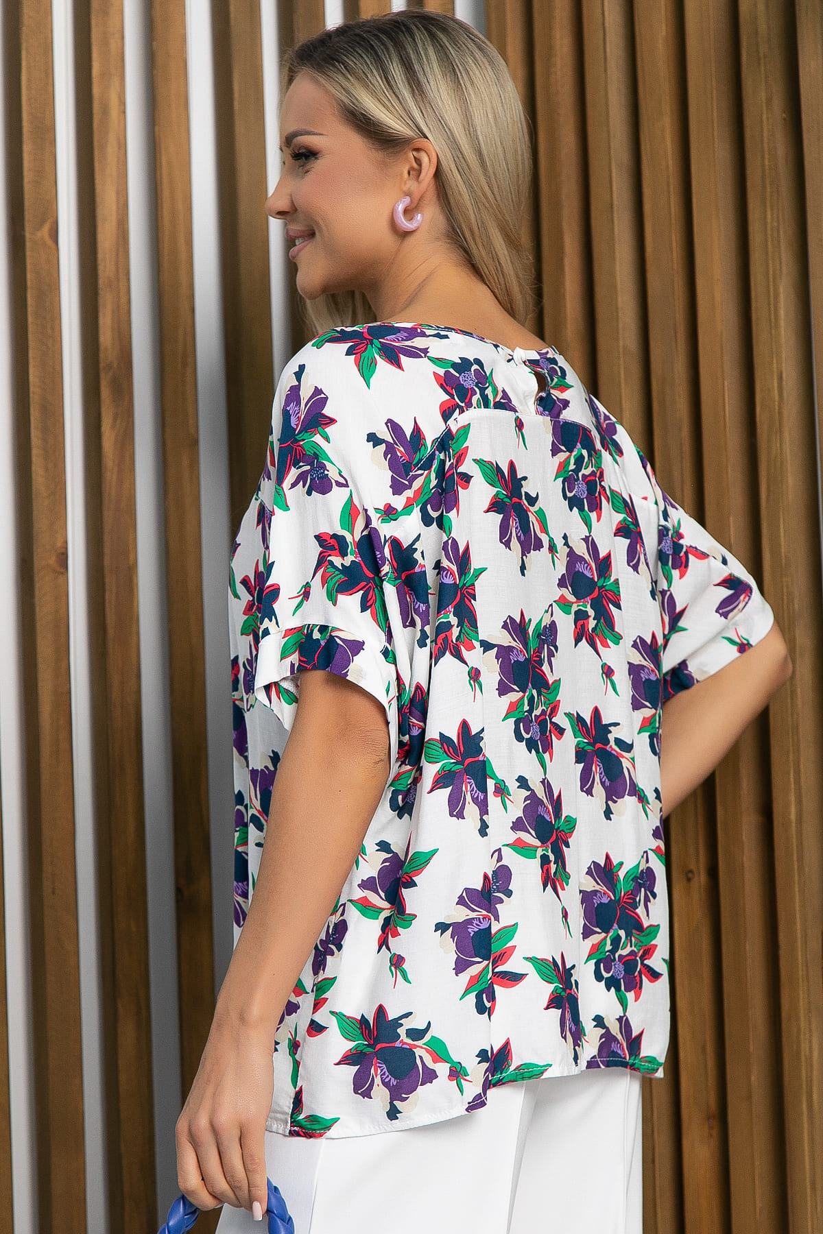 Блузка из штапеля с цветочным принтом — это прекрасный вариант для создания нежного и воздушного образа! Благодаря коротким рукавам и округлой горловине, эта модель выглядит непринуждённо.