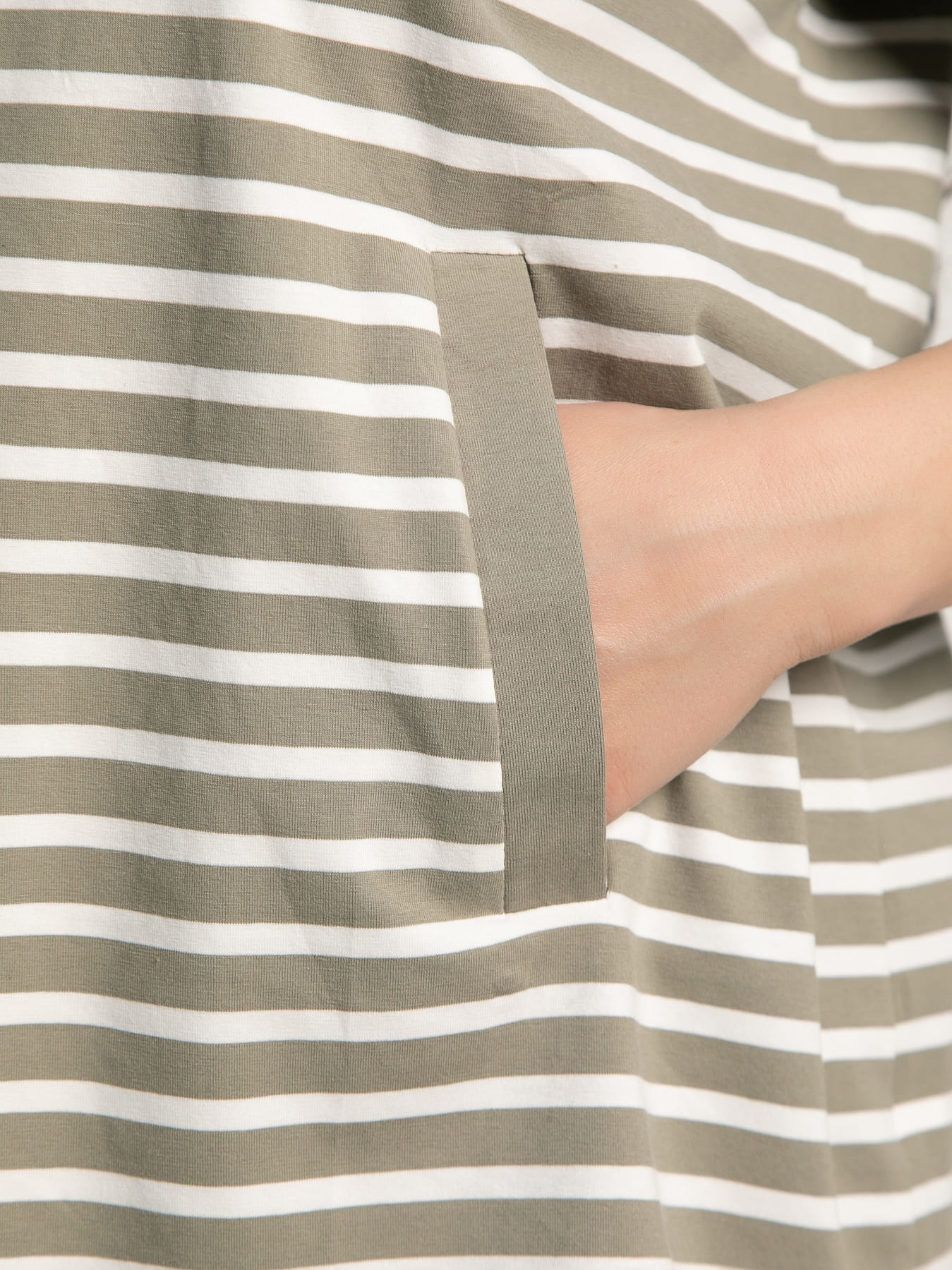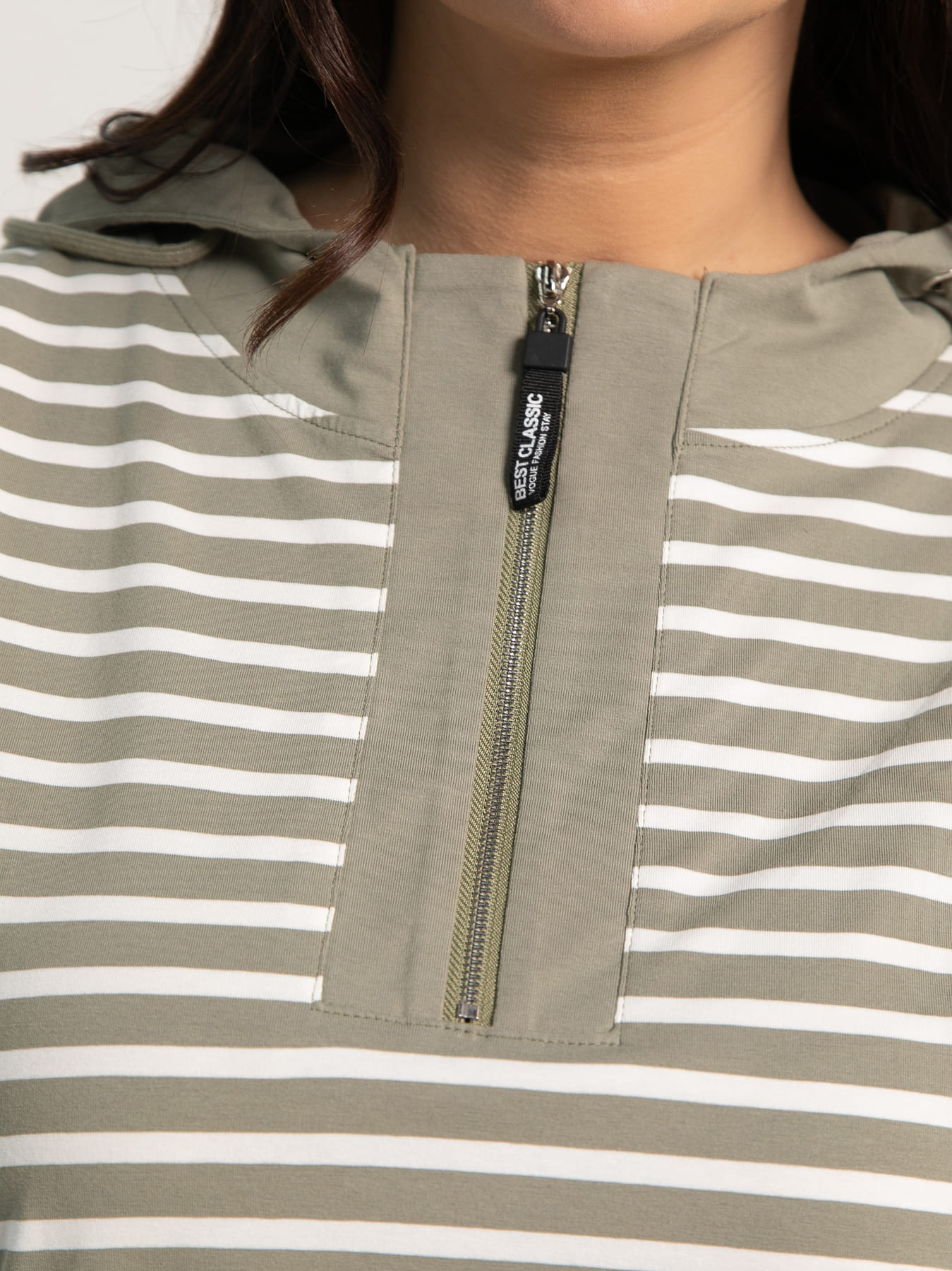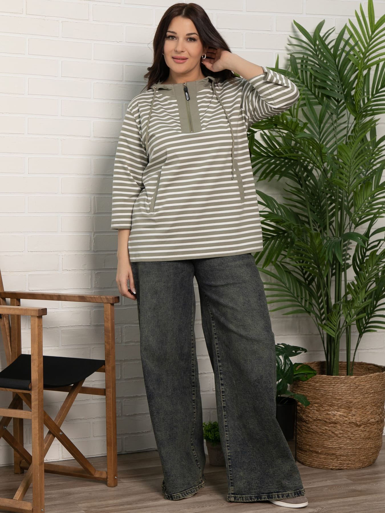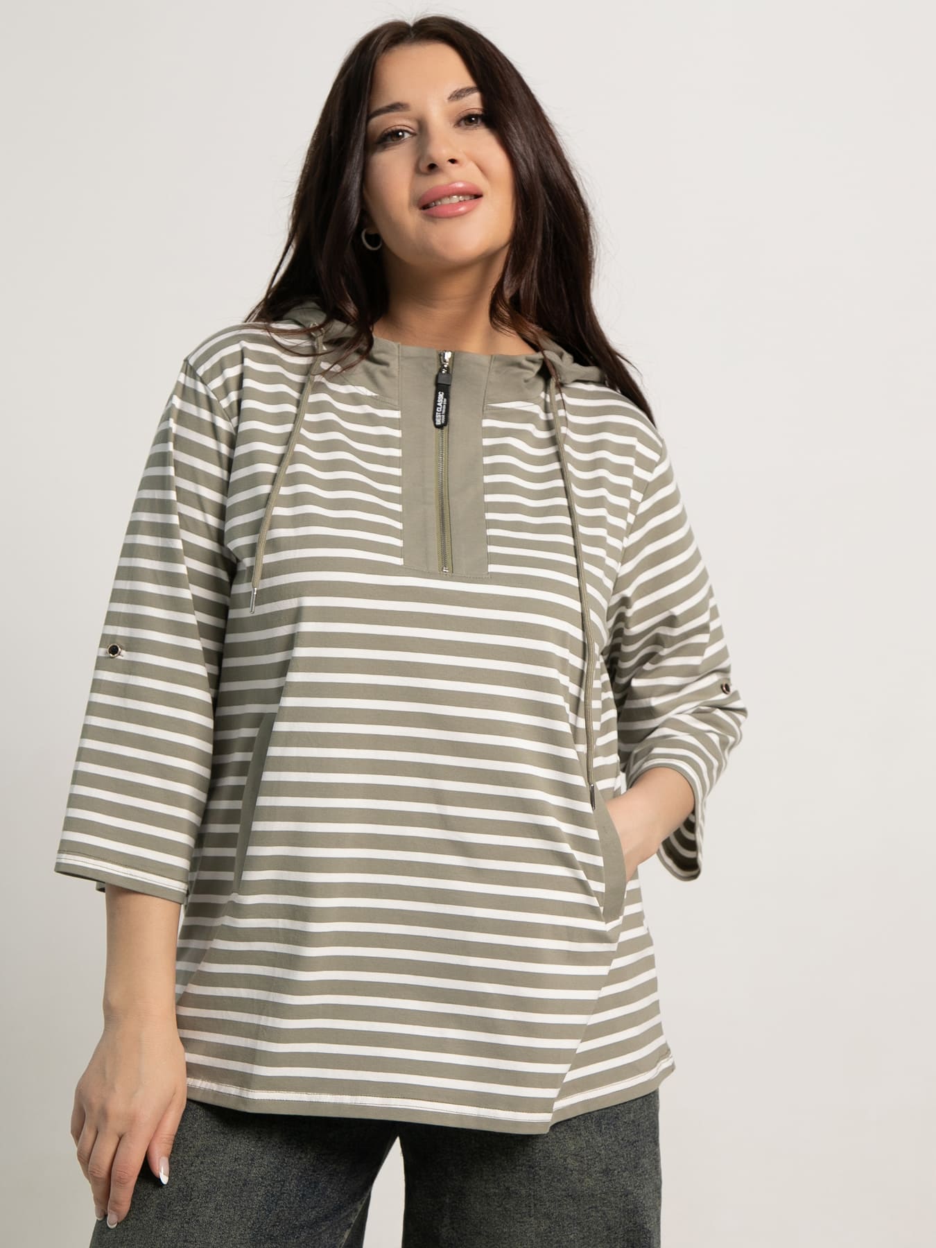 Стильная блуза прямого кроя с втачным рукавом длиной 3/4 отлично подходит для повседневных образов. Горловина украшена капюшоном на затяжке и застежкой-молнией, что придает модели современный и практичный вид. Рукав заканчивается застежкой на пату, создавая интересный акцент. По переднему полотнищу расположены два потайных кармана, добавляющие функциональности. Модель выполнена в зеленую полоску на белом фоне, а представленная цветовая гамма в бело-зеленых оттенках легко сочетается с другими предметами гардероба, делая образ гармоничным и свежим.