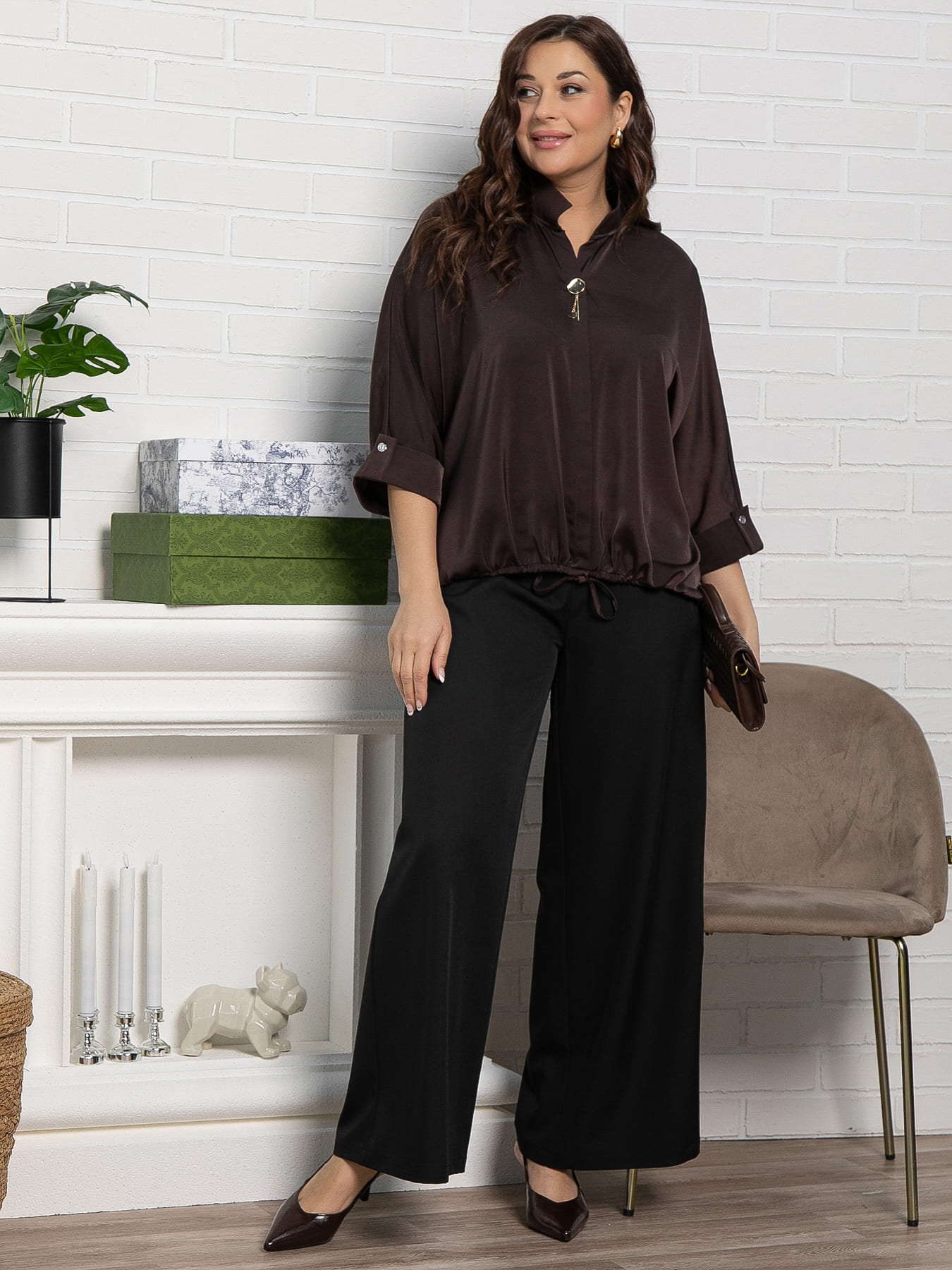 Выразите свою уникальность и добавьте изысканности любому наряду с этой шелковой блузкой! Рукава длиной 3/4, цельнокроеные и завершающиеся манжетом с пуговицей и патой, придают модели утонченный вид. Воротник-стойка плавно переходит в широкий распашной воротник апаш, создавая современный и элегантный силуэт. Спина немного длиннее переда. По центру передней части проходит планка, а внизу — сборка на шнурке, придающая интересный объем. Эта блузка станет идеальным выбором как для деловых встреч, так и для повседневного образа, добавляя вашему стилю нотку роскоши и утонченности.