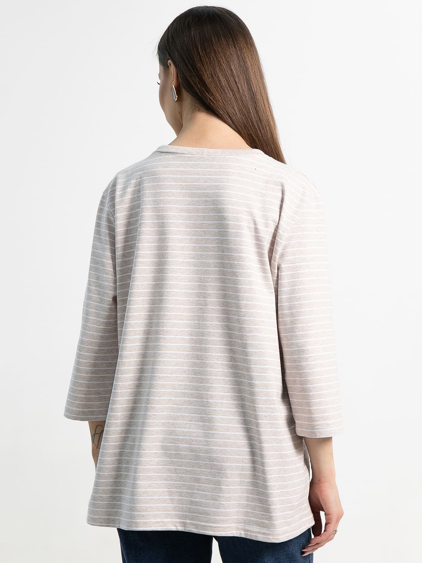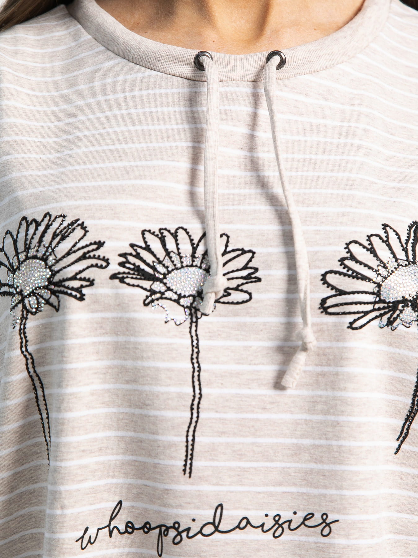 Добавьте в свой гардероб немного очарования и легкости. Втачные рукава длиной 3/4 и округлая горловина, которую можно затянуть шнурком. На передней части блузки — фотопечать со стразами в виде цветов. Эта блузка, созданная для комфорта и стиля, станет вашим любимым элементом для повседневных образов.
