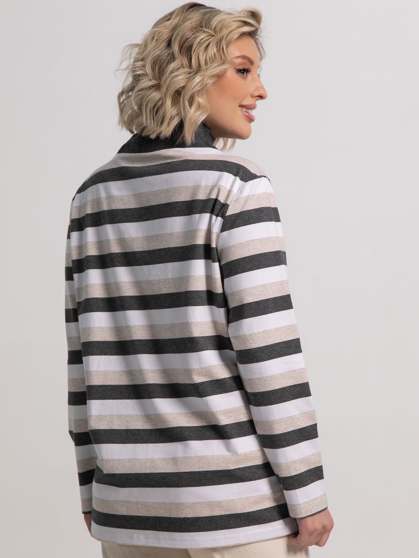 Эта блузка станет ярким акцентом вашего гардероба. Сочетание классической полоски с оригинальным принтом и удобного кроя делает ее идеальной для создания стильных и непринужденных образов. Втачной рукав полной длины. Воротник-хомут со шнурком. На передней части фотопечать со стразами.