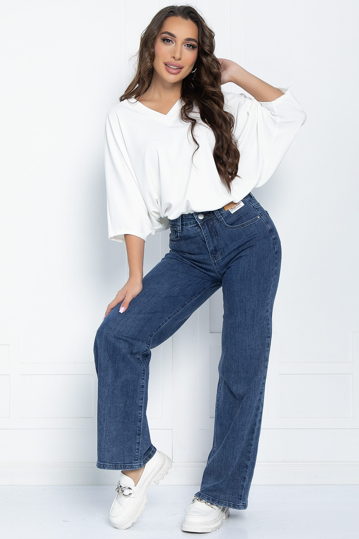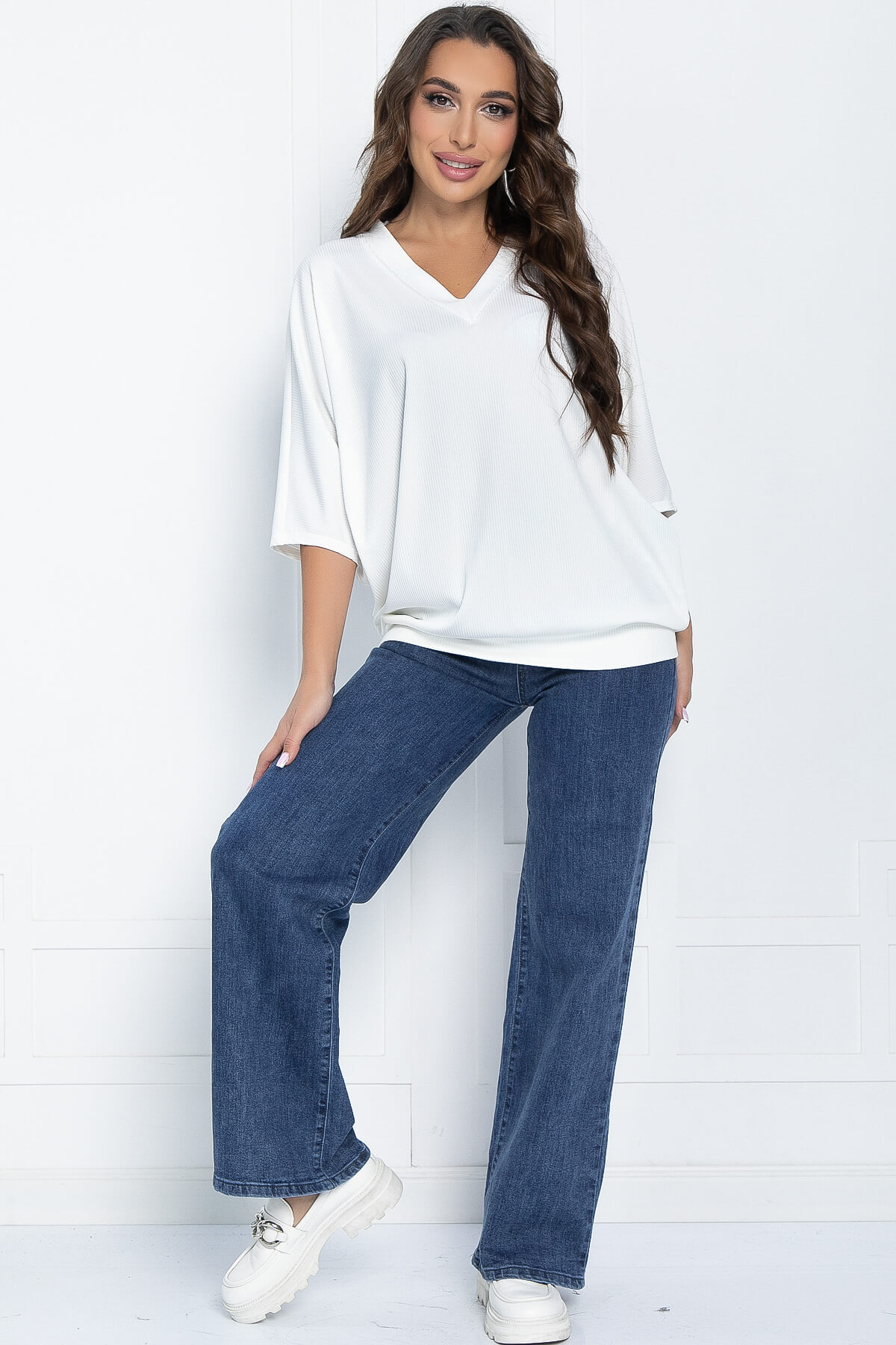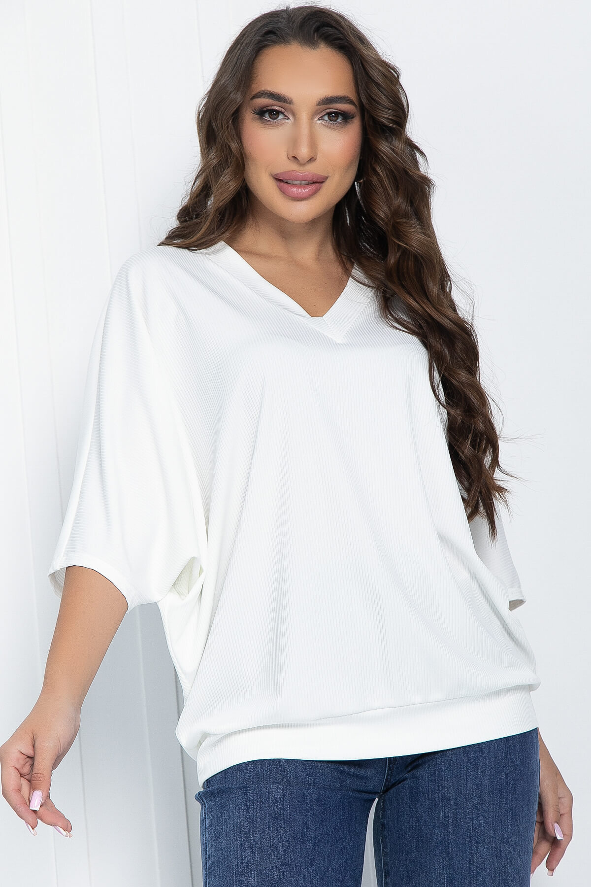 Блуза имеет интересный дизайн с V-образным вырезом горловины и удобным цельнокроеным рукавом «летучая мышь» длины ¾ . Важное преимущество такого рукава заключается в его способности скрывать различные погрешности фигуры. Обладая женственной привлекательностью, подойдет к классической офисной и к деловой повседневной одежде.