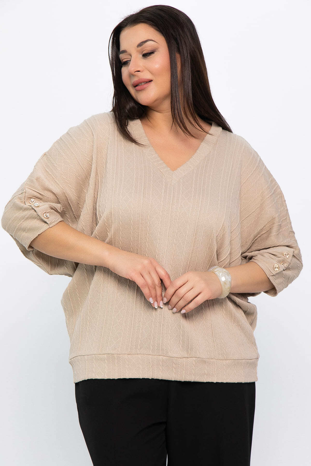 Этот уютный трикотажный джемпер с рукавами летучая мышь — идеальное сочетание комфорта и стиля. Благодаря свободному крою и мягкому материалу он создает ощущение легкости и свободы движений, а V-образный вырез добавляет нотку элегантности и женственности. Идеальный выбор для прохладных дней, когда хочется выглядеть стильно и чувствовать себя уютно в любой ситуации. Рукава цельнокроеные, украшенные тремя пуговицами с каждой стороны. Есть притачной пояс по низу изделия.