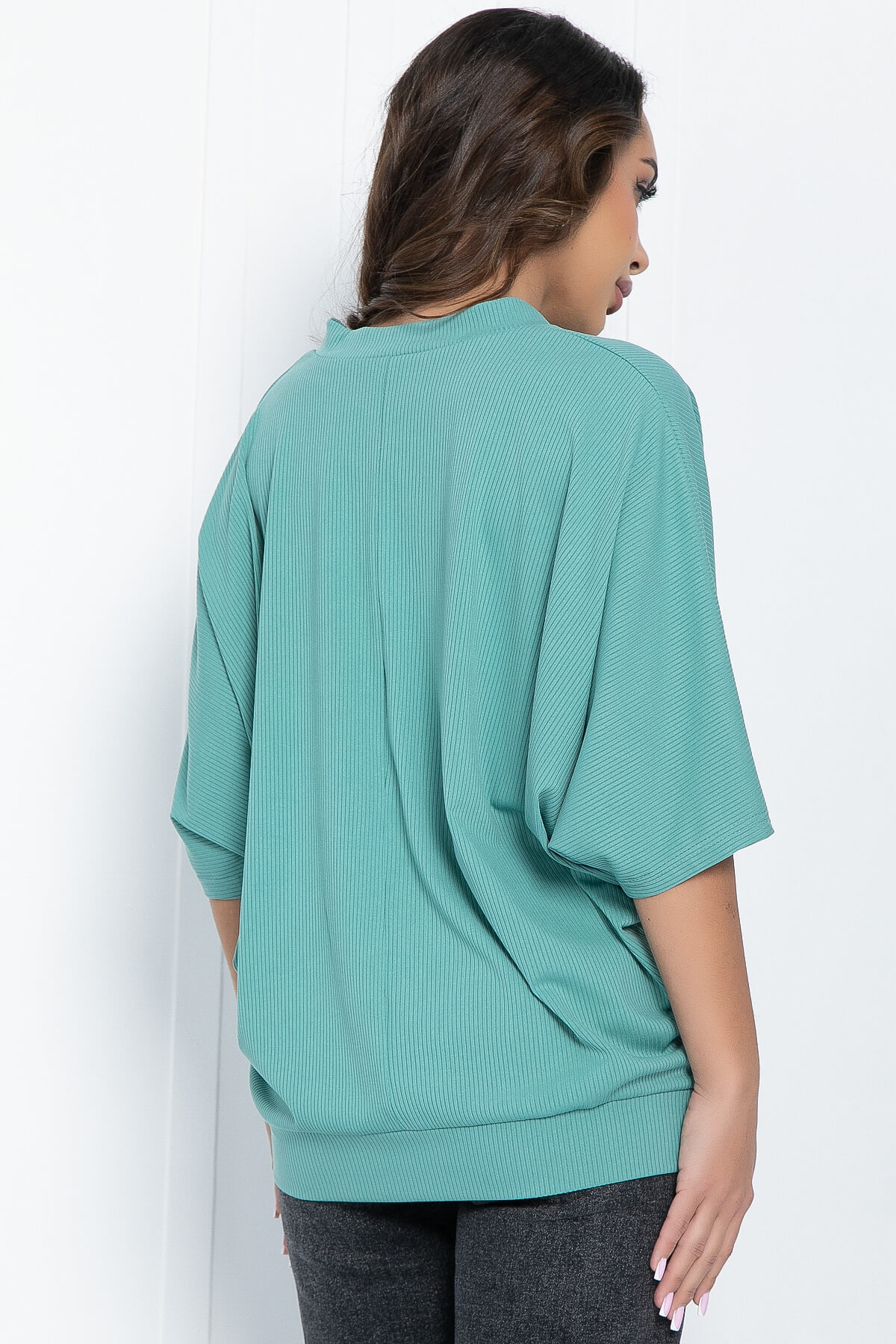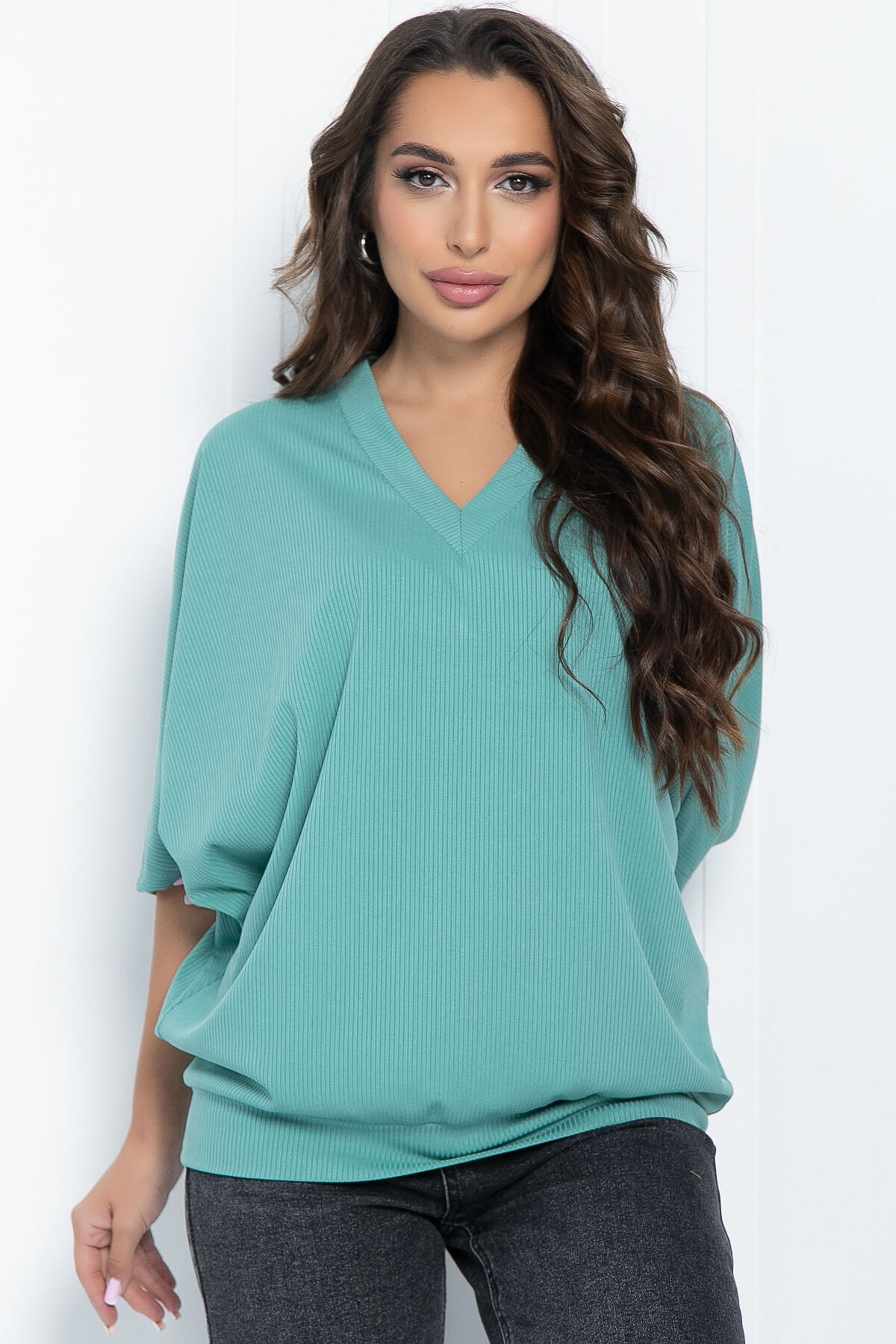Блуза имеет интересный дизайн с V-образным вырезом горловины и удобным цельнокроеным рукавом «летучая мышь» длины ¾ . Важное преимущество такого рукава заключается в его способности скрывать различные погрешности фигуры. Обладая женственной привлекательностью, подойдет к классической офисной и к деловой повседневной одежде.