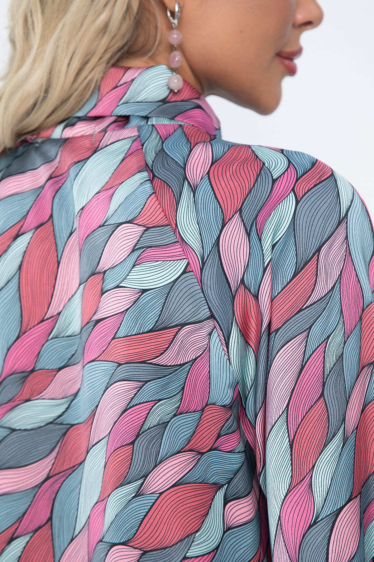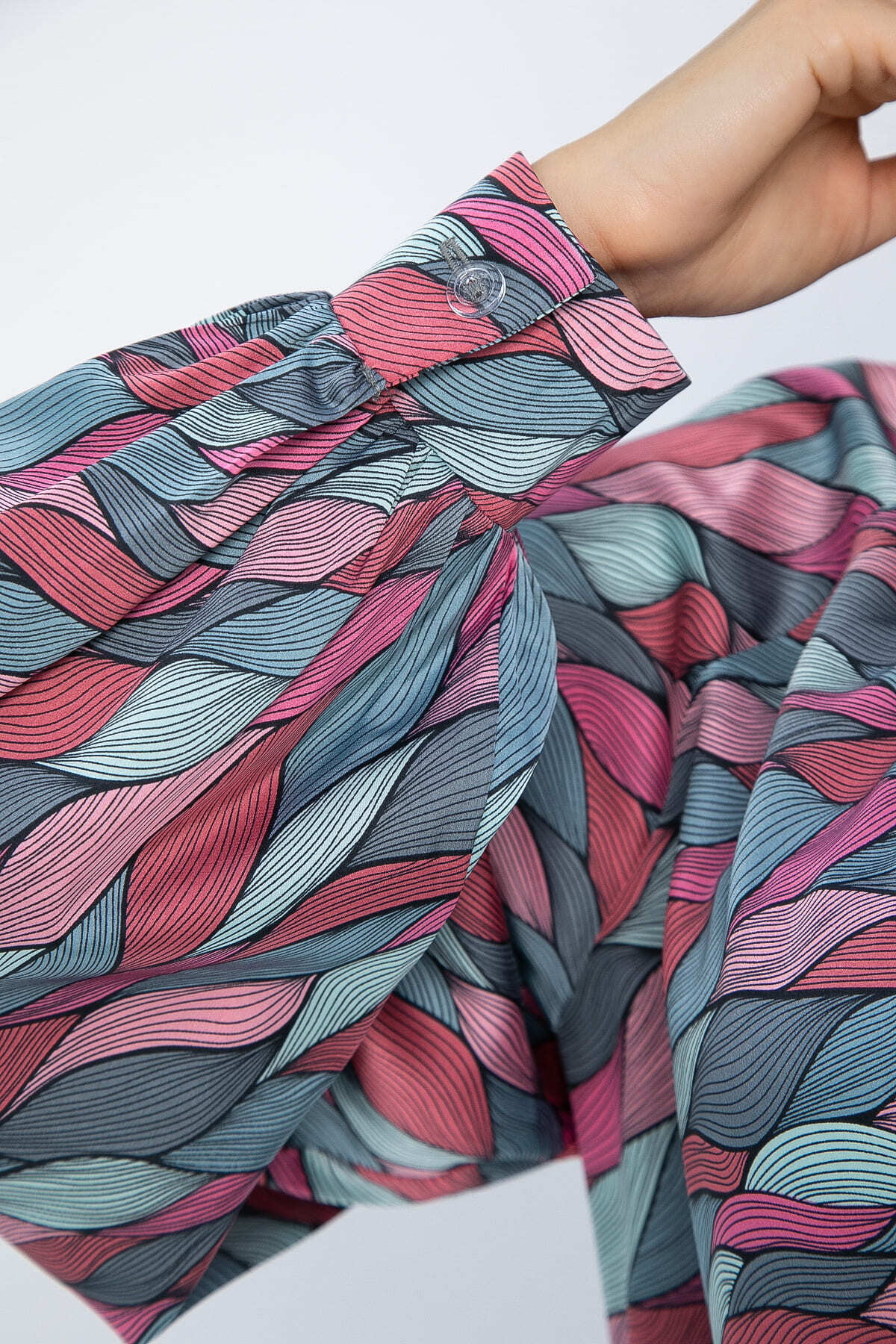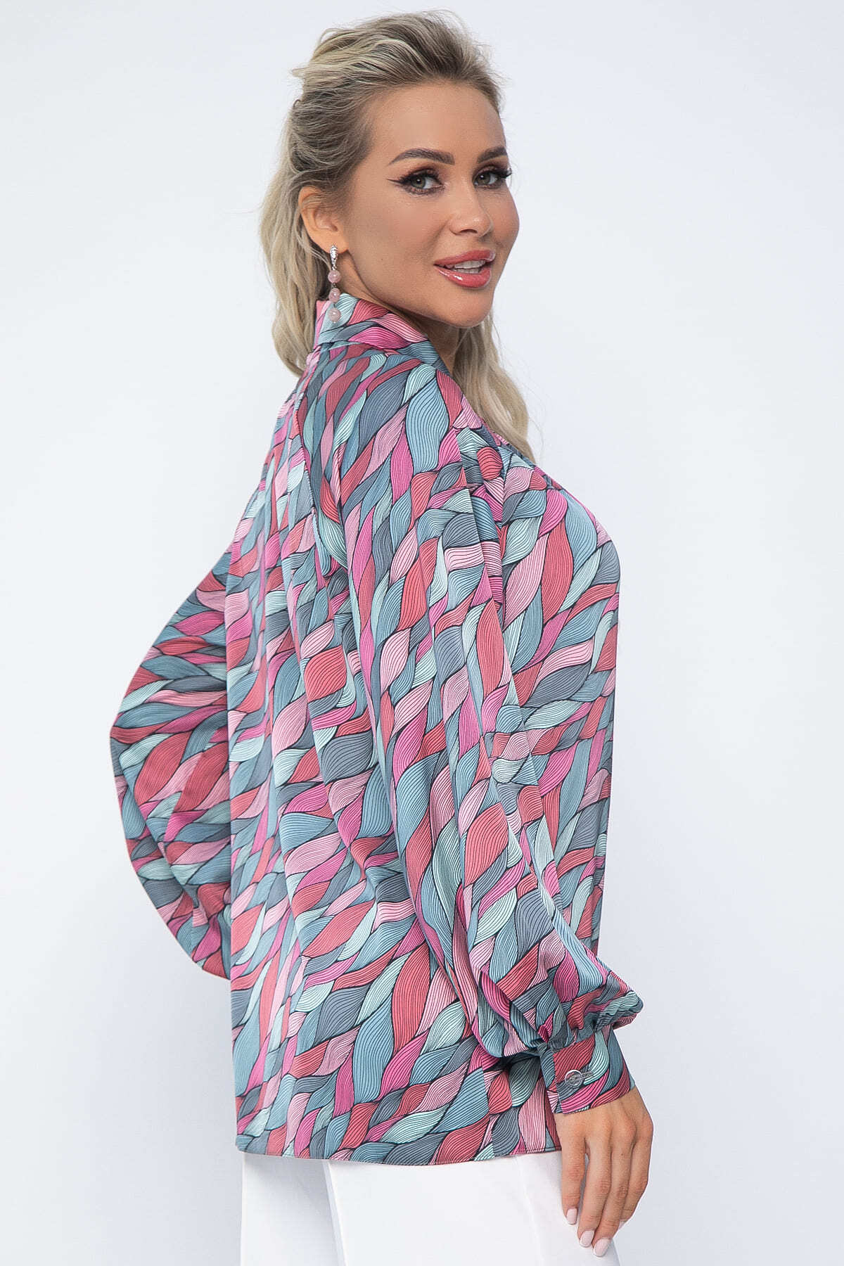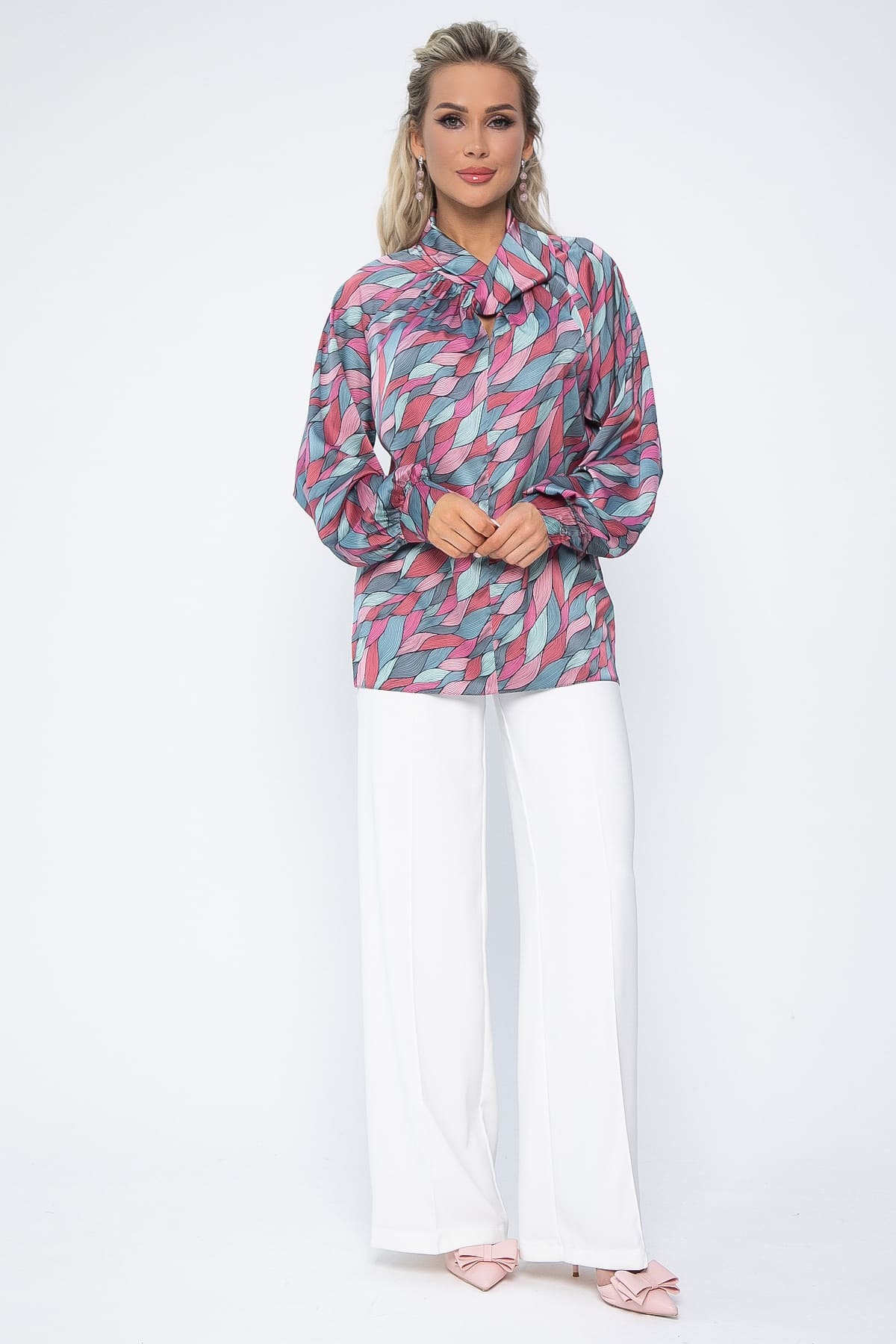 Создайте уникальный образ с этой блузкой! Яркий абстрактный принт придает изделию индивидуальность. Модель с длинными рукавами реглан и манжетами на пуговицах. Воротник оформлен в виде декоративного узла, придавая образу элегантность. Отлично сочетается с джинсами, юбками и брюками.