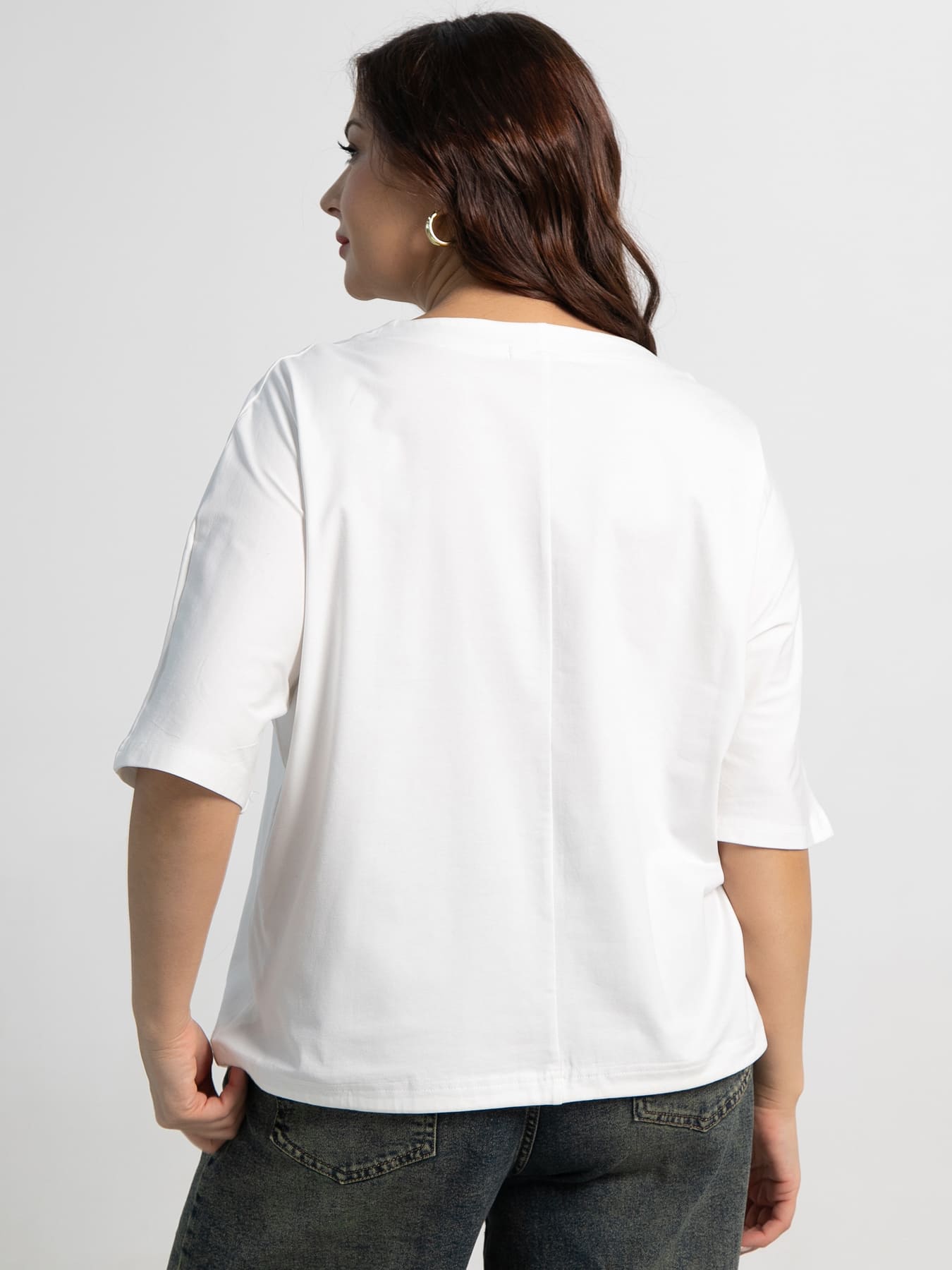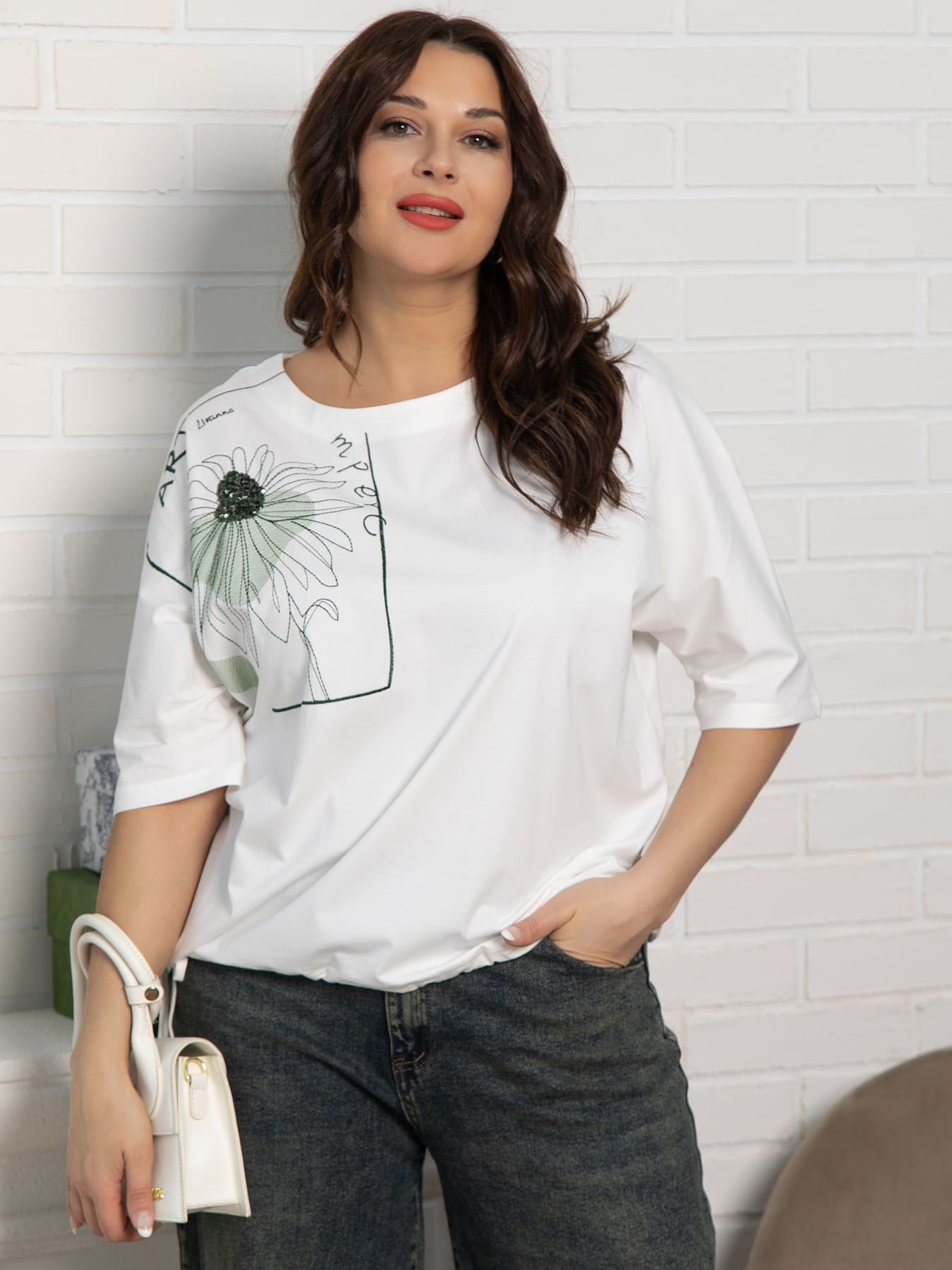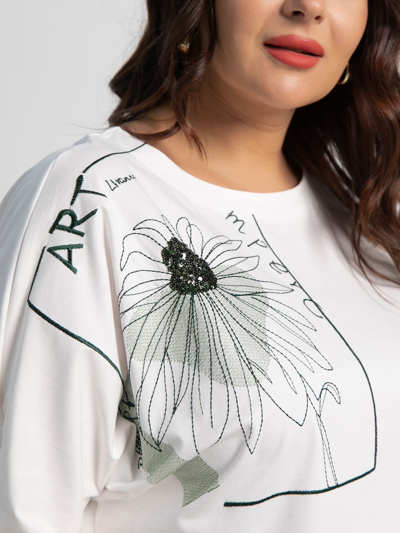 Стильная блузка с округлой горловиной и цельнокроеным рукавом. Украшена декоративными пайетками и вышитым узором, что придает ей изящный вид. Свободный крой обеспечивает комфорт и свободу движений, а низ с шнурком позволяет моделировать силуэт — собирать или оставлять свободным. Идеальный выбор для ежедневных прогулок, отдыха и повседневных образов, сочетая практичность и стиль.