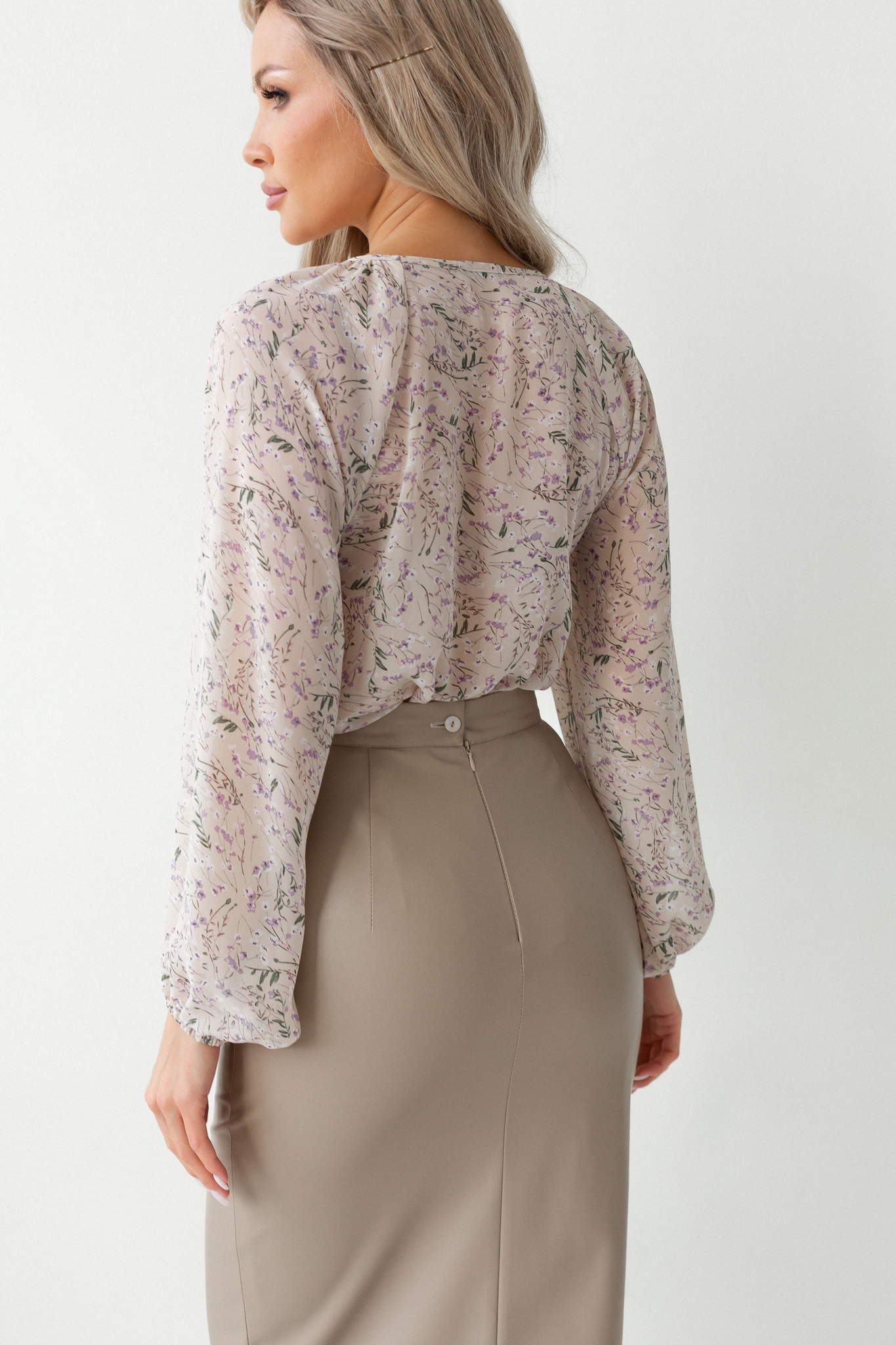 Комфортная блузка свободного силуэта из легкой ткани шифон. Длинный рукав - реглан на сборке. Круглый вырез горловины. Низ ровный, без разрезов. Универсальная блузка для работы и отдыха.