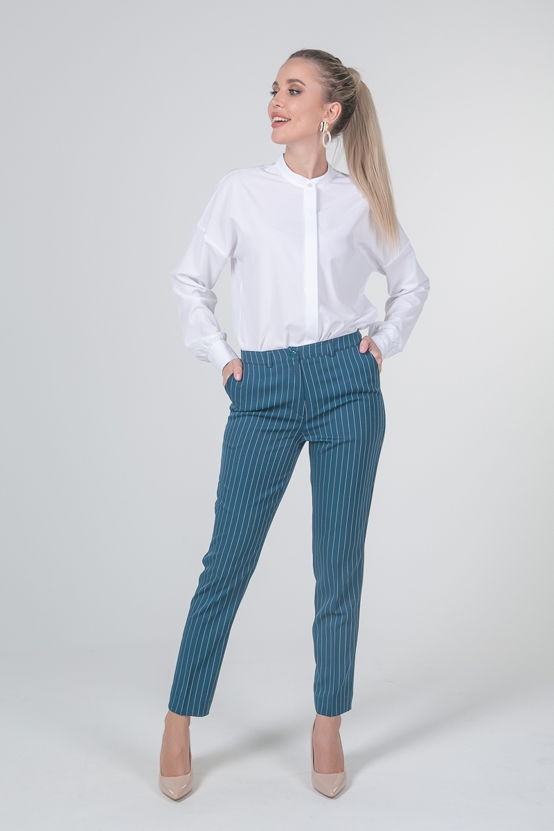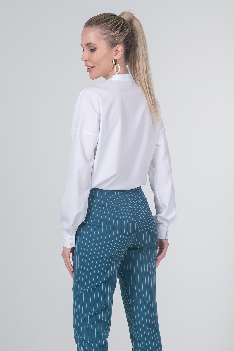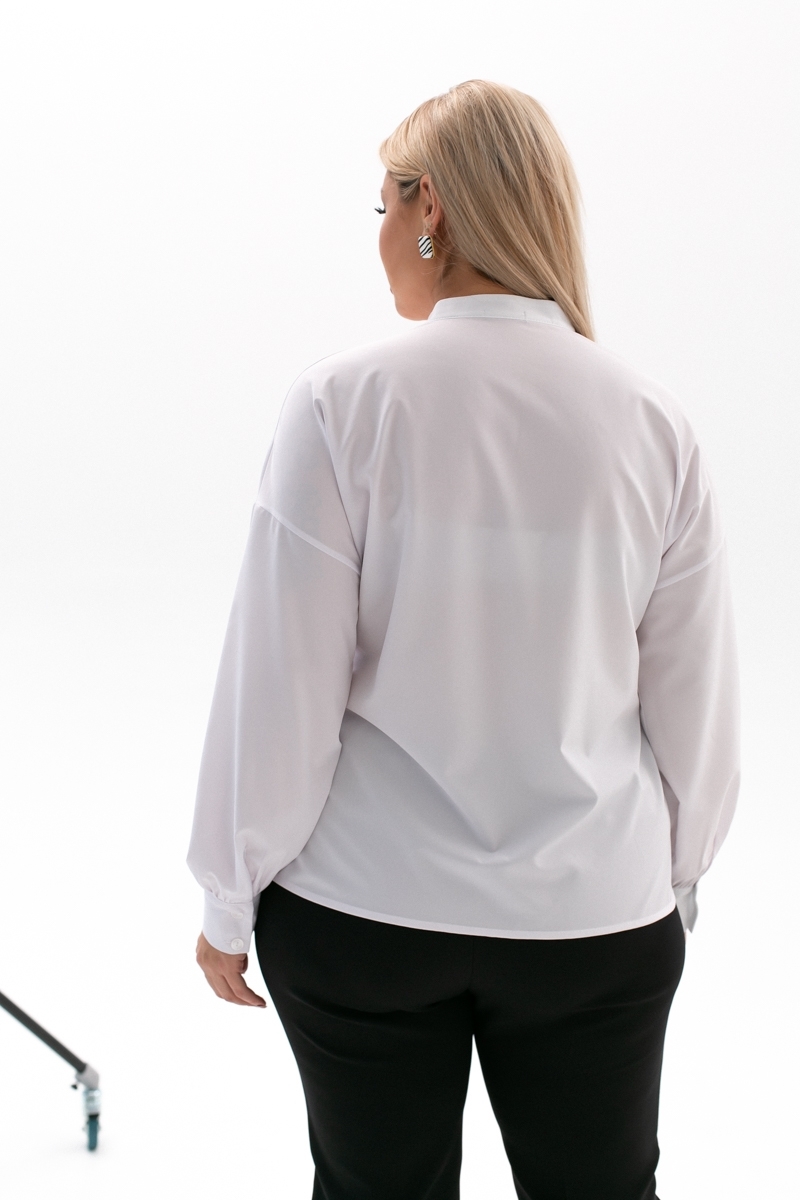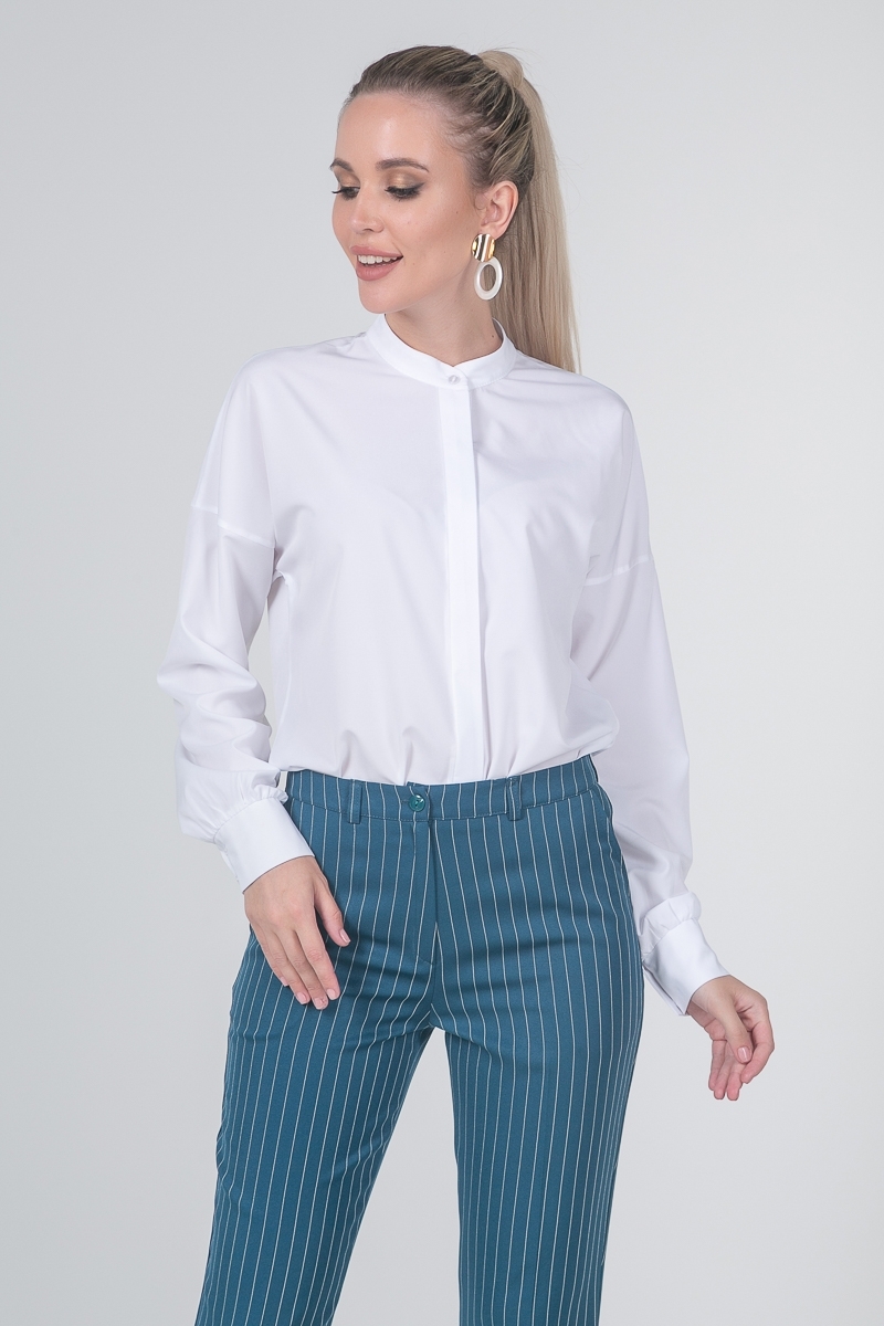 Элегантная блузка прямого кроя из легкой ткани "Ниагара". Плечо спущенное, длинный рукав оканчивается притачной манжетой. Горловина оформлена воротником - стойкой, переходящим в планку с "супатной" застежкой. Низ ровный, без разрезов. Идеальная основа для создания образа.