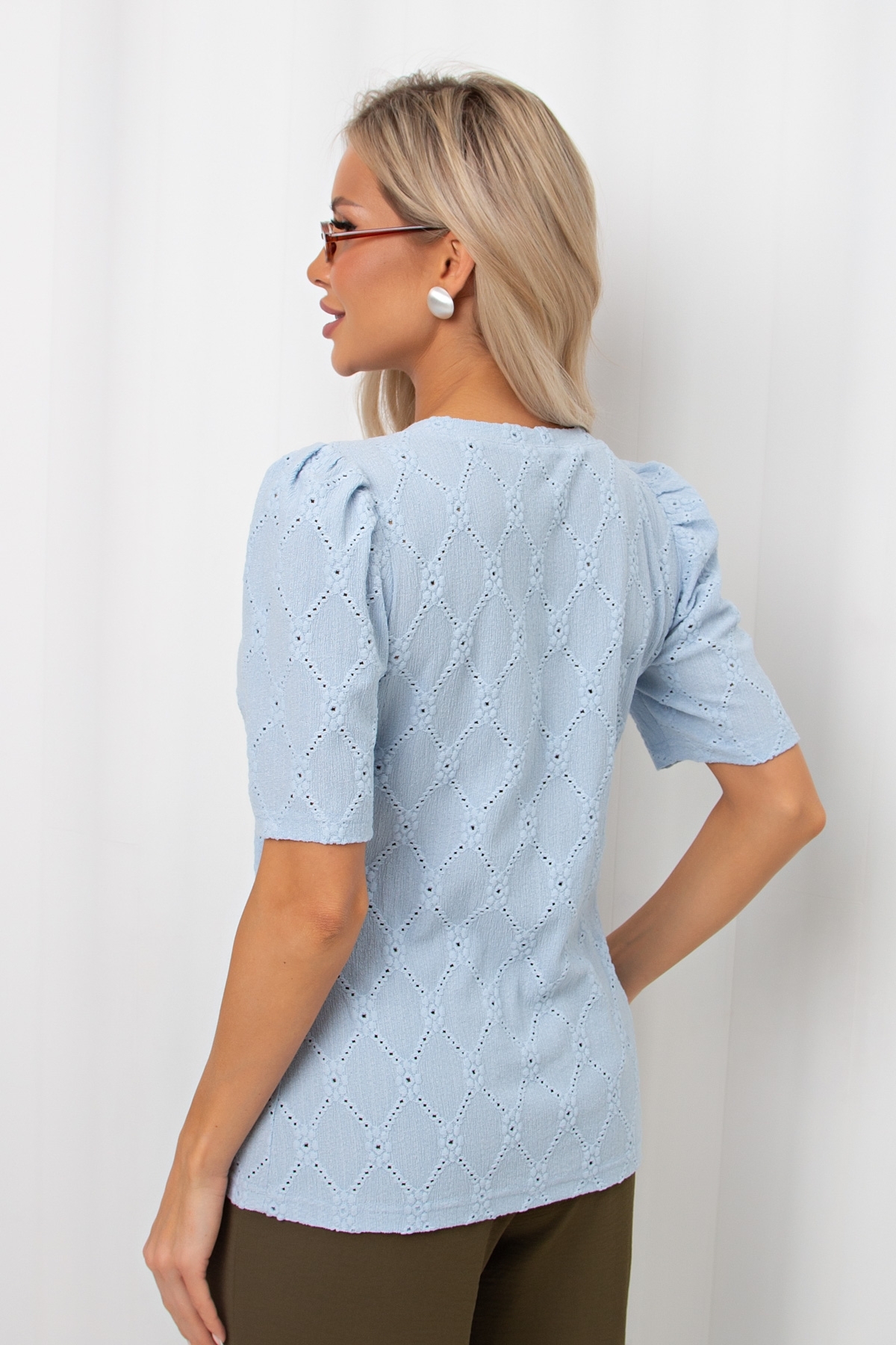 Комфортная блузка полуприлегающего силуэта. Округлая горловина. Втачной рукав фонарик. Низ ровный, без разрезов.