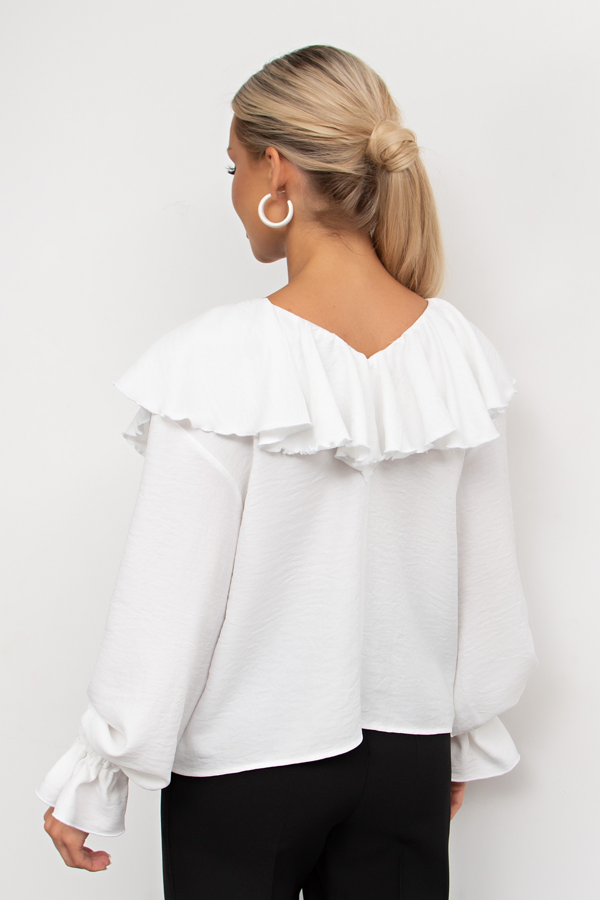 Стильная блузка свободного кроя. V - образная горловина оформлена воланом с переходом на спинку и полочку. Длинный втачной рукав по запястью присборен на резинку. Низ ровный, без разрезов.