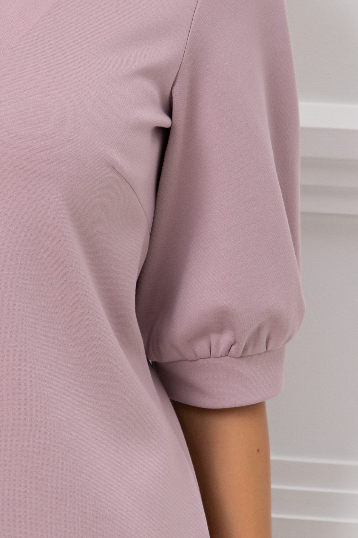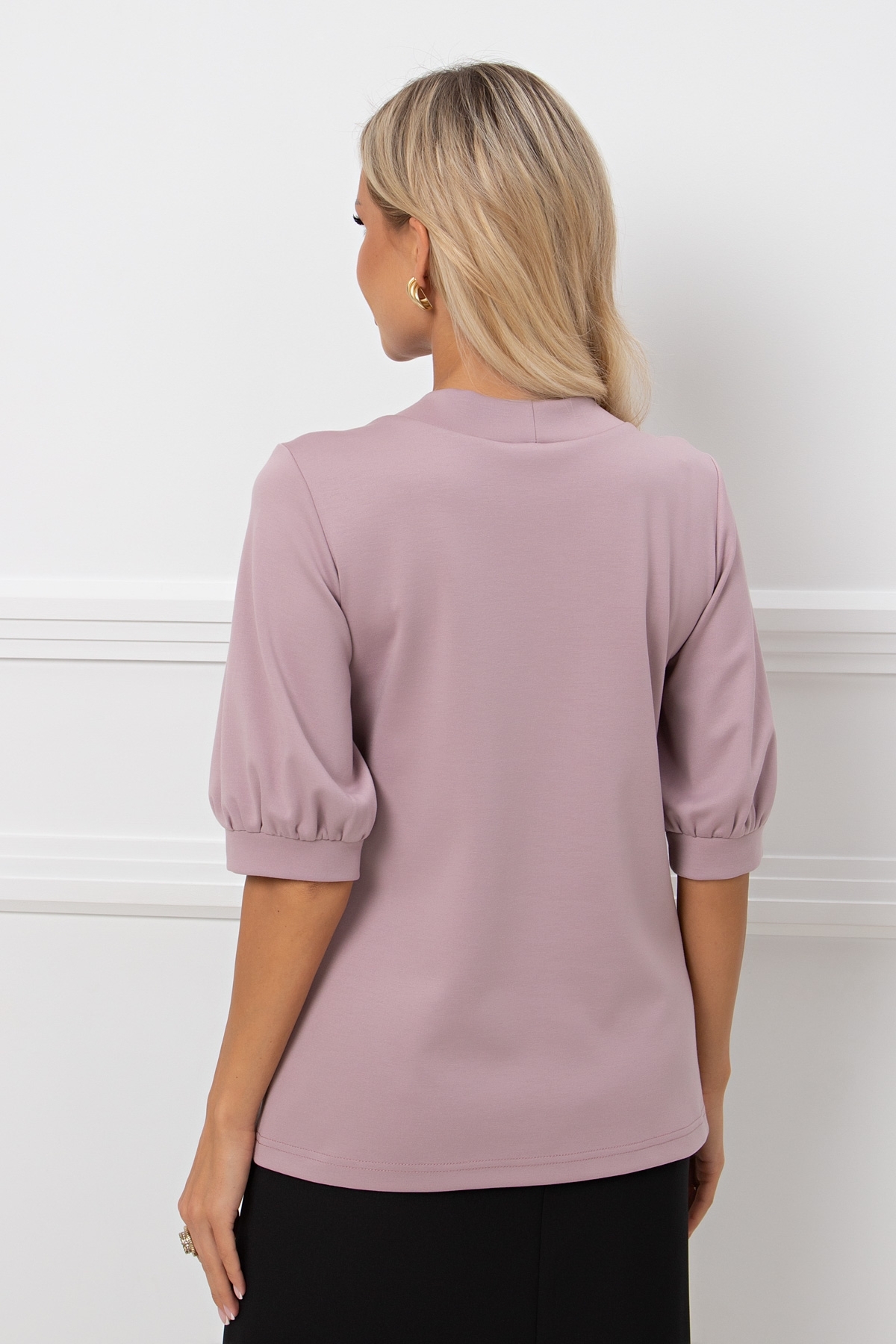 Женственная блуза свободного кроя из трикотажного полотна.V - образный вырез переходящий в планку с застежкой на петли и пуговицы. Втачной короткий рукав, оканчивается притачной манжетой на сборке. Низ ровный, без разрезов.