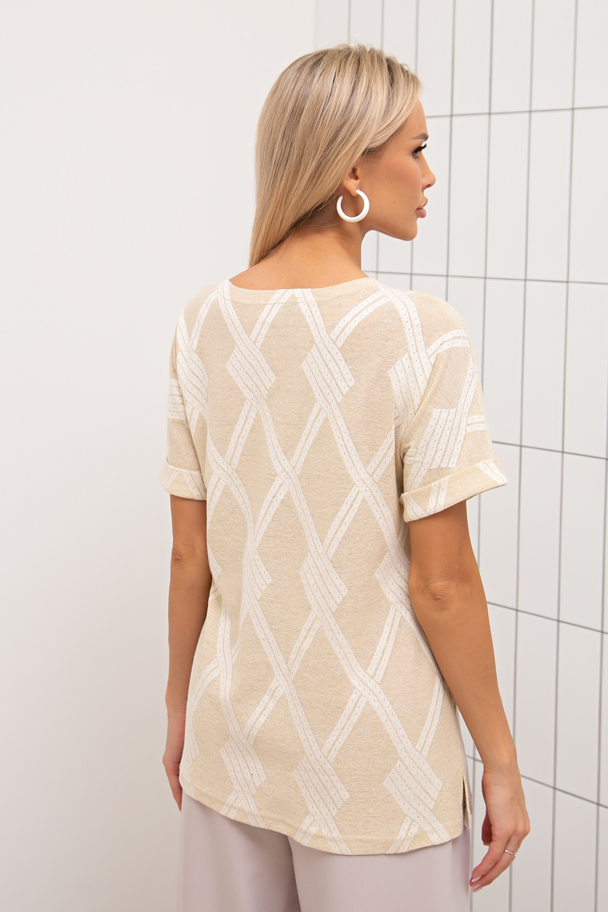 Красивая футболка прямого силуэта из трикотажного полотна. Короткие цельнокроеные рукава, оканчиваются манжетами на отворотах. Округлый вырез горловины. Низ ровный, по бокам разрезы.