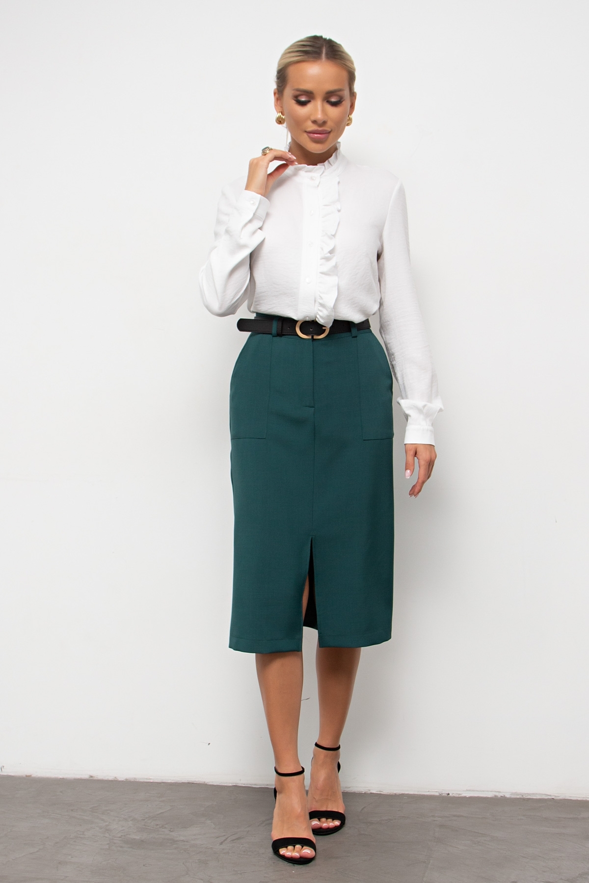 Женственная блузка прямого силуэта. Горловина оформлена воротником - стойка с рюшей. По переду планка с застежкой на петли и пуговицы, декорирована рюшей. Длинный втачной рукав оканчивается притачной манжетой. Низ ровный, без разрезов.