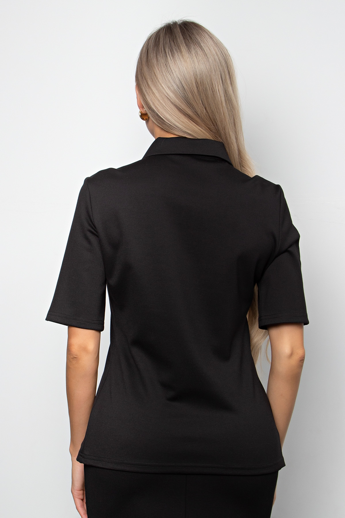 Комфортная блузка полуприлегающего силуэта из трикотажного полотна. Втачной рукав до локтя. Отложной воротник. Перед оформлен планкой с застежкой на петли и пуговицы. Низ ровный, без разрезов.
