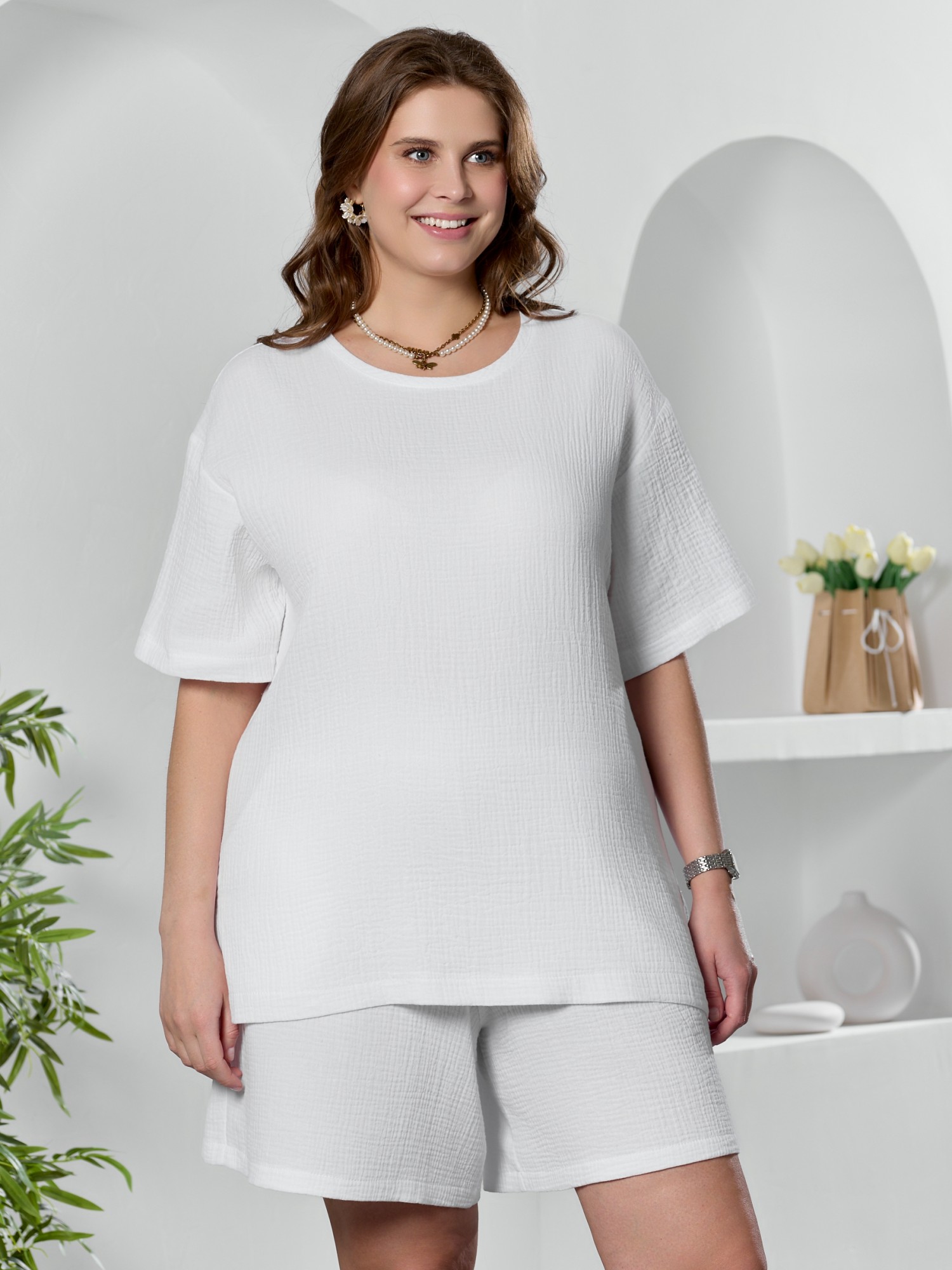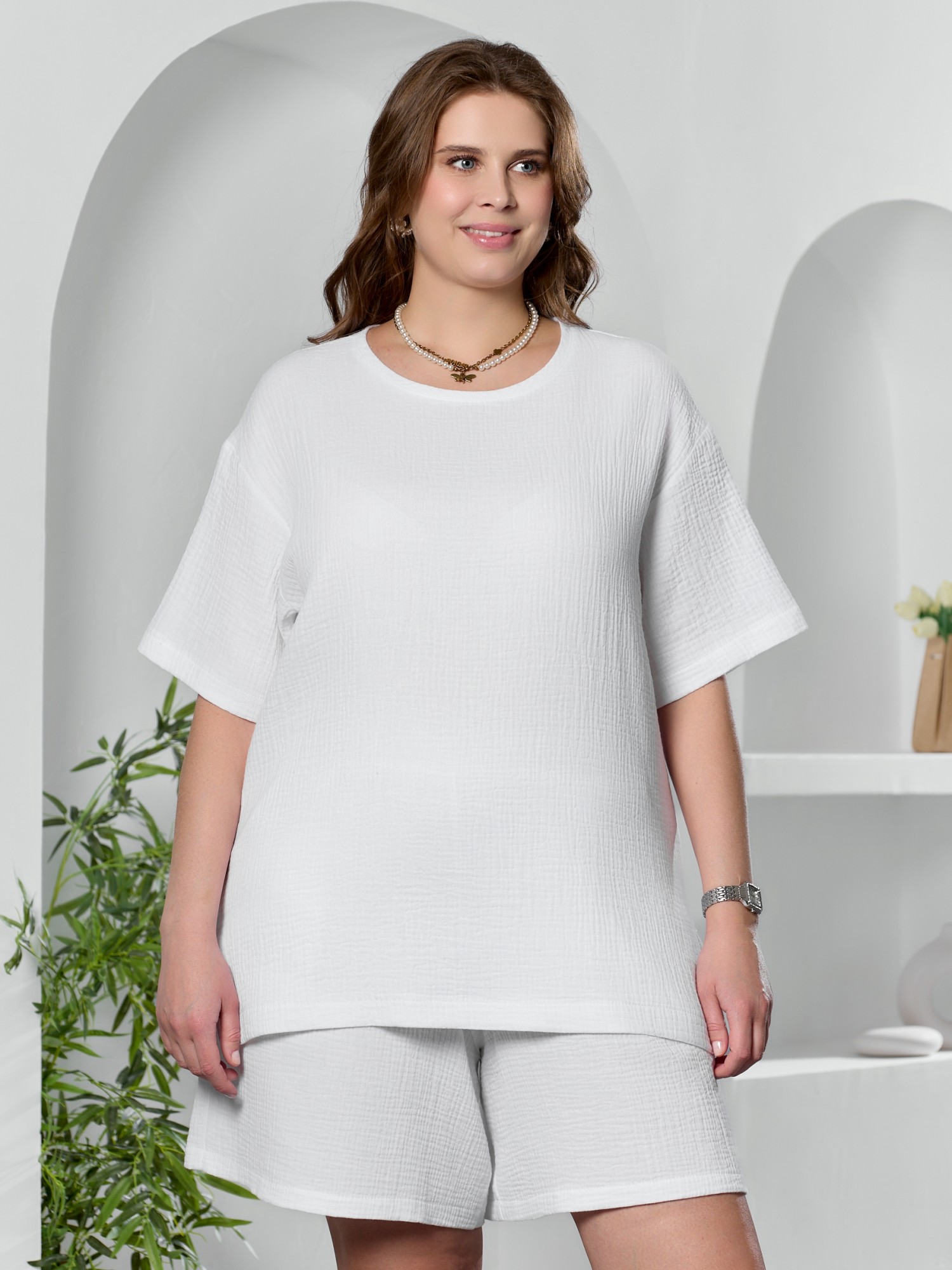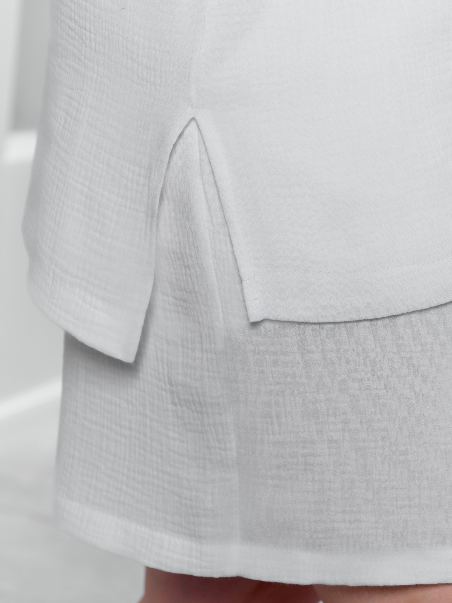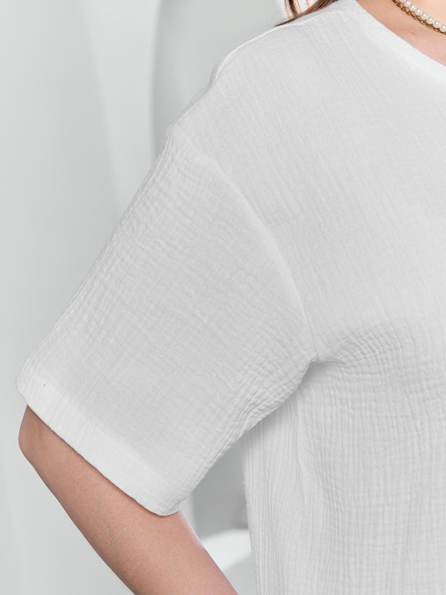 Блуза женская из гладкокрашеного тканого полотна «муслин», прямого силуэта, с горловиной овальной формы и короткими втачными рукавами. Горловина обработана втачной планкой, в боковых швах разрезы.
