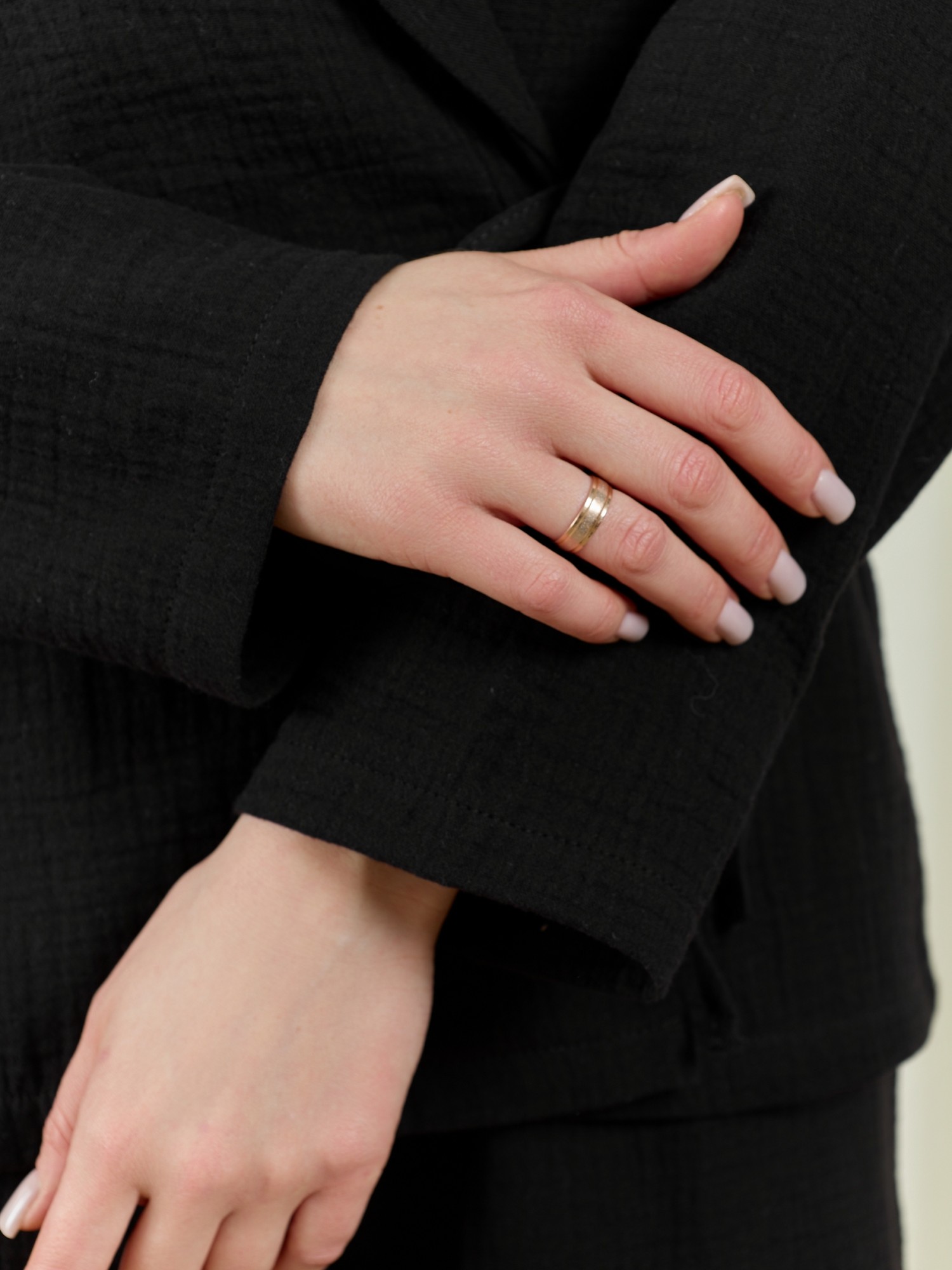 Блуза женская на запахе из фактурного гладкокрашеного полотна, с длинными рукавами, спущенным плечом и воротником "шаль". Низ изделия и рукавов обработаны подгибкой. Для фиксации изделия на фигуре предусмотрены шнуры из ркантовки, вставленные в правый бортовой и левый боковой швы.