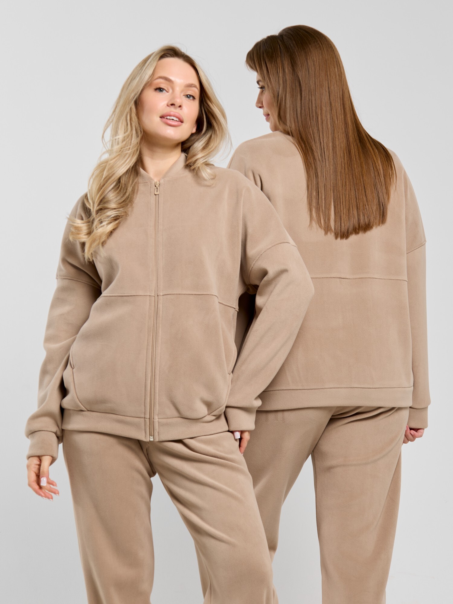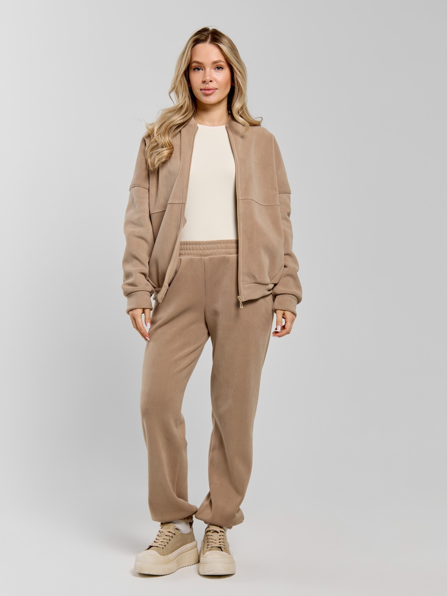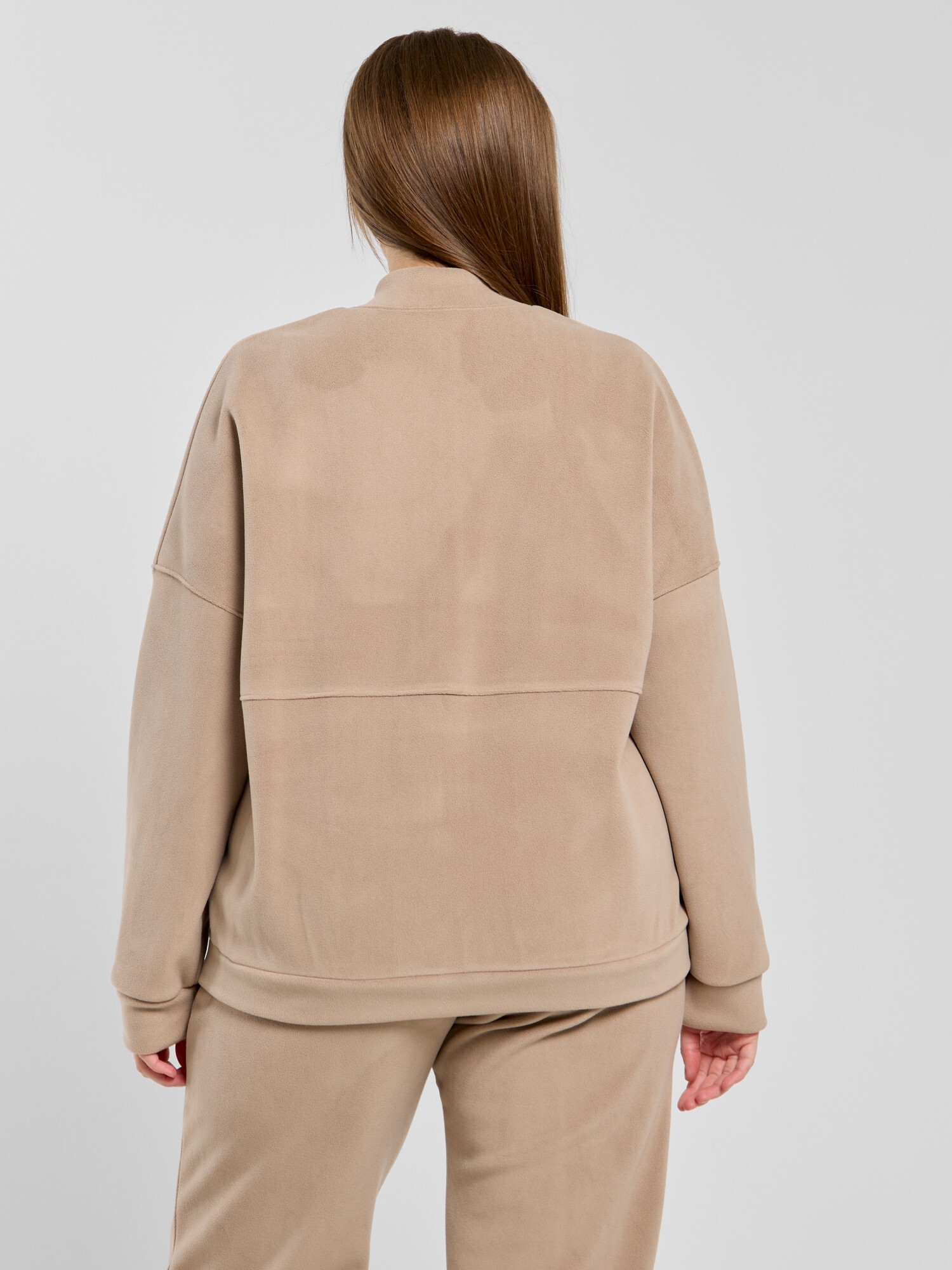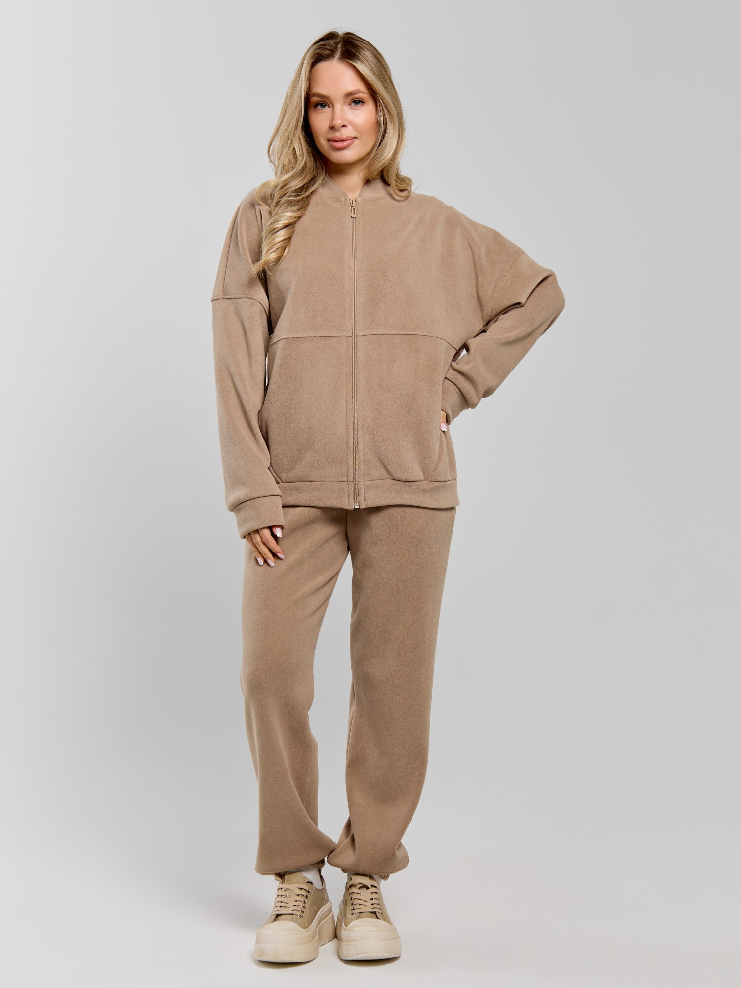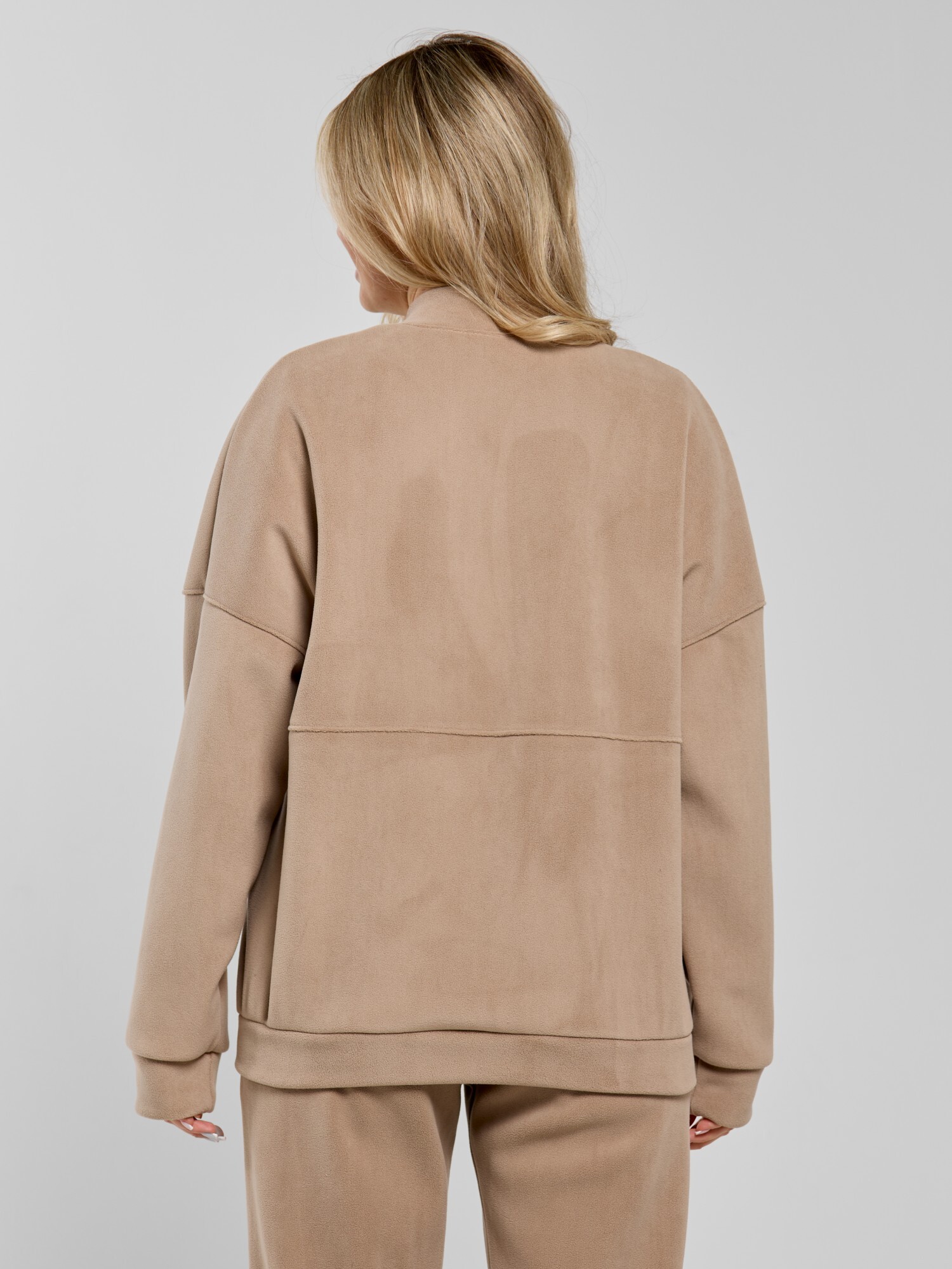 Куртка-бомбер – молодежная из гладкокрашенного трикотажного полотна «дабл-флис» (двухсторонний флис) прямого силуэта, свободная, с длинными втачными рукавами, горловиной овальной формы, обработанной втачной планкой, центральной бортовой застежкой на тесьму «молния». Полочка и спинка состоят из двух деталей, низ изделия с притачным поясом, рукава с притачными манжетами. Пояс, планка горловины, манжеты рукавов выполнены из основного материала.