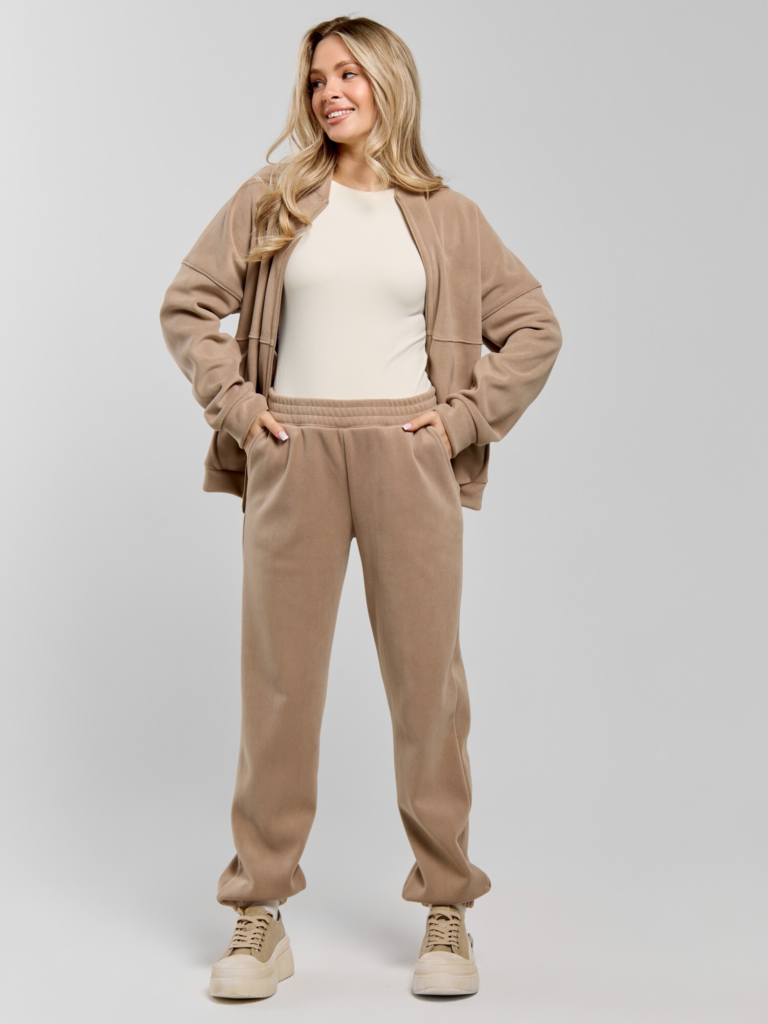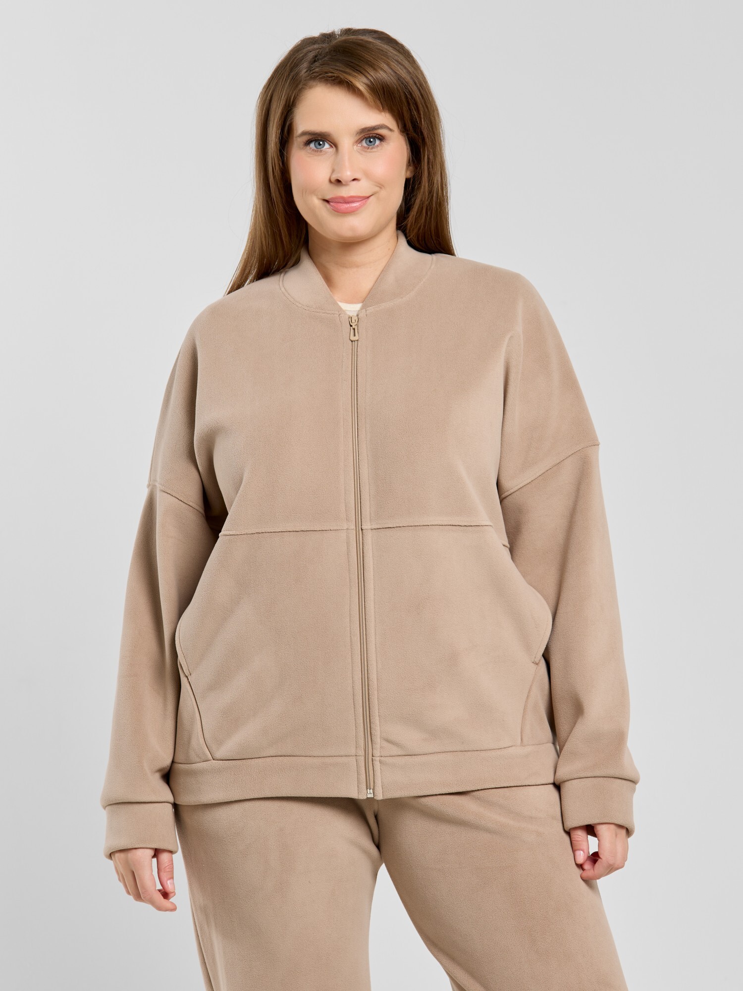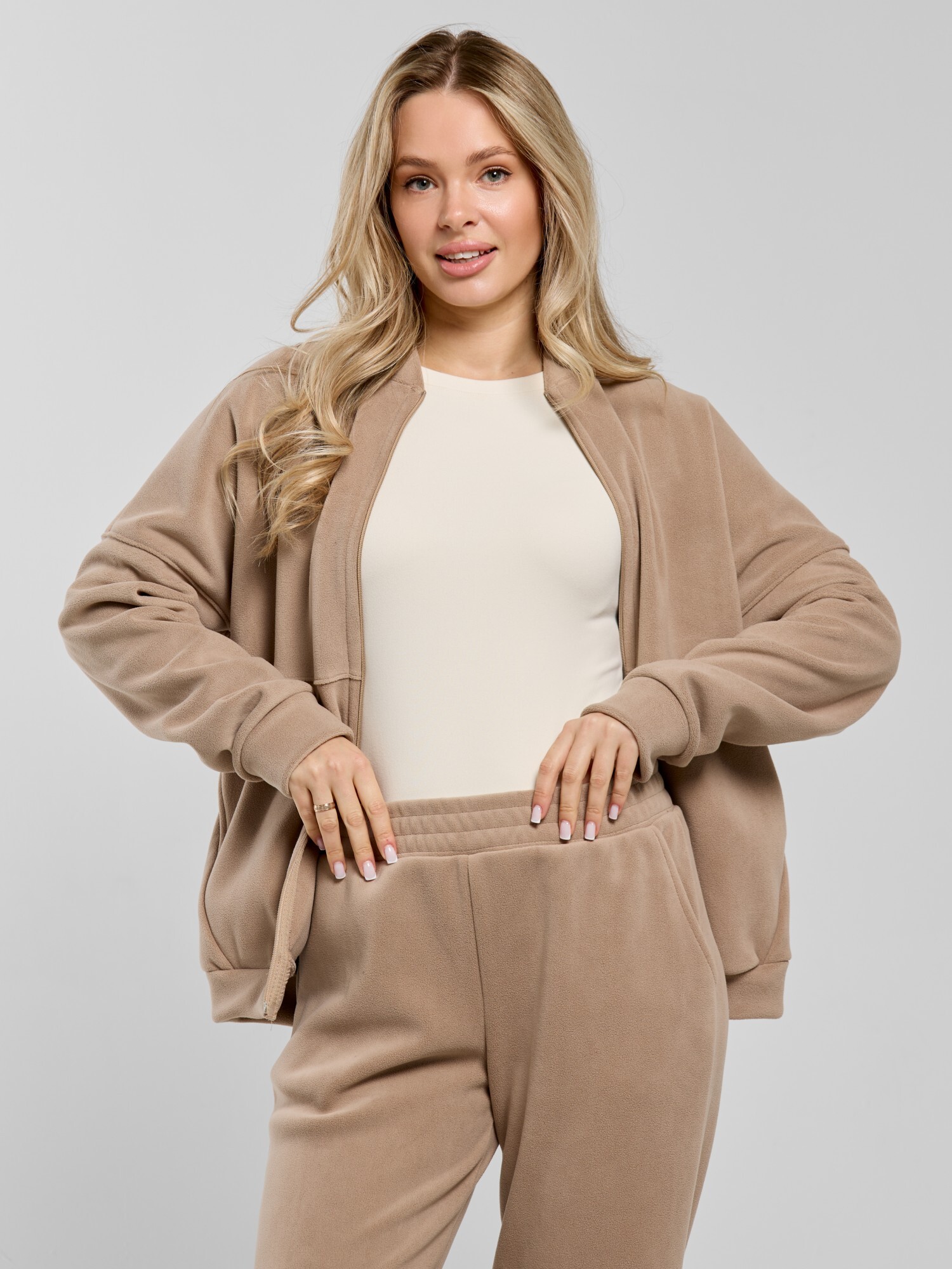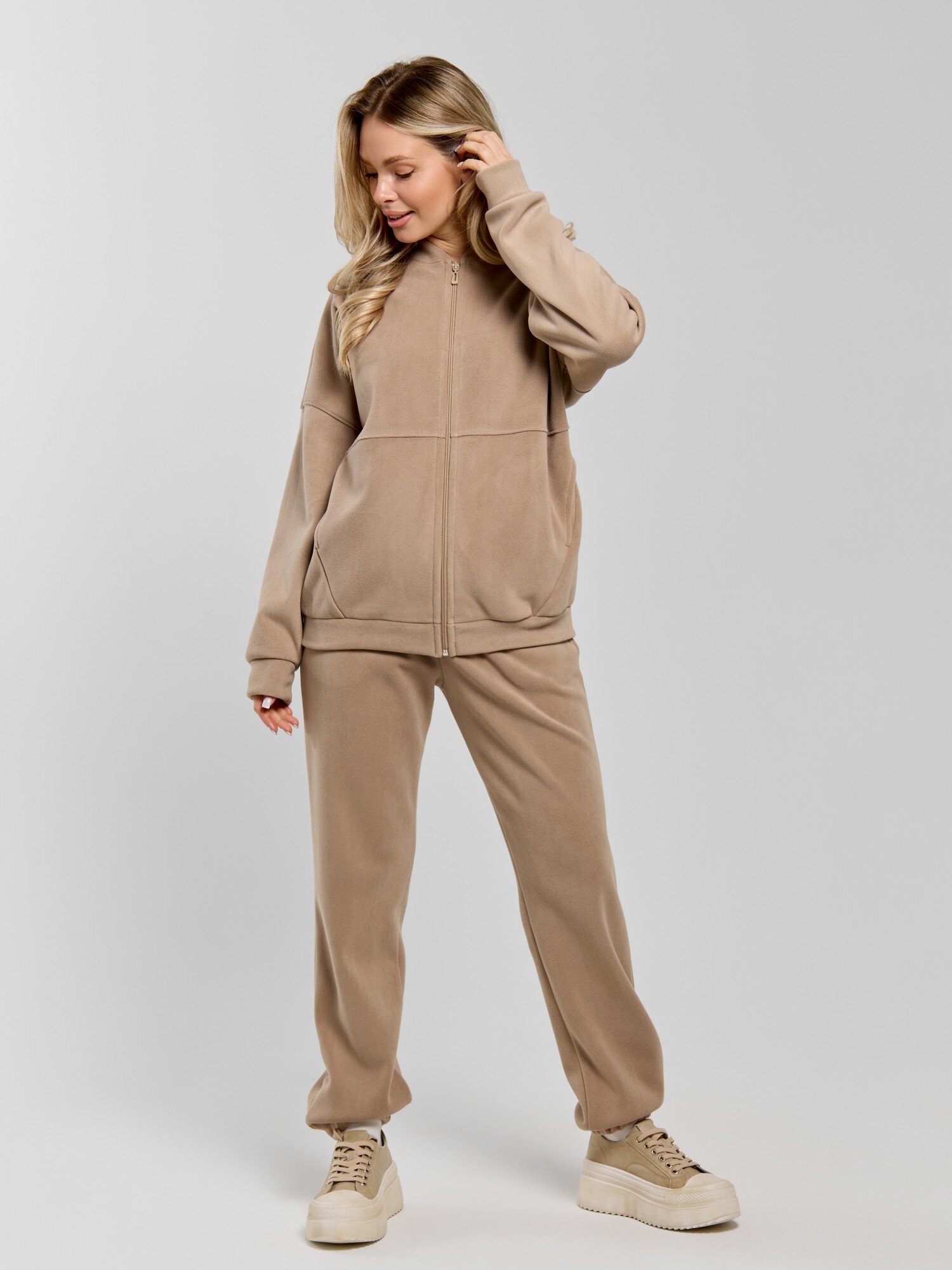 Куртка-бомбер – молодежная из гладкокрашенного трикотажного полотна «дабл-флис» (двухсторонний флис) прямого силуэта, свободная, с длинными втачными рукавами, горловиной овальной формы, обработанной втачной планкой, центральной бортовой застежкой на тесьму «молния». Полочка и спинка состоят из двух деталей, низ изделия с притачным поясом, рукава с притачными манжетами. Пояс, планка горловины, манжеты рукавов выполнены из основного материала.