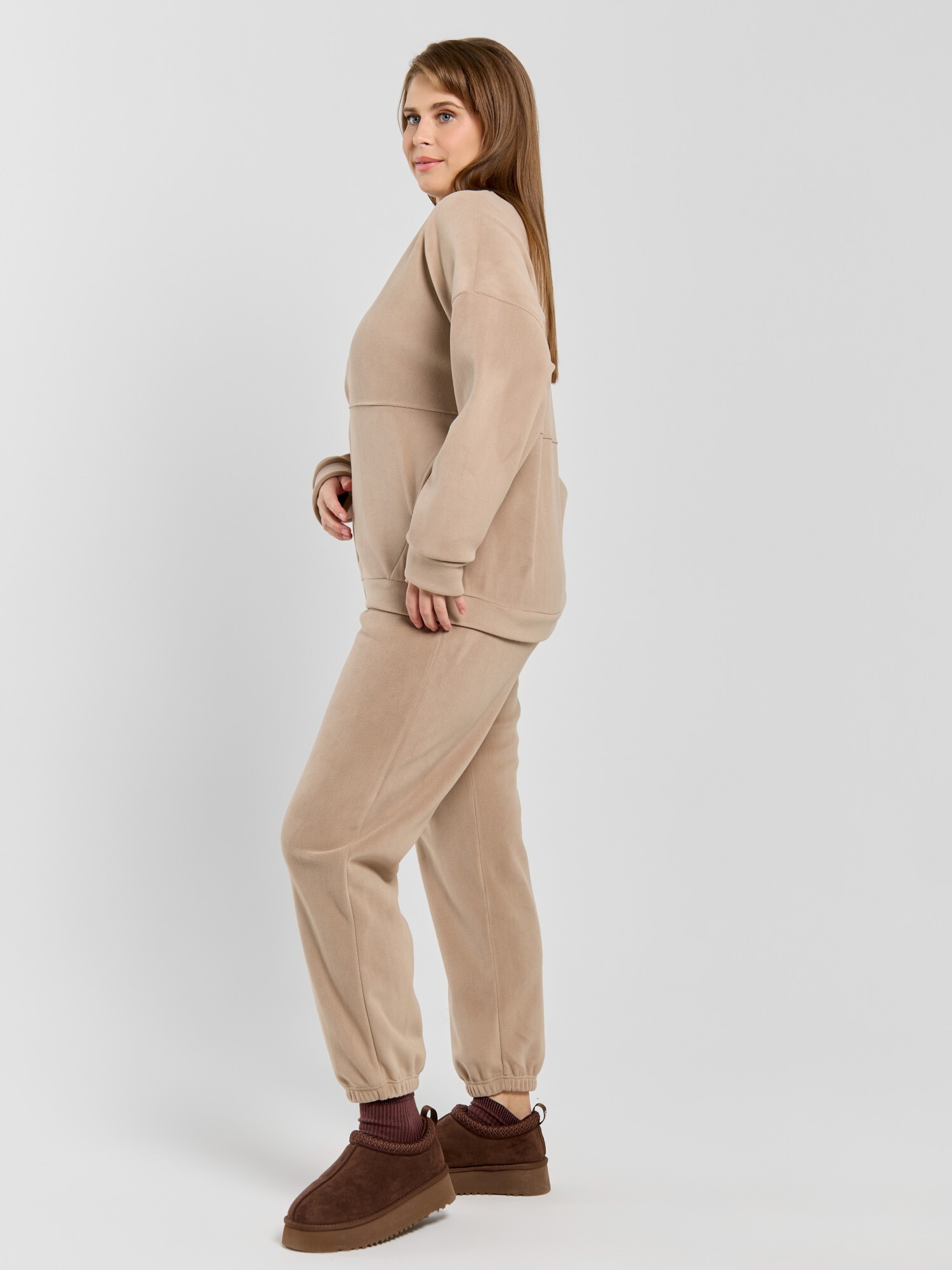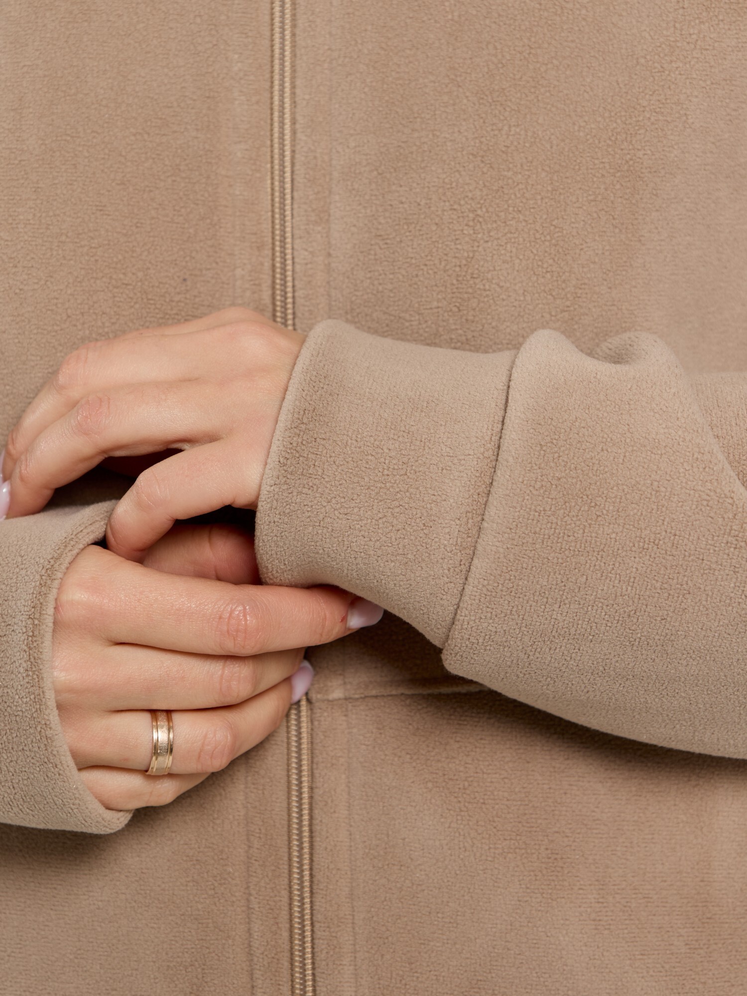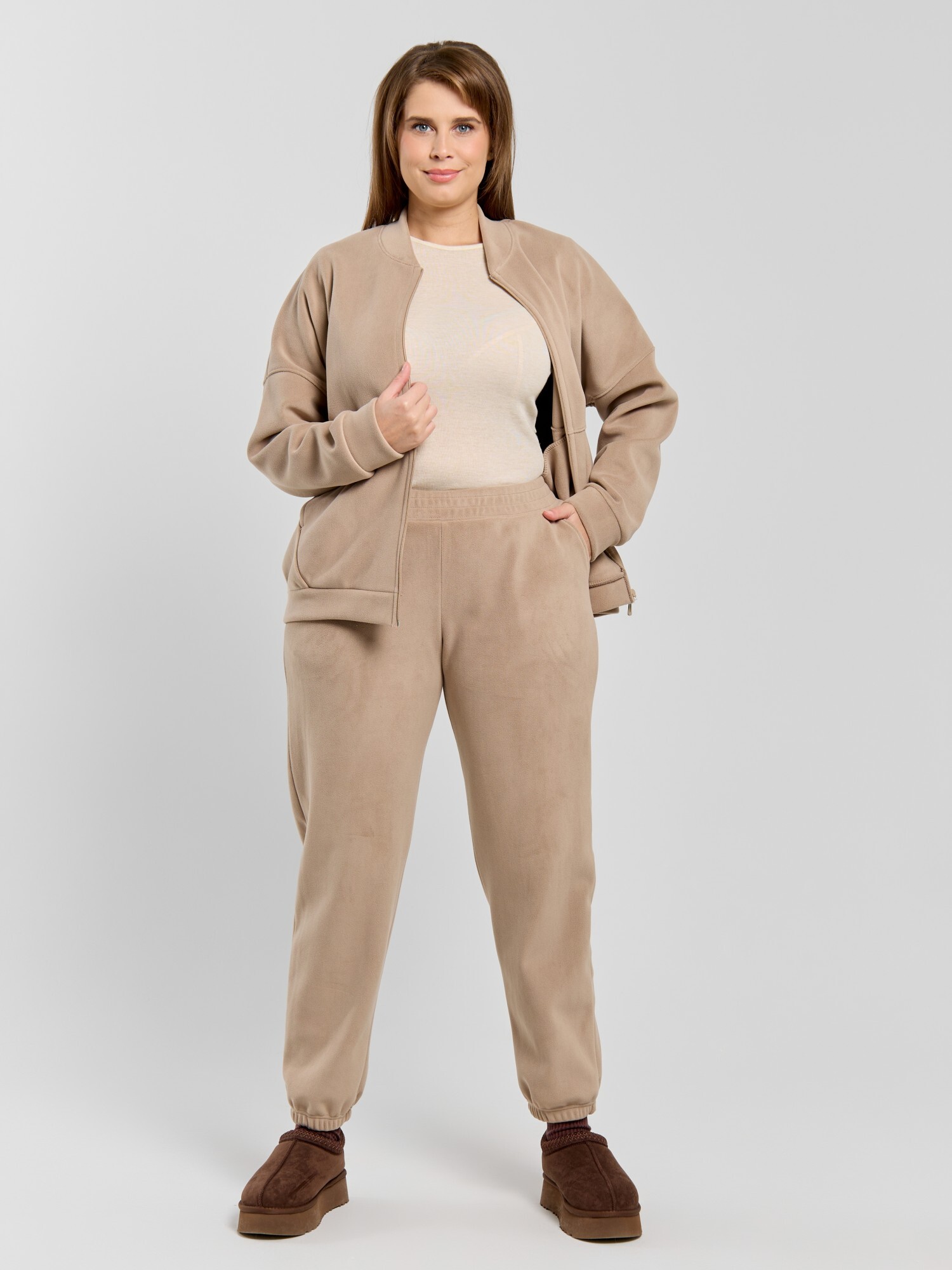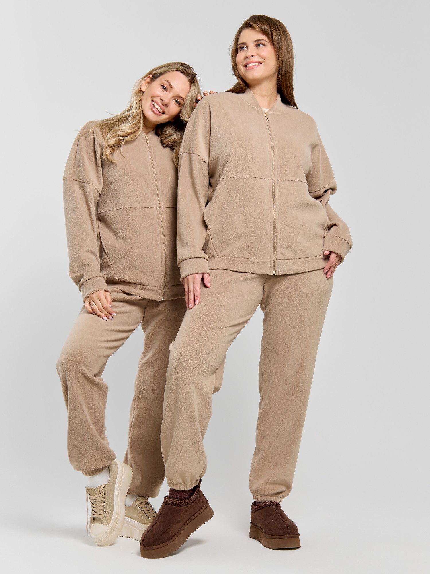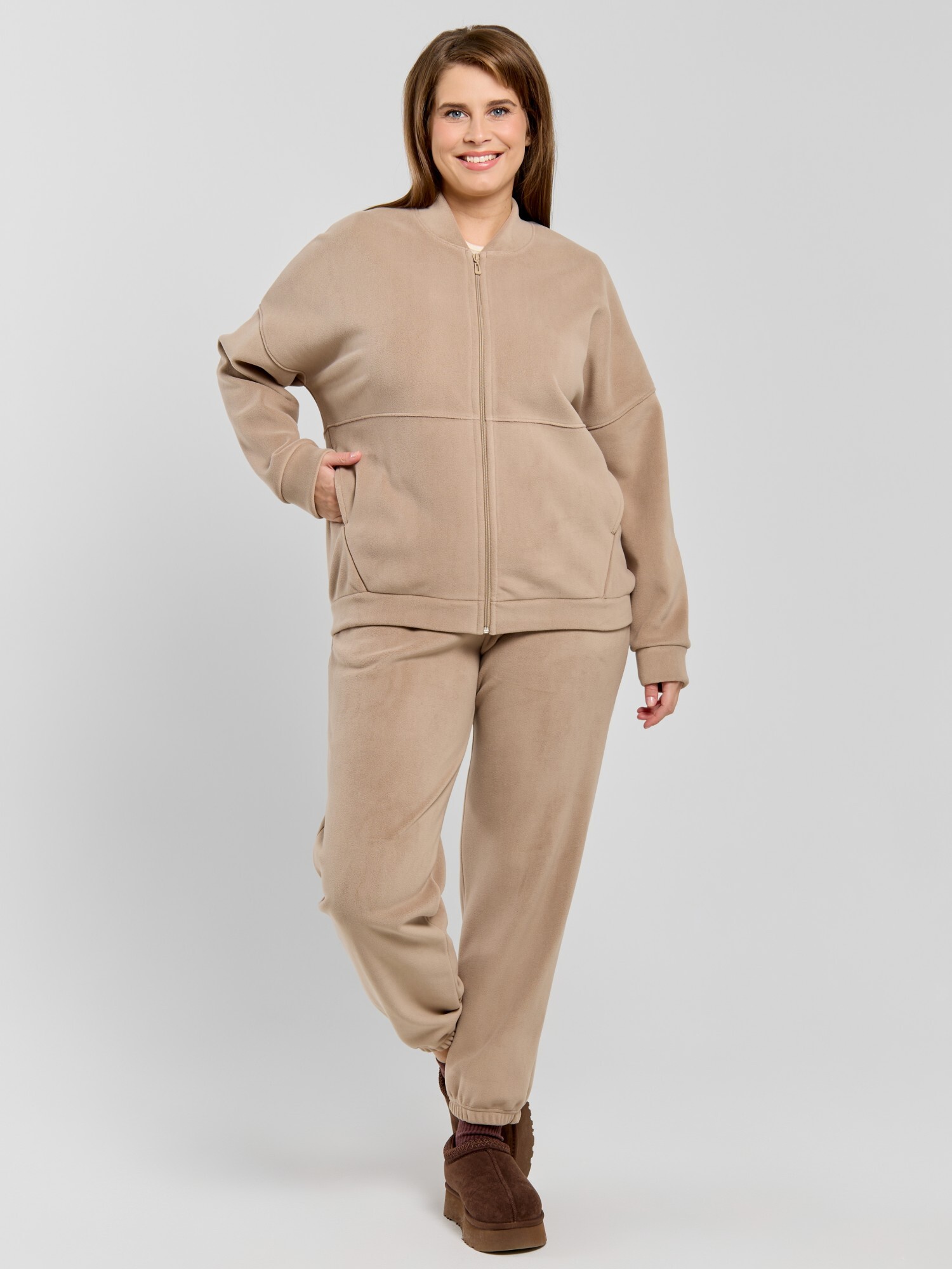 Куртка-бомбер – молодежная из гладкокрашенного трикотажного полотна «дабл-флис» (двухсторонний флис) прямого силуэта, свободная, с длинными втачными рукавами, горловиной овальной формы, обработанной втачной планкой, центральной бортовой застежкой на тесьму «молния». Полочка и спинка состоят из двух деталей, низ изделия с притачным поясом, рукава с притачными манжетами. Пояс, планка горловины, манжеты рукавов выполнены из основного материала.