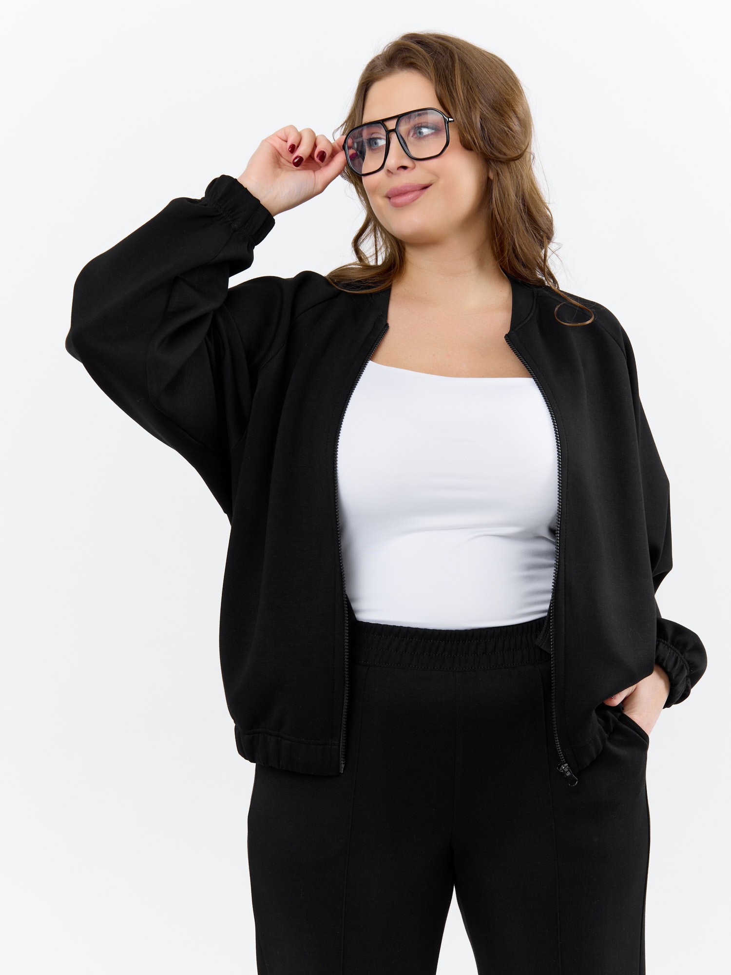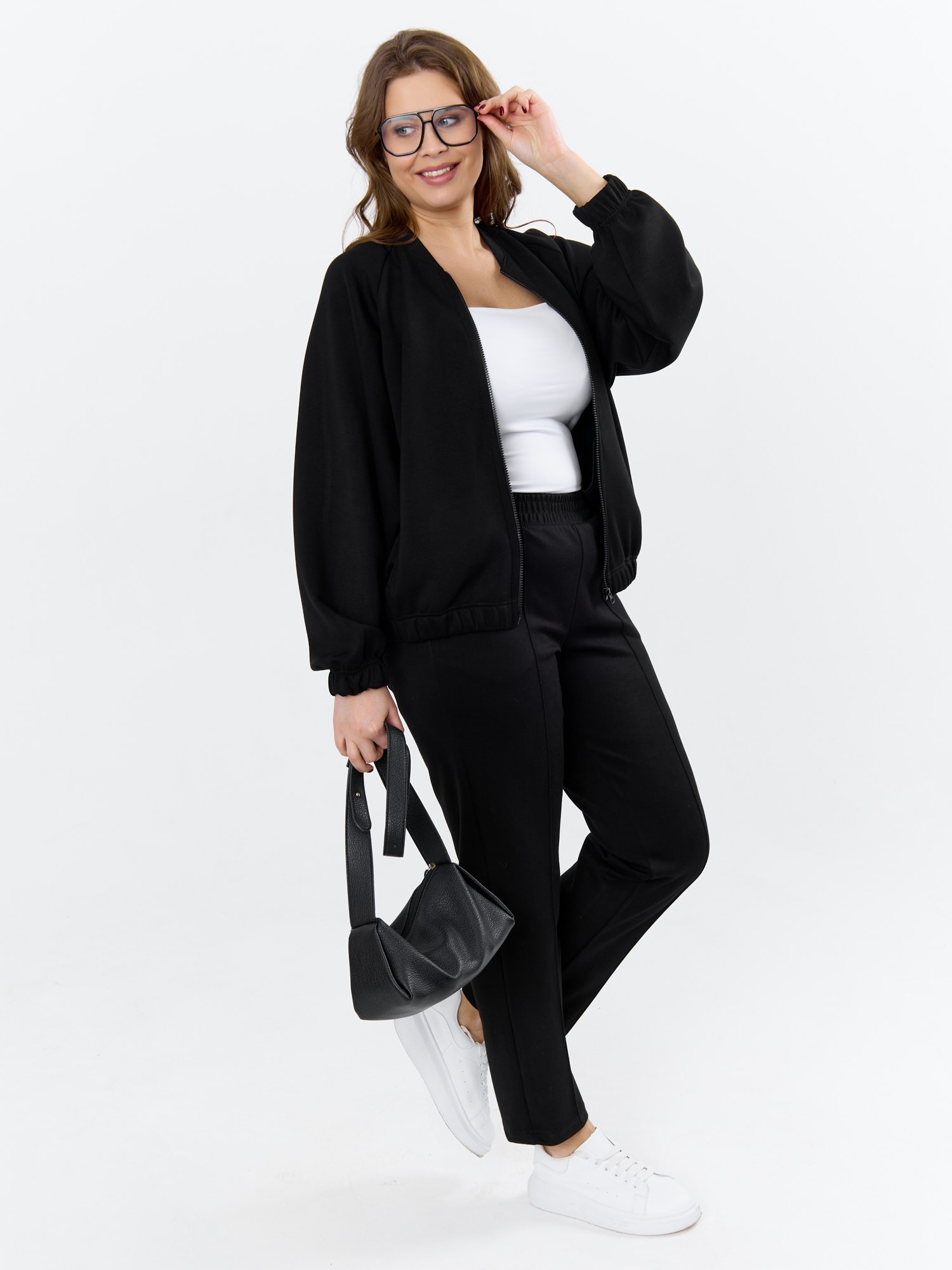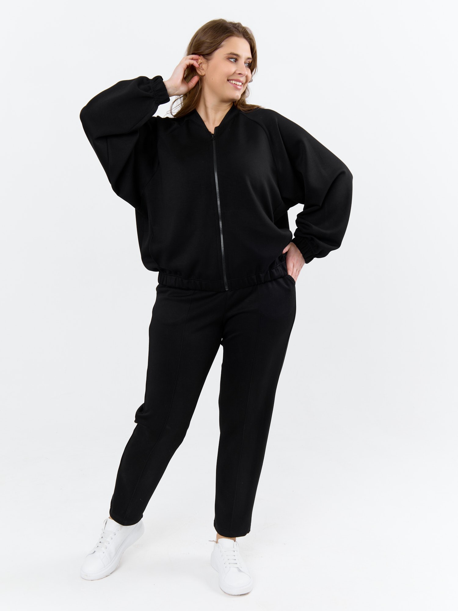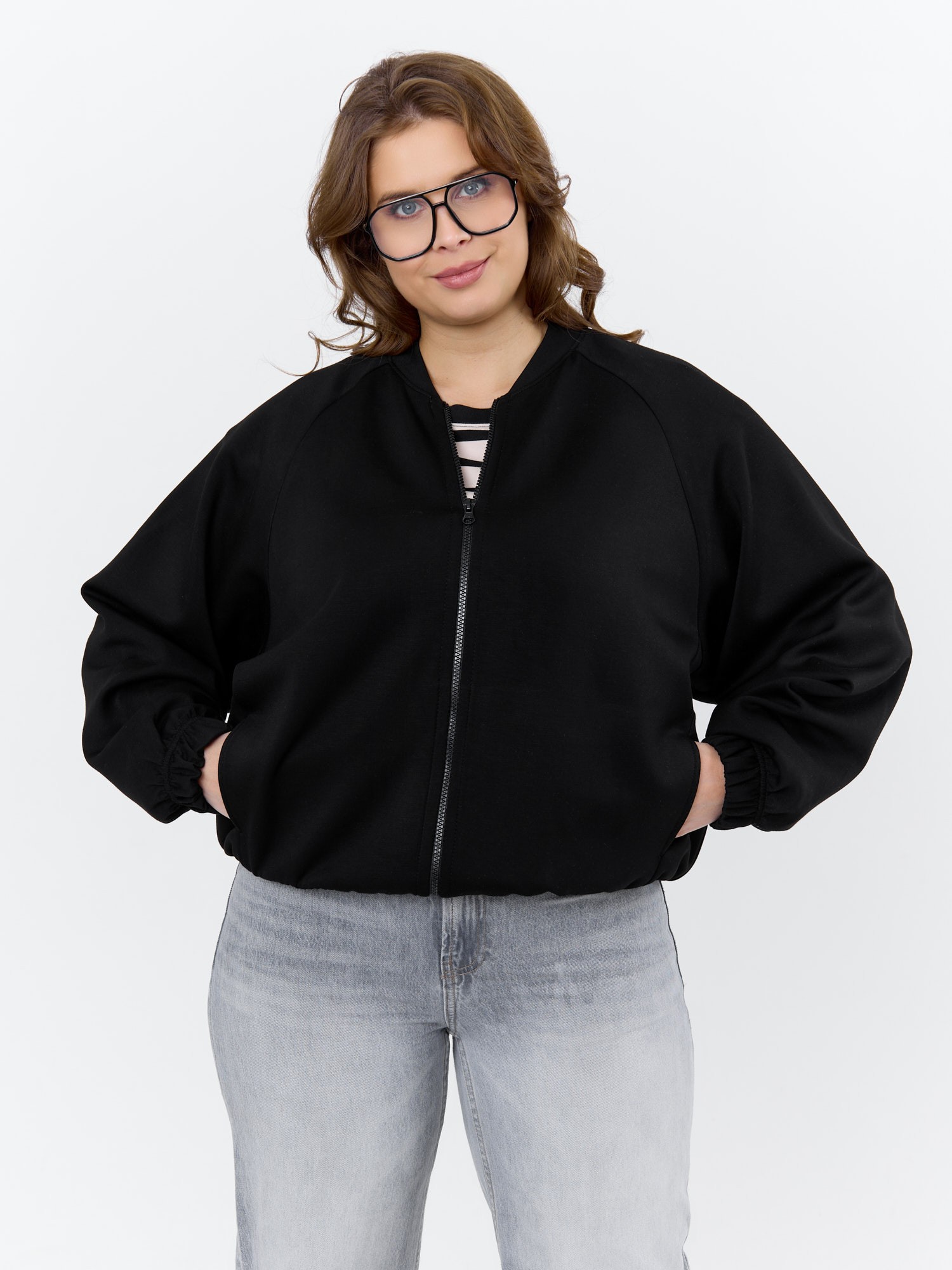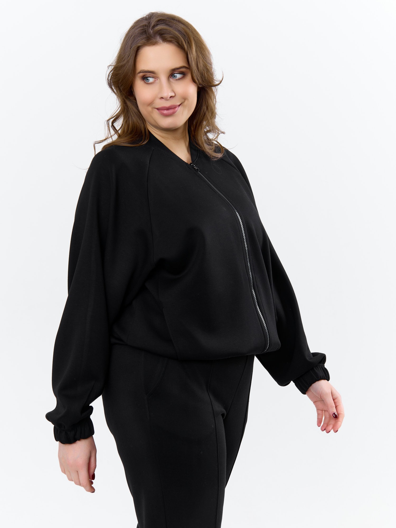 Куртка – бомбер женская из трикотажного гладкокрашенного полотна «скуба» свободная, с горловиной овальной формы обработанной втачной планкой, длинными рукавами кроя «реглан», обработанными подгибкой с эластичной тесьмой внутри, центральной бортовой застежкой на тесьму «молния». На полочке в рельефных швах выполнены карманы. Низ изделия обработан подгибкой с широкой эластичной тесьмой внутри.