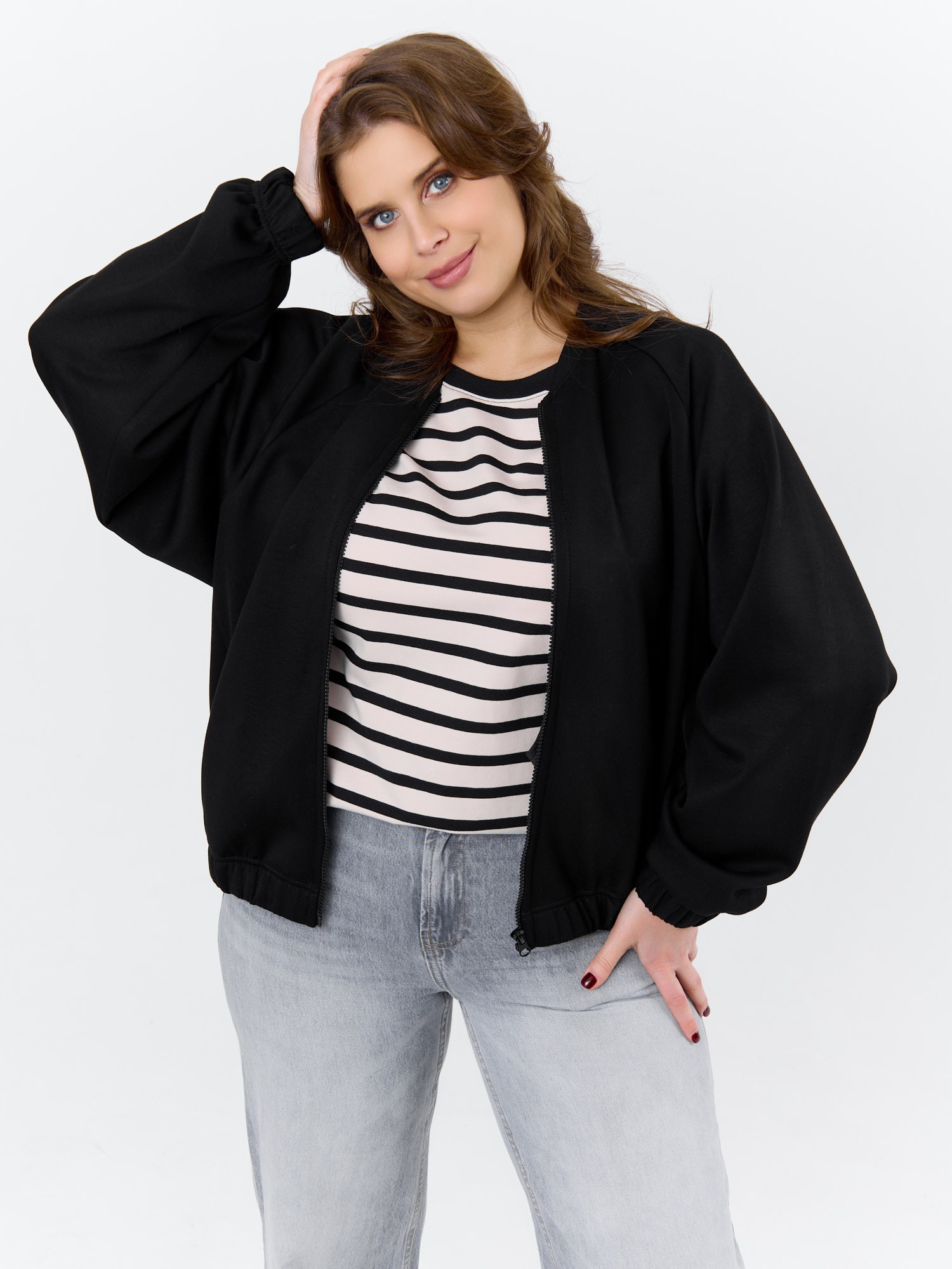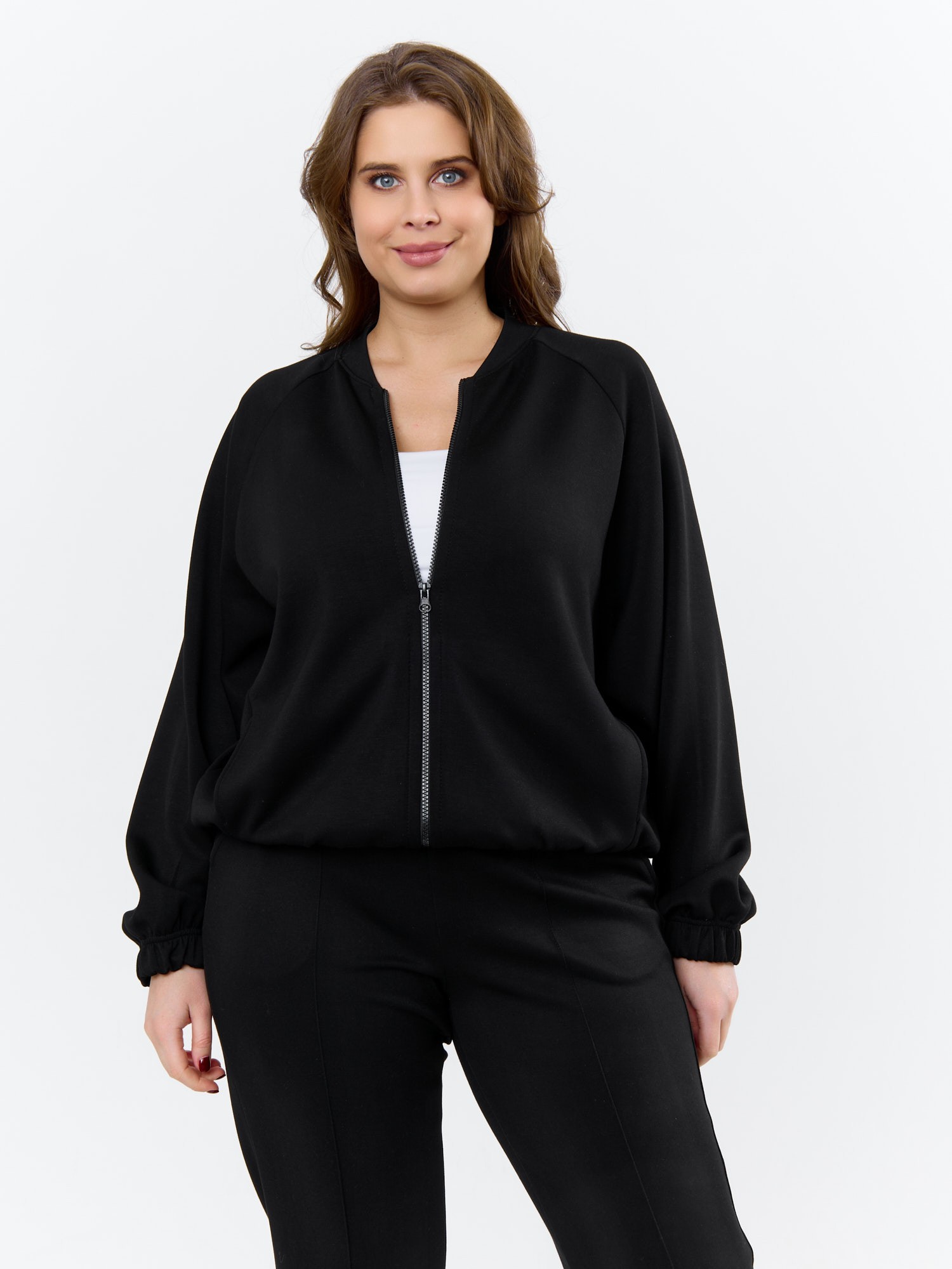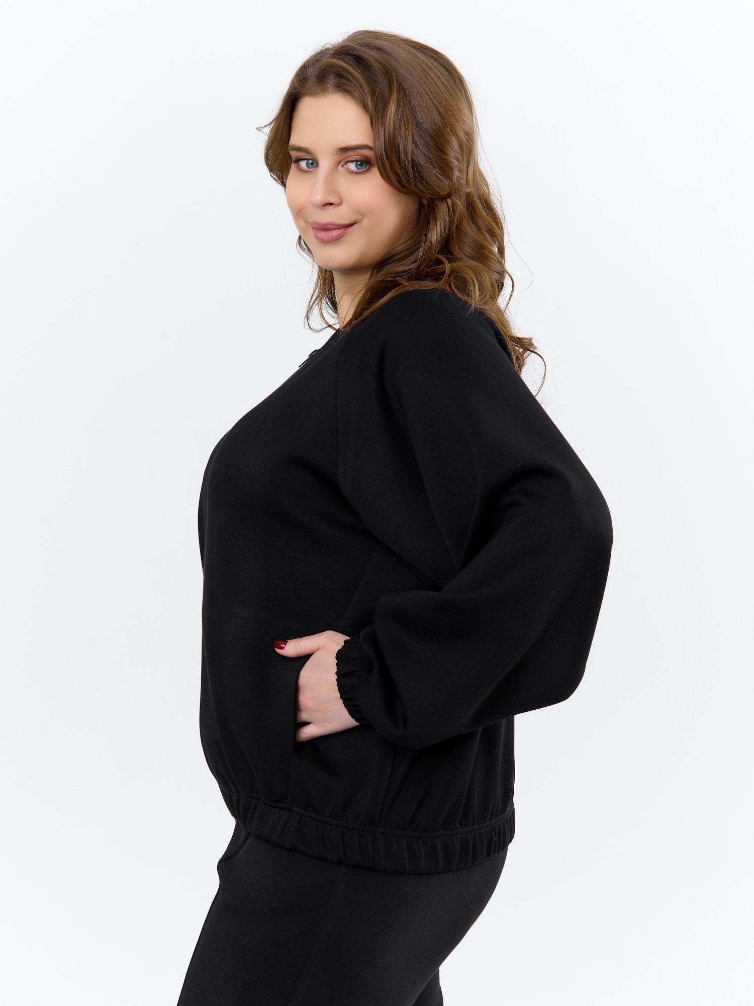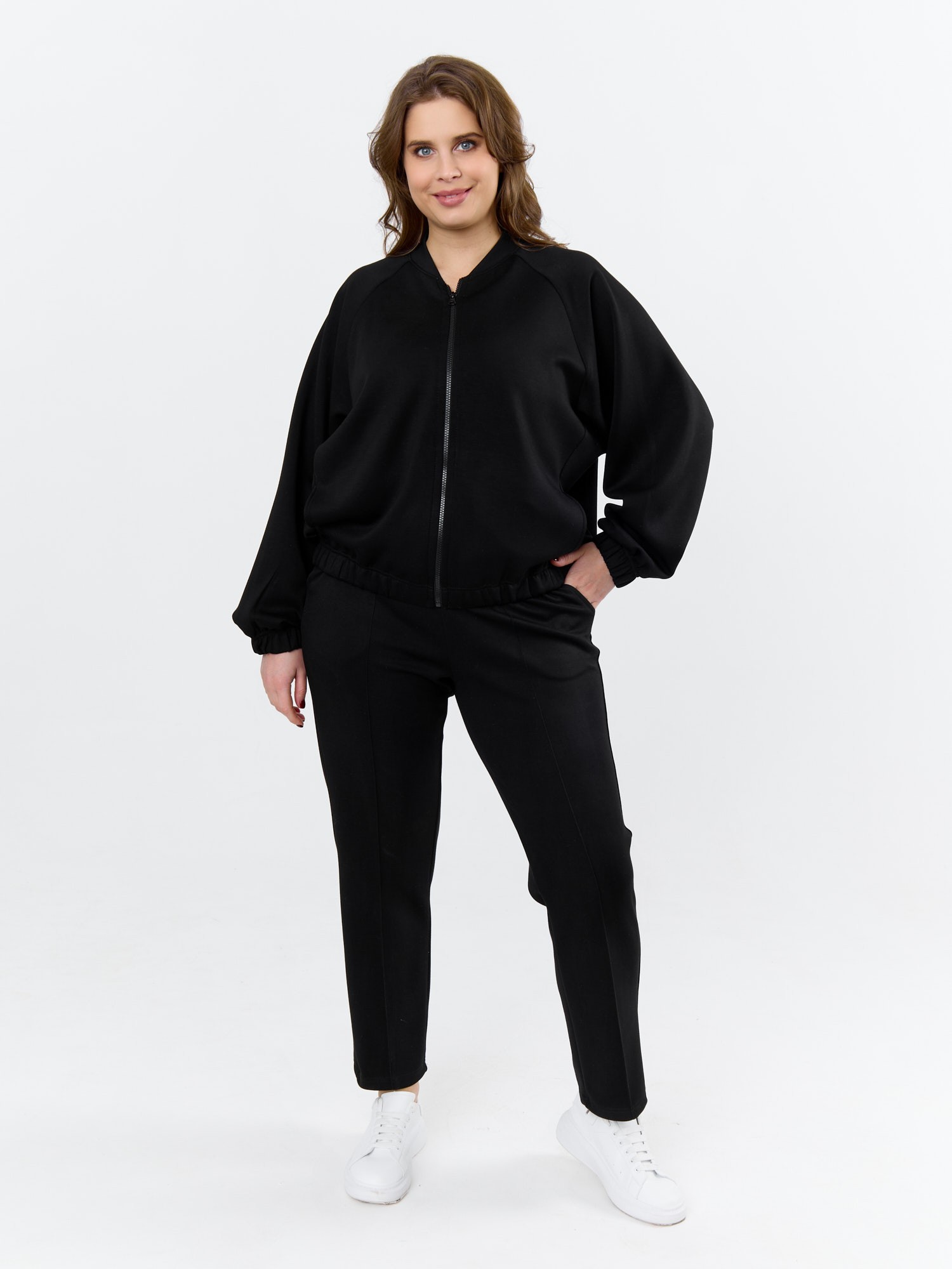 Куртка – бомбер женская из трикотажного гладкокрашенного полотна «скуба» свободная, с горловиной овальной формы обработанной втачной планкой, длинными рукавами кроя «реглан», обработанными подгибкой с эластичной тесьмой внутри, центральной бортовой застежкой на тесьму «молния». На полочке в рельефных швах выполнены карманы. Низ изделия обработан подгибкой с широкой эластичной тесьмой внутри.