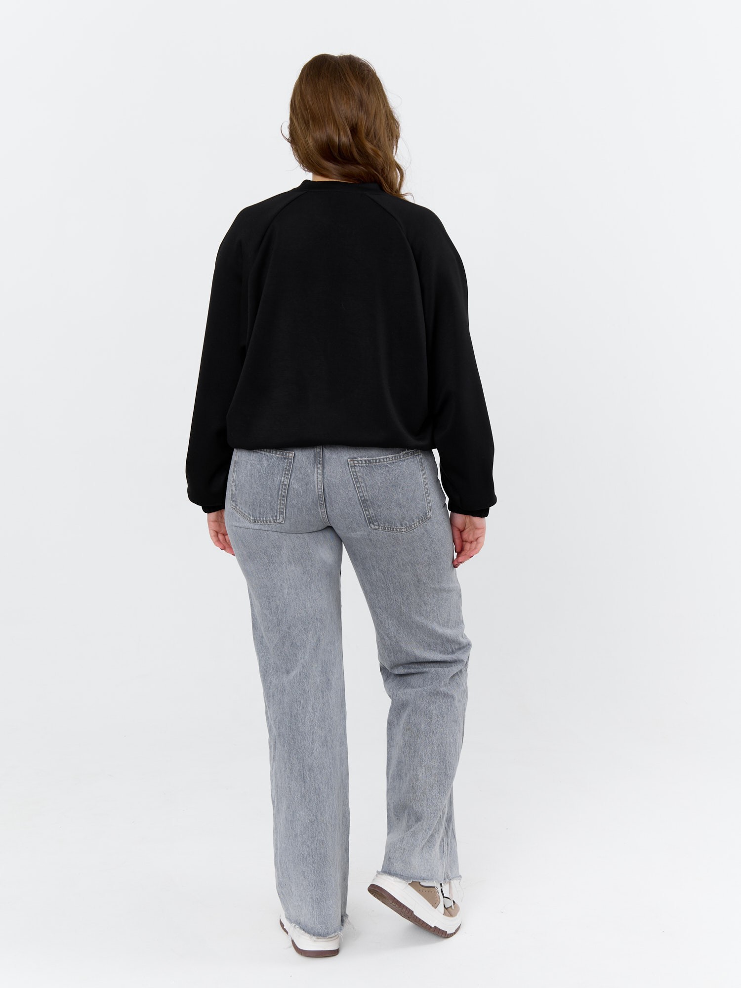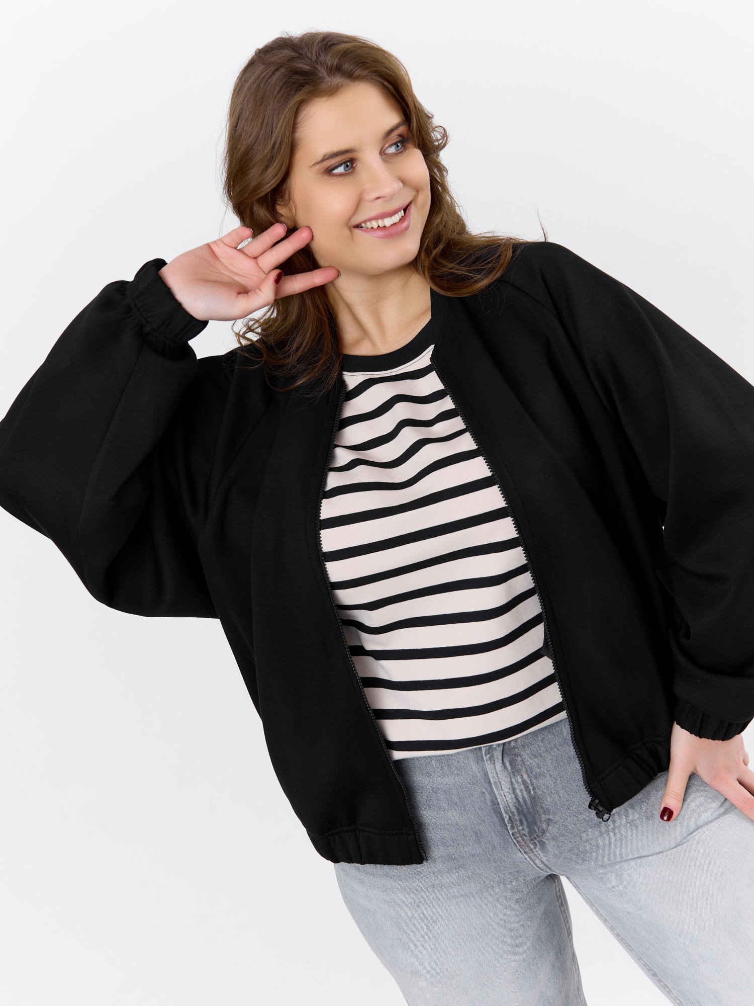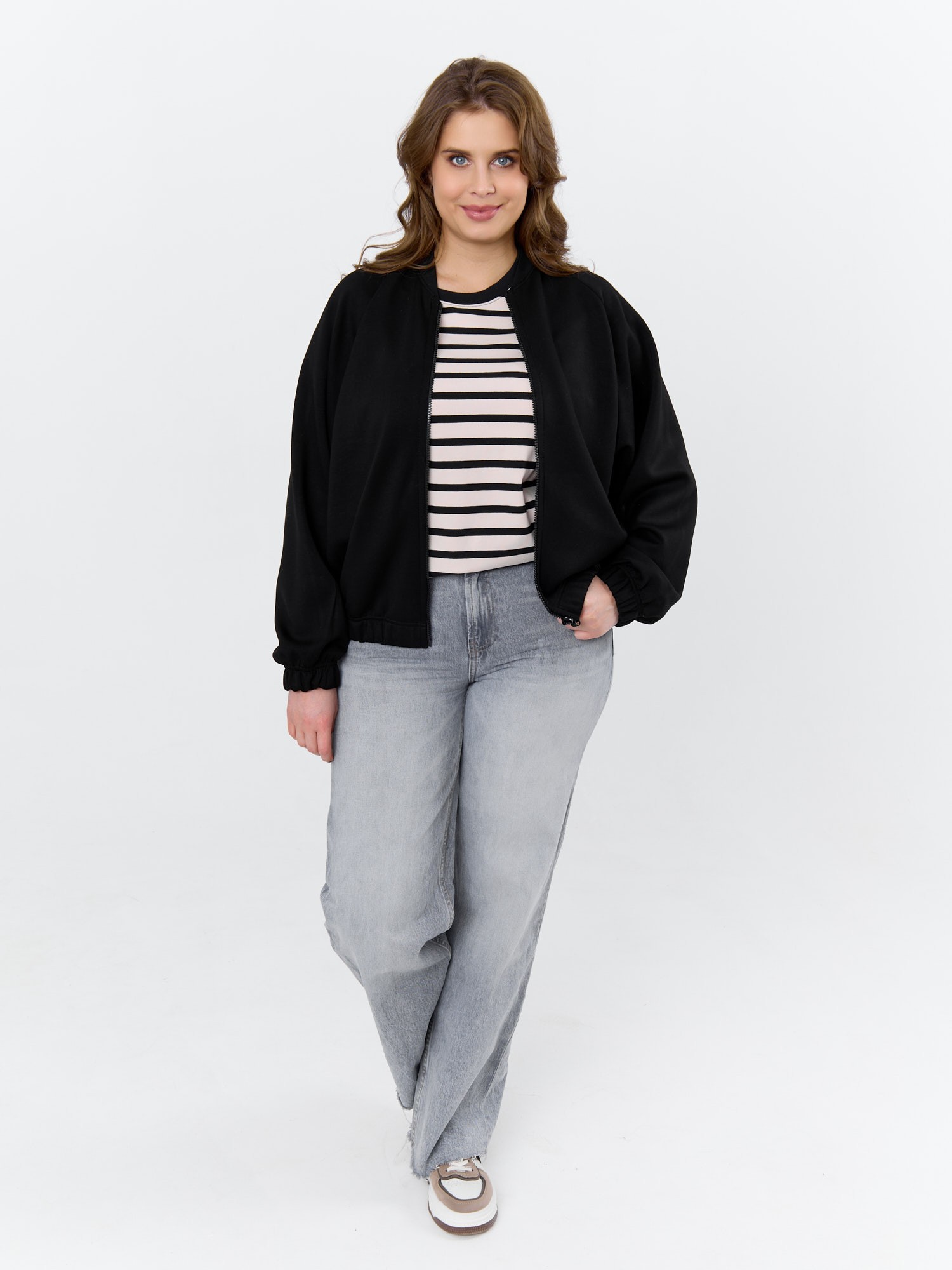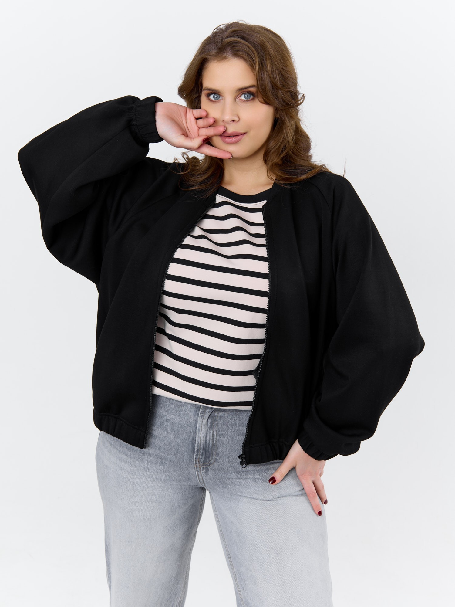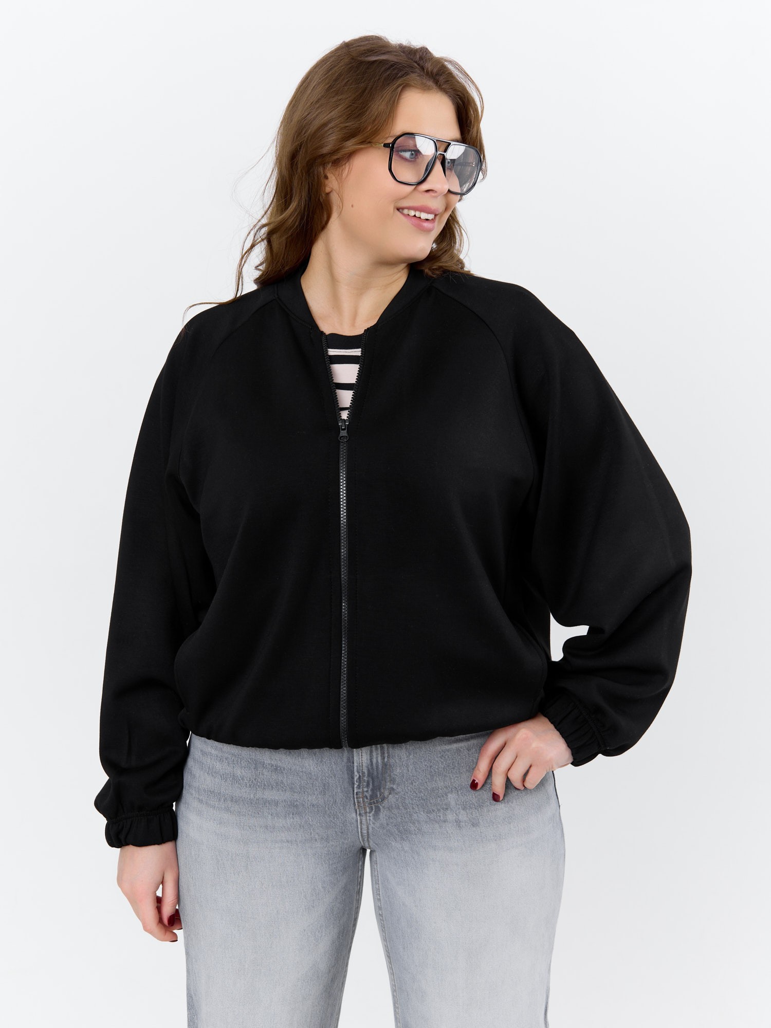 Куртка – бомбер женская из трикотажного гладкокрашенного полотна «скуба» свободная, с горловиной овальной формы обработанной втачной планкой, длинными рукавами кроя «реглан», обработанными подгибкой с эластичной тесьмой внутри, центральной бортовой застежкой на тесьму «молния». На полочке в рельефных швах выполнены карманы. Низ изделия обработан подгибкой с широкой эластичной тесьмой внутри.