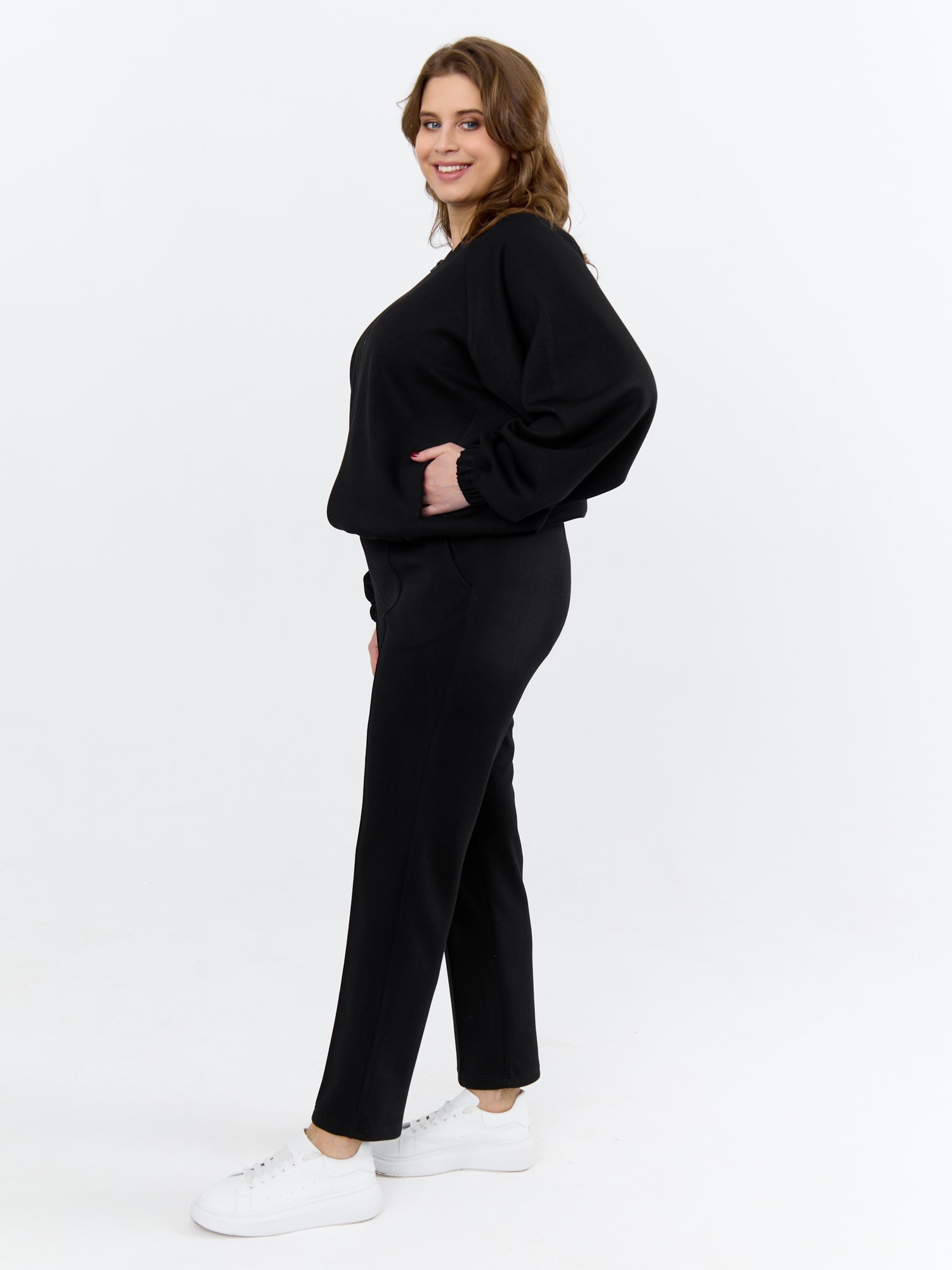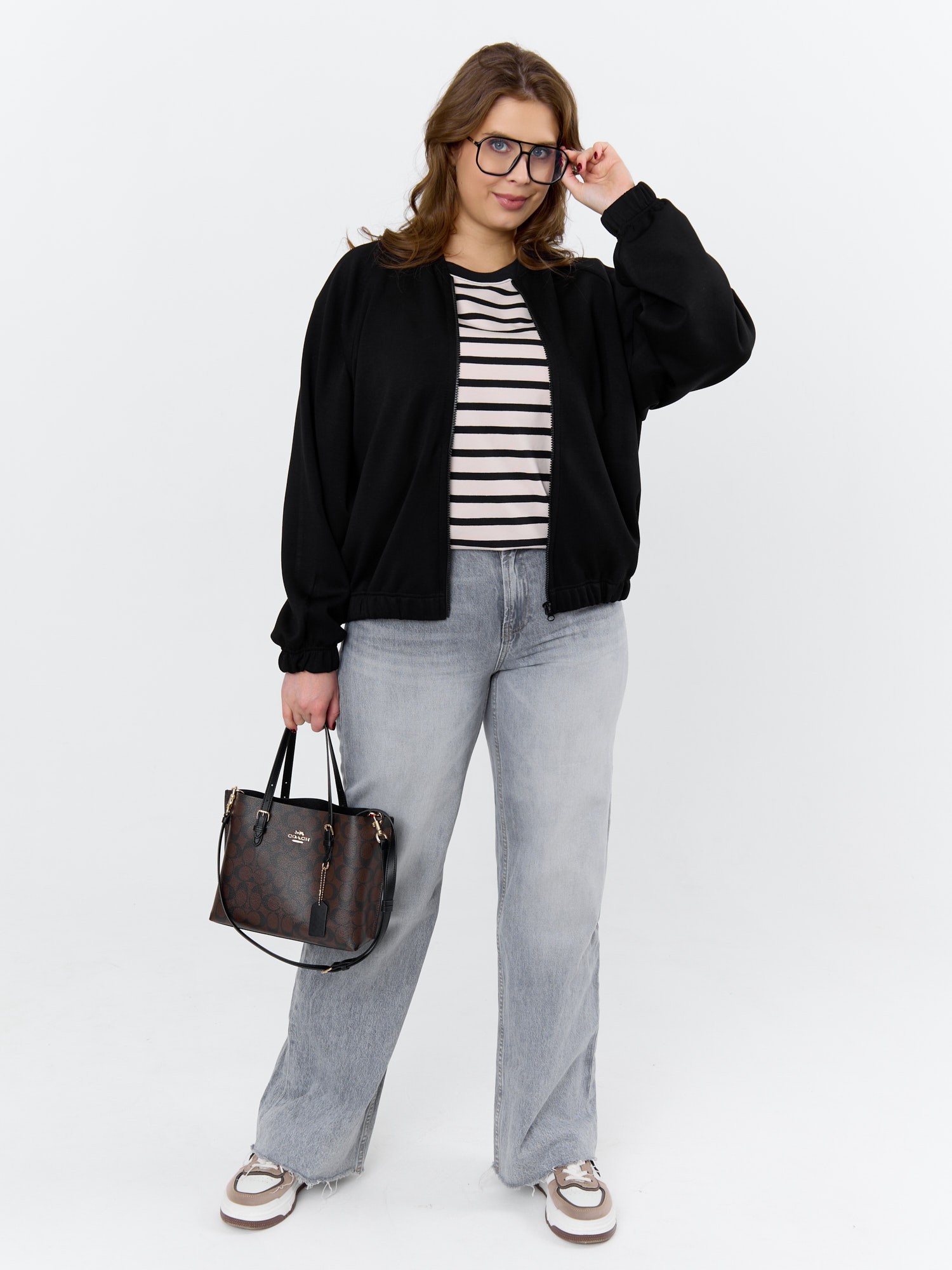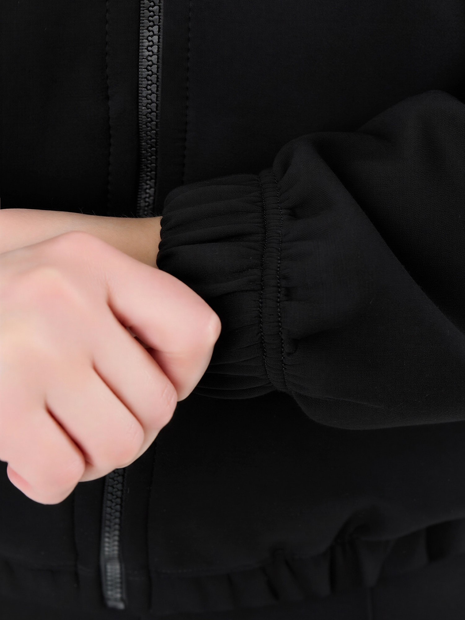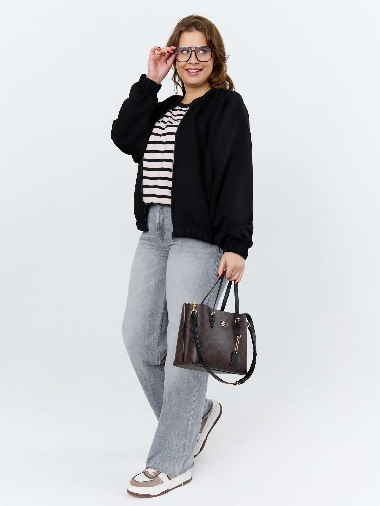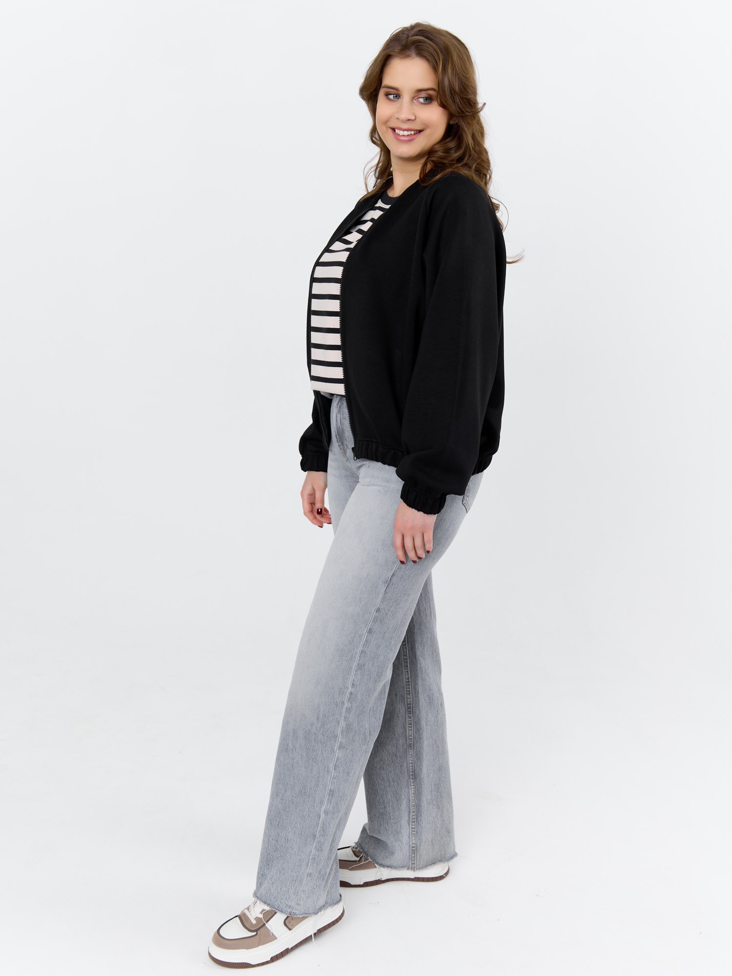 Куртка – бомбер женская из трикотажного гладкокрашенного полотна «скуба» свободная, с горловиной овальной формы обработанной втачной планкой, длинными рукавами кроя «реглан», обработанными подгибкой с эластичной тесьмой внутри, центральной бортовой застежкой на тесьму «молния». На полочке в рельефных швах выполнены карманы. Низ изделия обработан подгибкой с широкой эластичной тесьмой внутри.