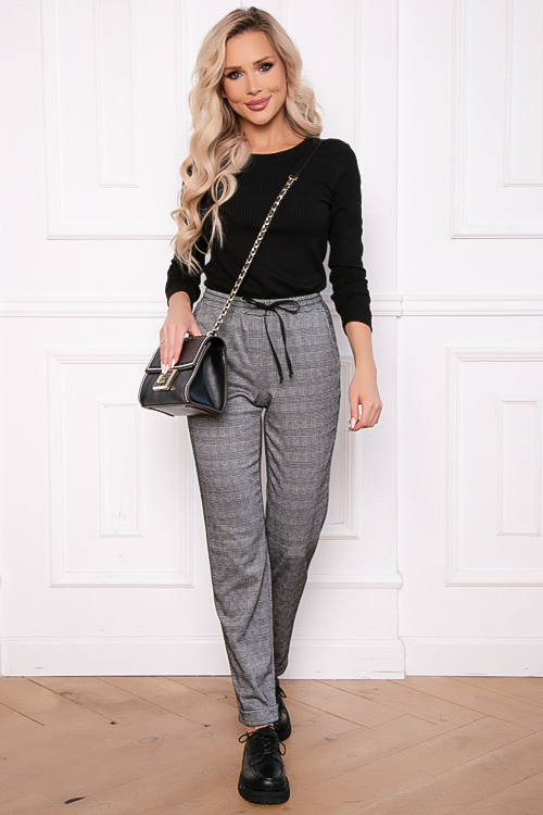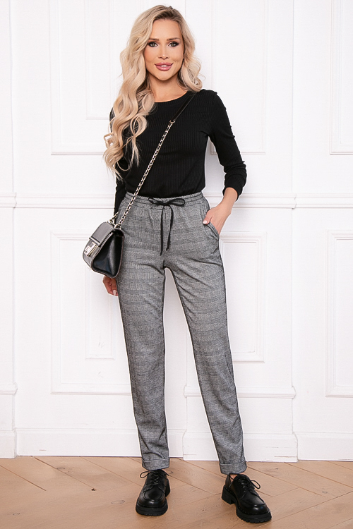 Комфортные брюки из трикотажного полотна в клетку.В боковых швах функциональные карманы,удобную посадку по талии обеспечивает эластичный пояс на резинке с кулиской.