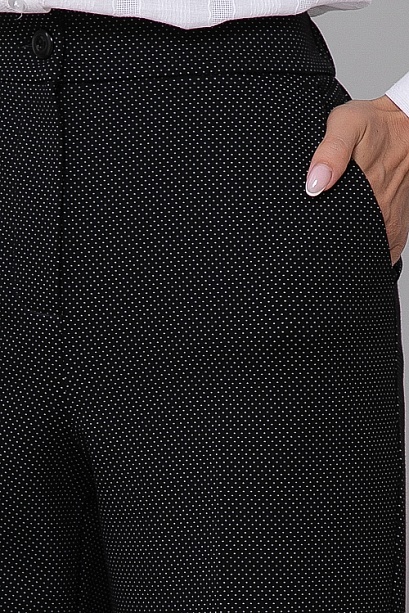 Брюки из плотного хорошо держащего форму жаккардового трикотажного полотна черного цвета в мелкую крапинку.(ткань производство Турция) с заутюженными стрелками.Брюки с высокой посадкой по талии застегивающиеся на молнию в гульфике.Пояс притачной с застежкой на пуговицу.Для удобства в носке пояс по спинке собран на резину.По бокам подрезные функциональные карманы.