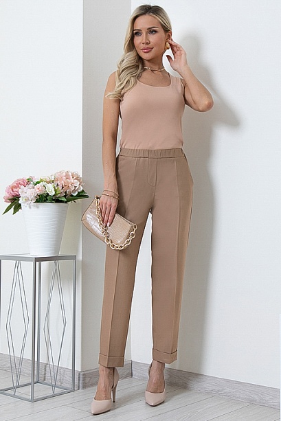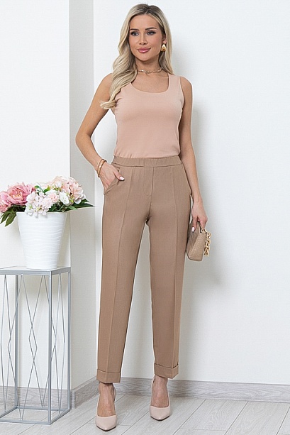 Брюки из вискозной костюмной ткани со средней посадкой зауженные к низу, с заутюженными стрелками. Без застежки, с имитацией гульфика, пояс на эластичной резине. По бокам карманы.