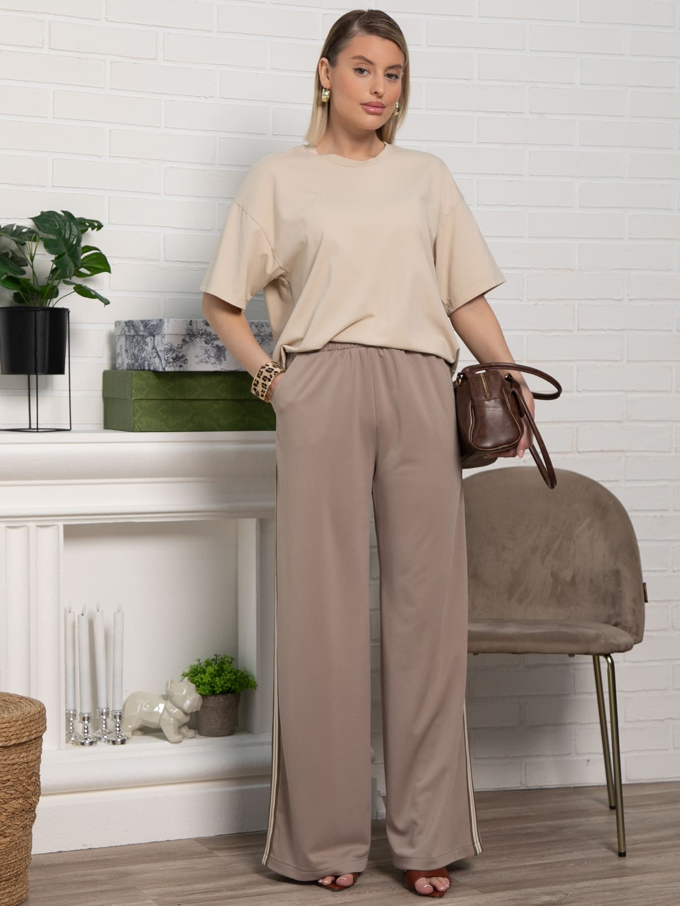 Стильные брюки палаццо с широкой свободной посадкой обеспечивают максимальный комфорт и элегантность. Эластичная резинка на поясе гарантирует удобную посадку, а практичные боковые карманы добавляют функциональности. По бокам проходят контрастные лампасы, которые придают модели модный спортивный акцент и визуально удлиняют силуэт. Идеальный выбор для создания стильных и комфортных образов на каждый день.