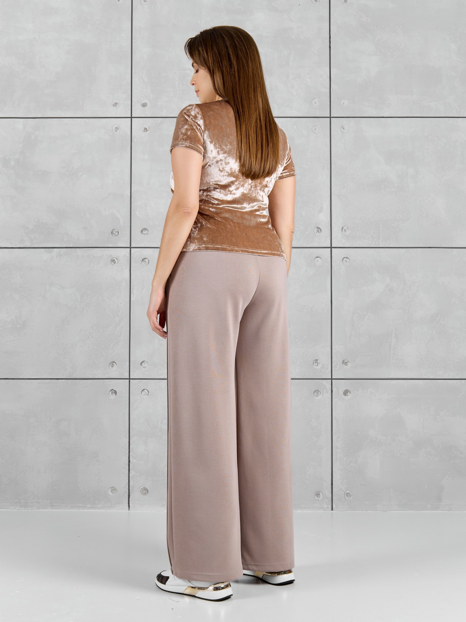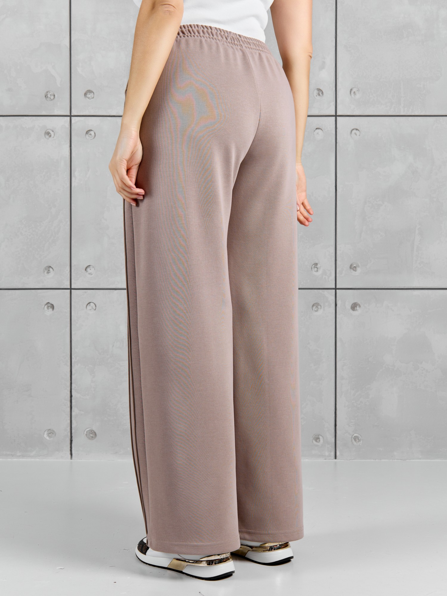 Брюки женские из гладкокрашенного трикотажного полотна «лининг» прямого кроя, длинные, свободные, расширенные к низу, на поясе с эластичной тесьмой внутри, карманами в боковых швах. Передние половины застрочены двумя параллельными линиями, смещенными к боковым швам.