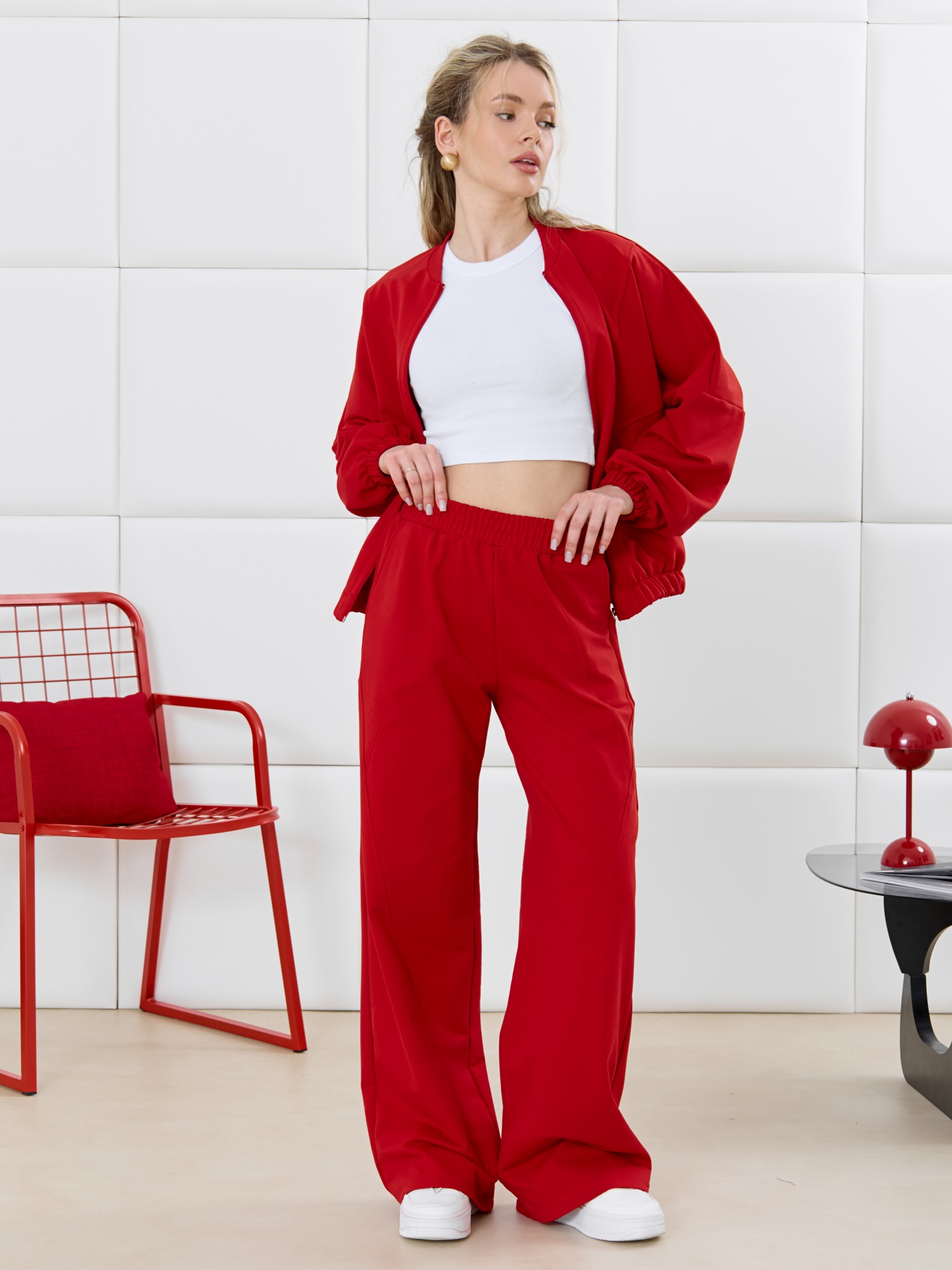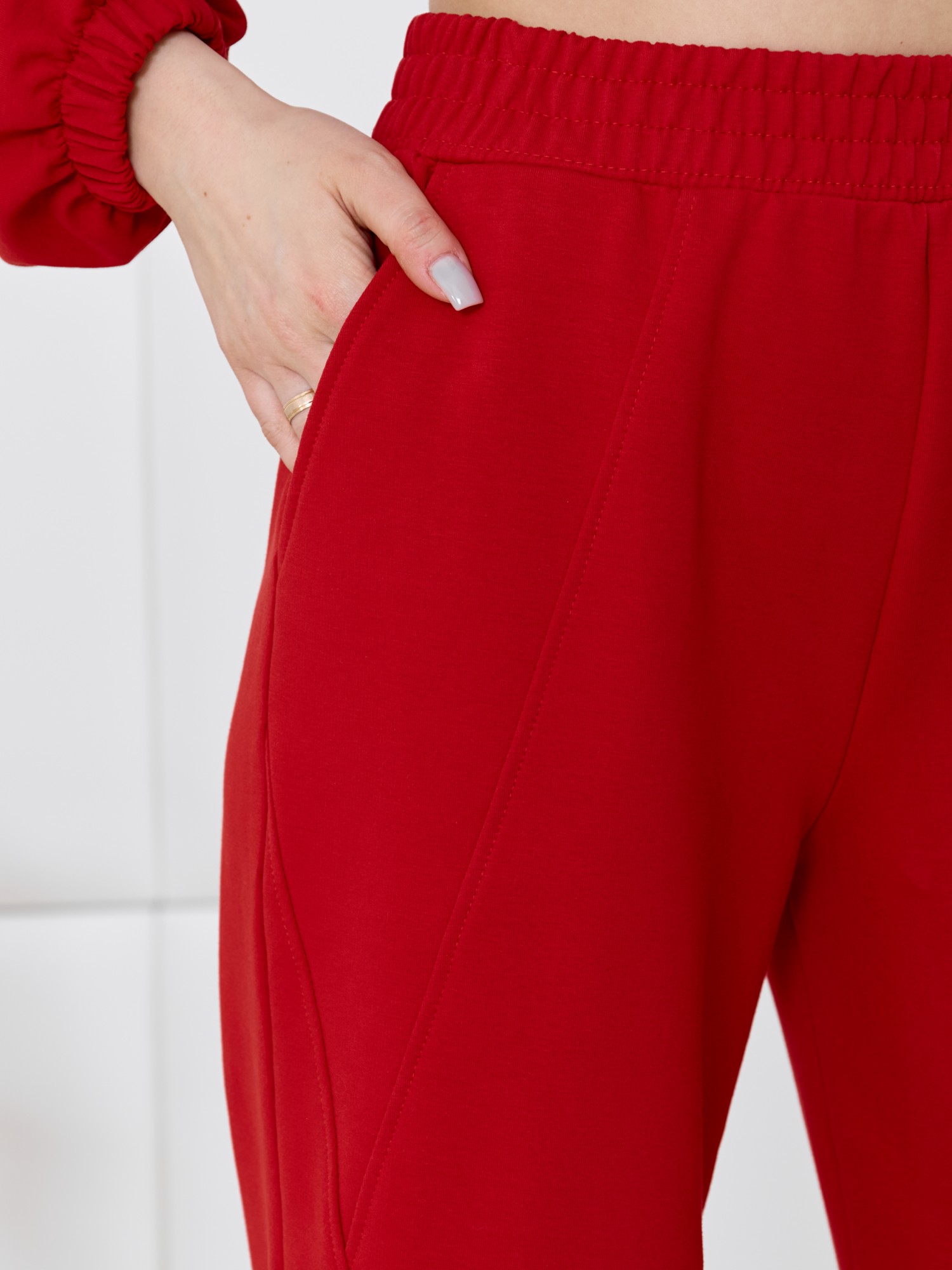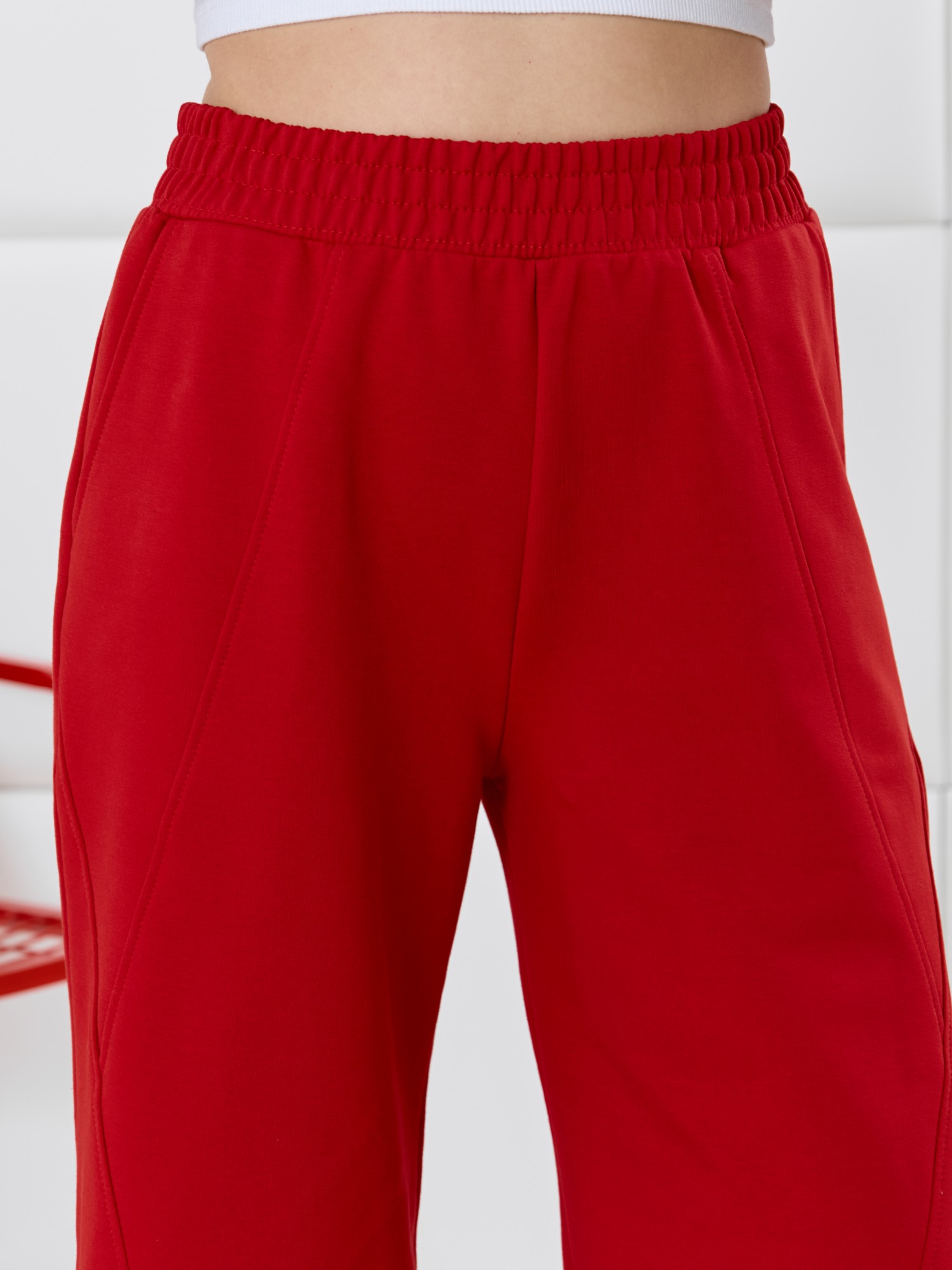 Брюки молодежные из трикотажного гладкокрашенного полотна «футер», длинные, на притачном поясе с эластичной тесьмой внутри, с карманами в боковых швах. Правая и левая половины брюк состоят из трех частей, скроенных по косой, с отделочными строчками по шву стачивания.
